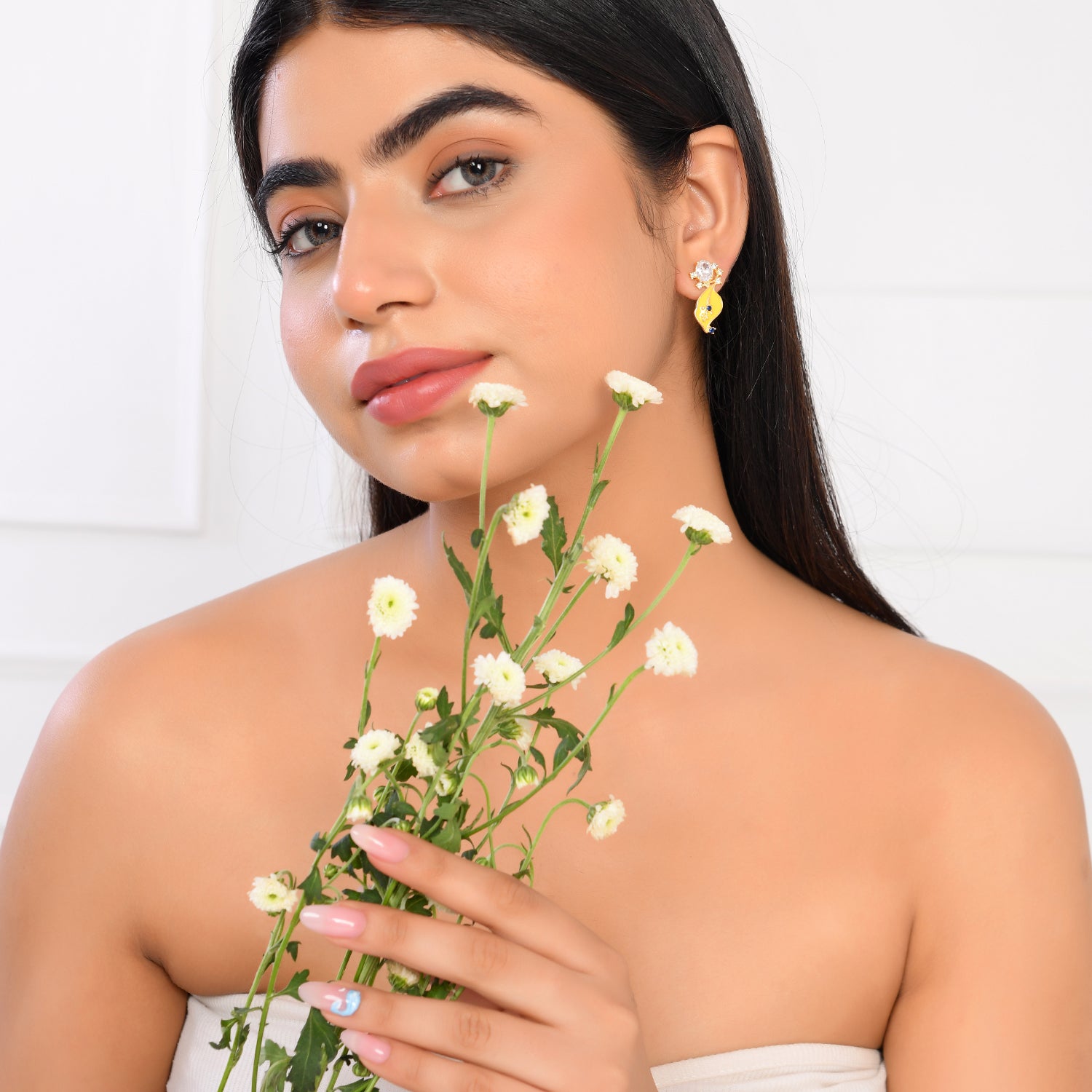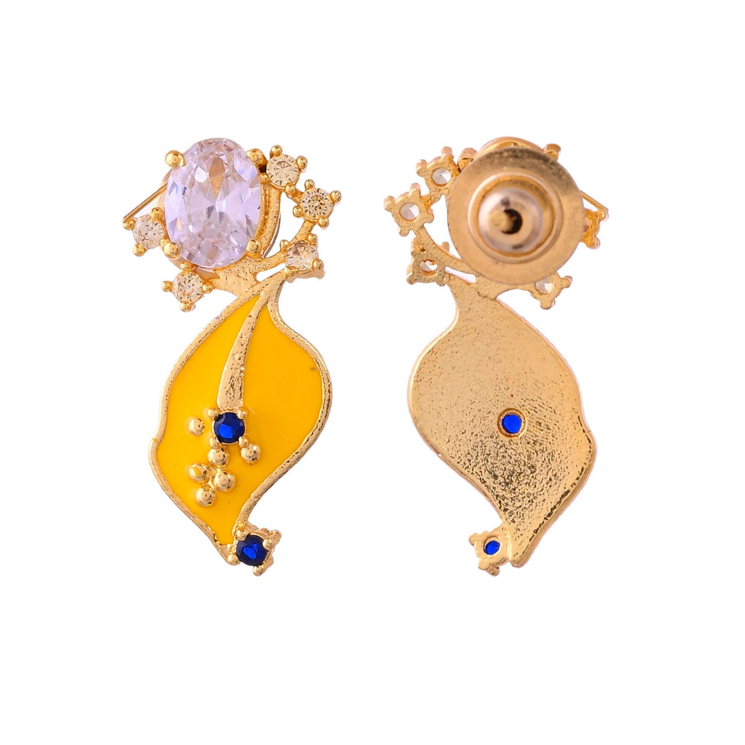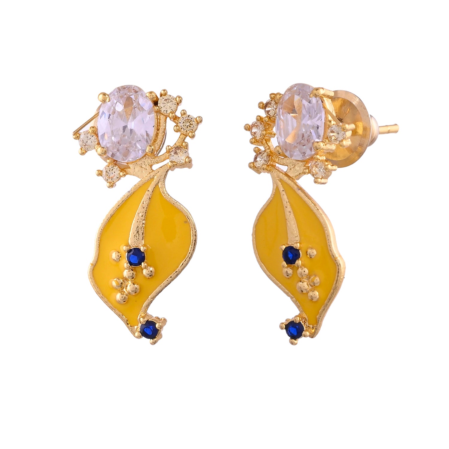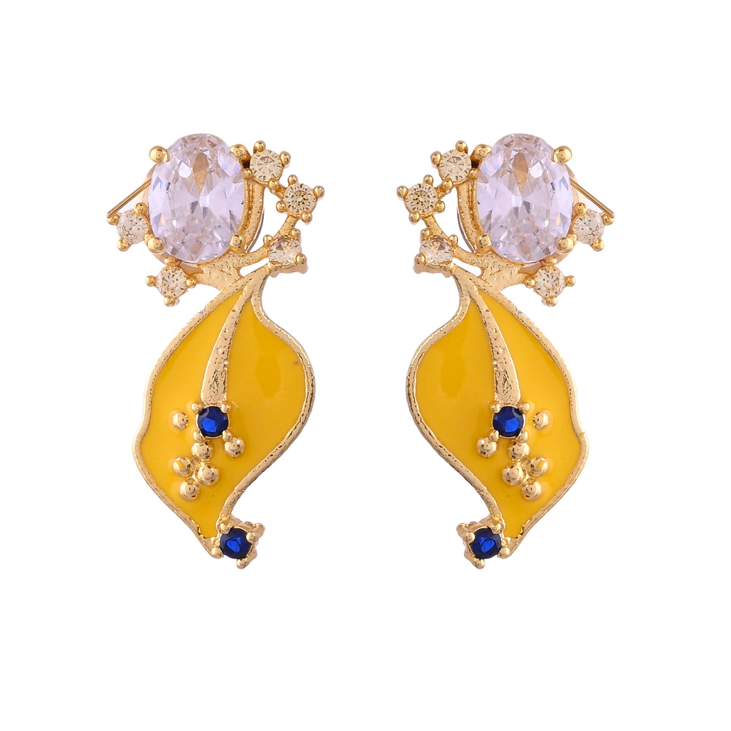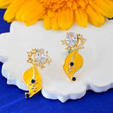 Radiate elegance with our Golden Bloom earrings. Crafted from brass with a radiant gold plating, these leaf floral stud earrings feature intricate floral designs in vibrant yellow. Elevate your style with a touch of natural beauty and sophistication