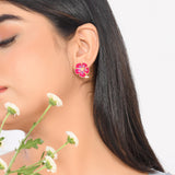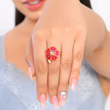 Embrace elegance with our Majestic Petals Earrings And Ring Combo. Crafted from brass with a radiant gold plating, this small ring features intricate floral details in captivating magenta. Elevate your style with a touch of natural beauty and sophistication!