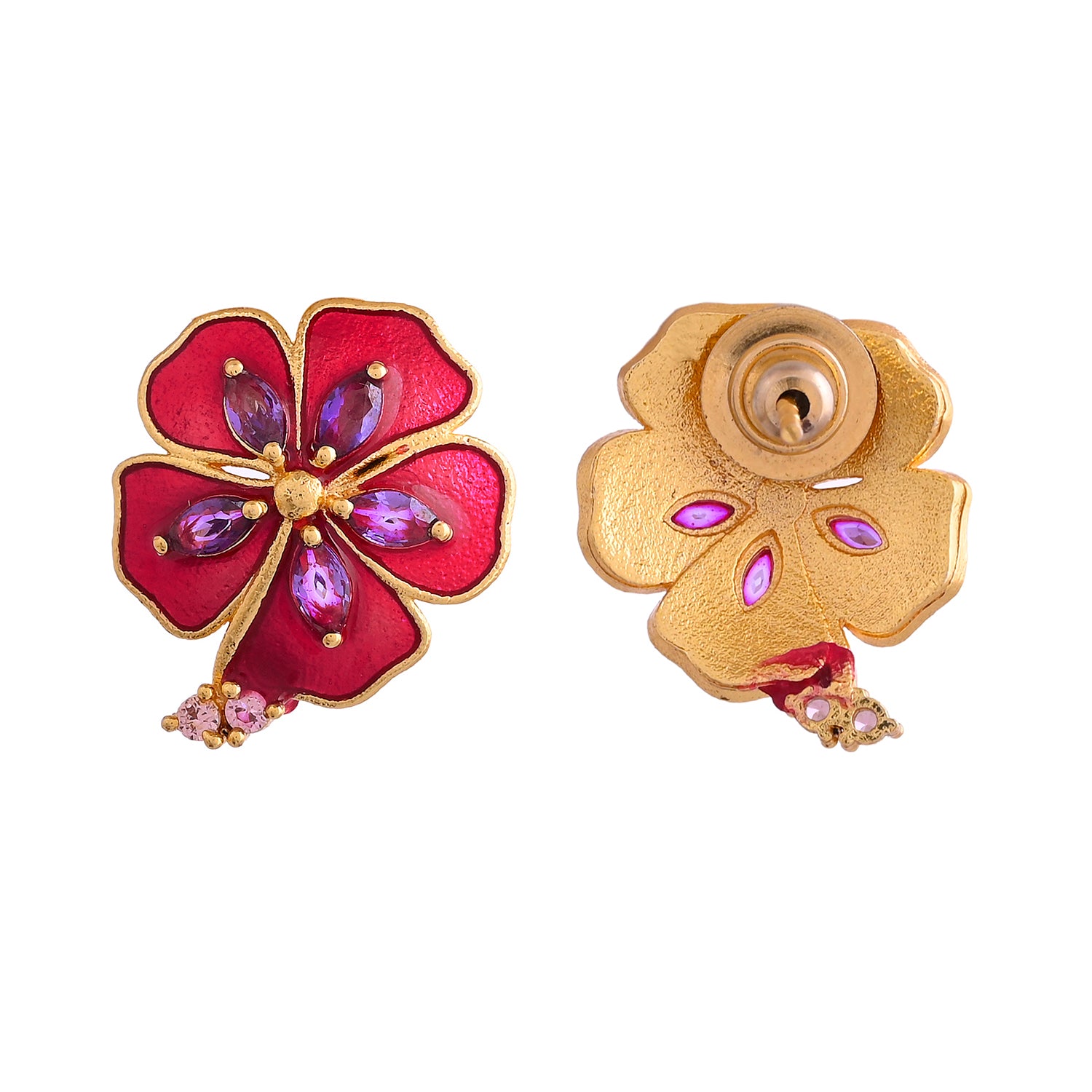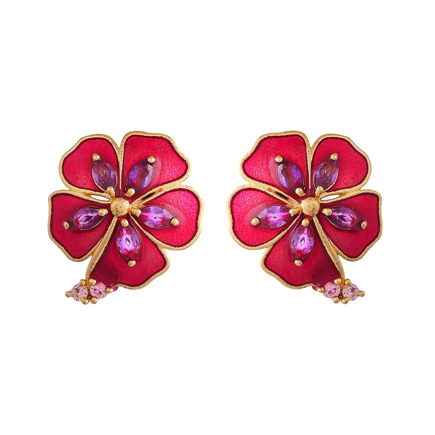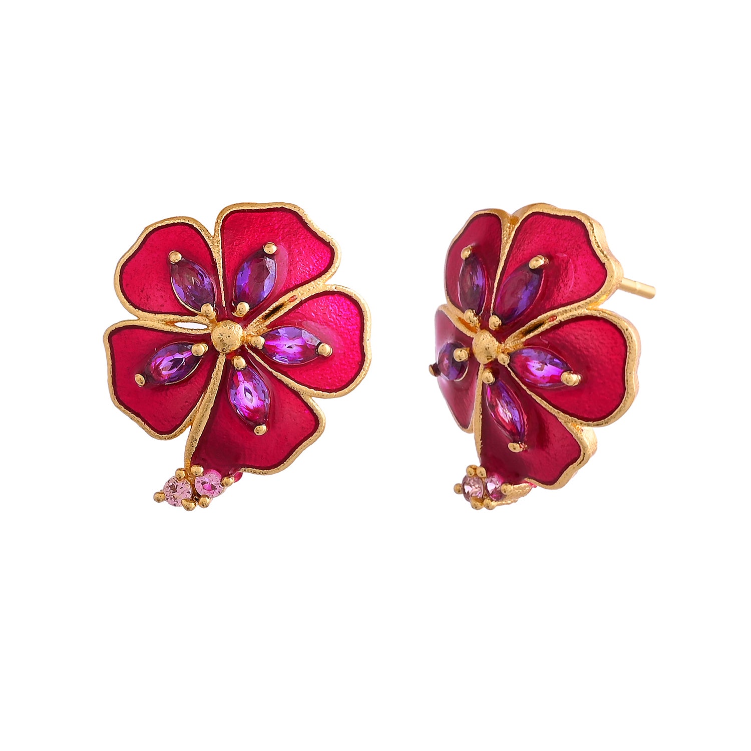 Illuminate your style with our Majestic Magenta earrings. Crafted from brass with a radiant gold plating, these small studs feature a captivating magenta hue adorned with sparkling purple CZ accents. Elevate your look with a touch of regal charm and allure