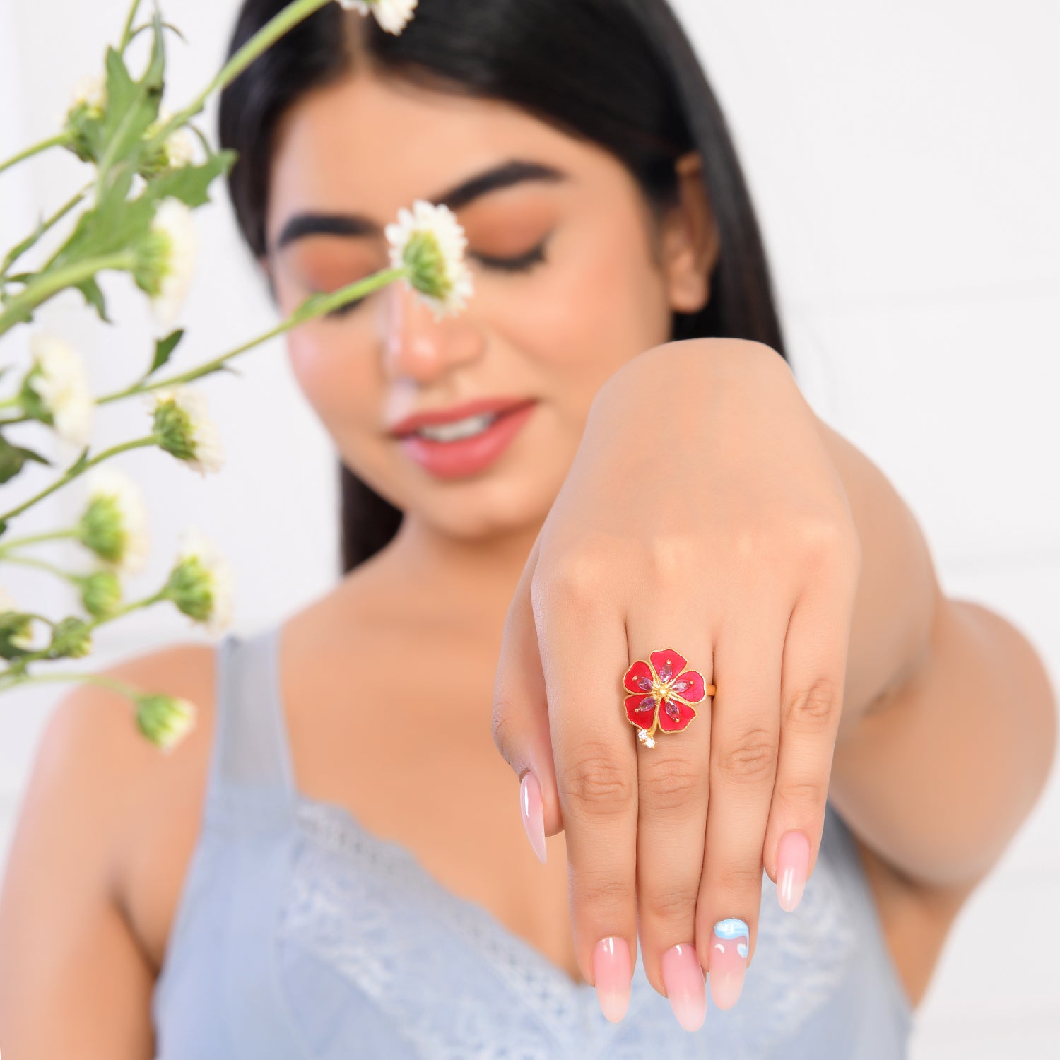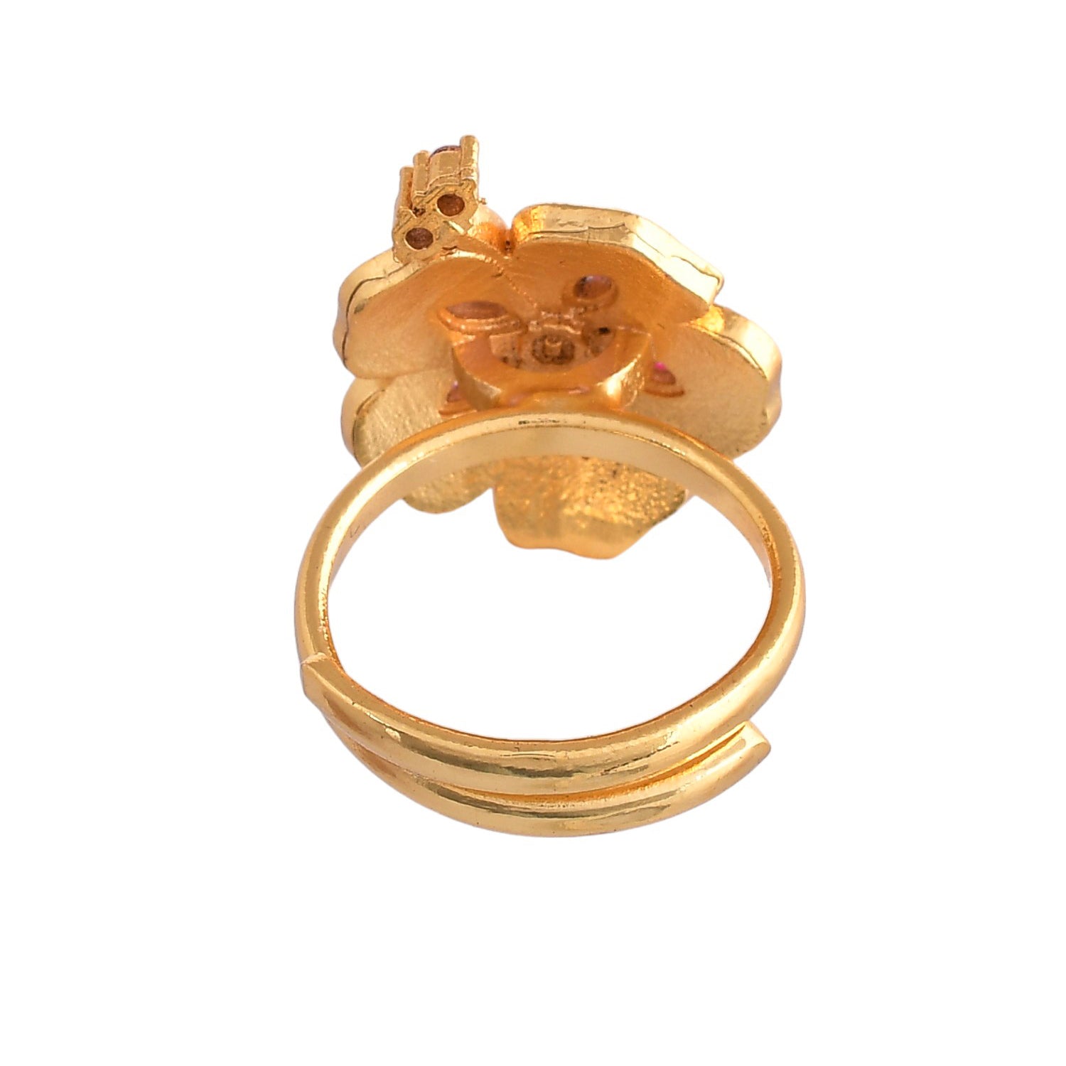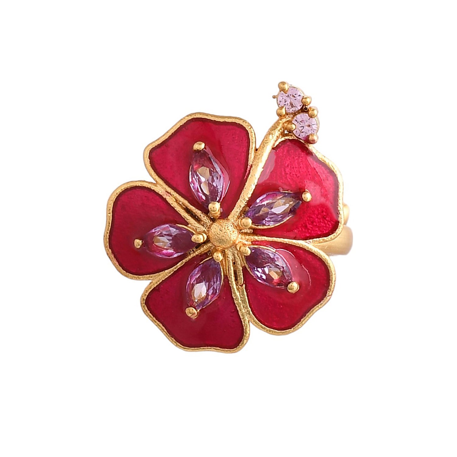 Embrace elegance with our Majestic Petals ring. Crafted from brass with a radiant gold plating, this small ring features intricate floral details in captivating magenta. Elevate your style with a touch of natural beauty and sophistication!