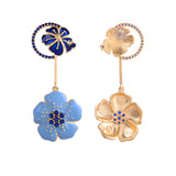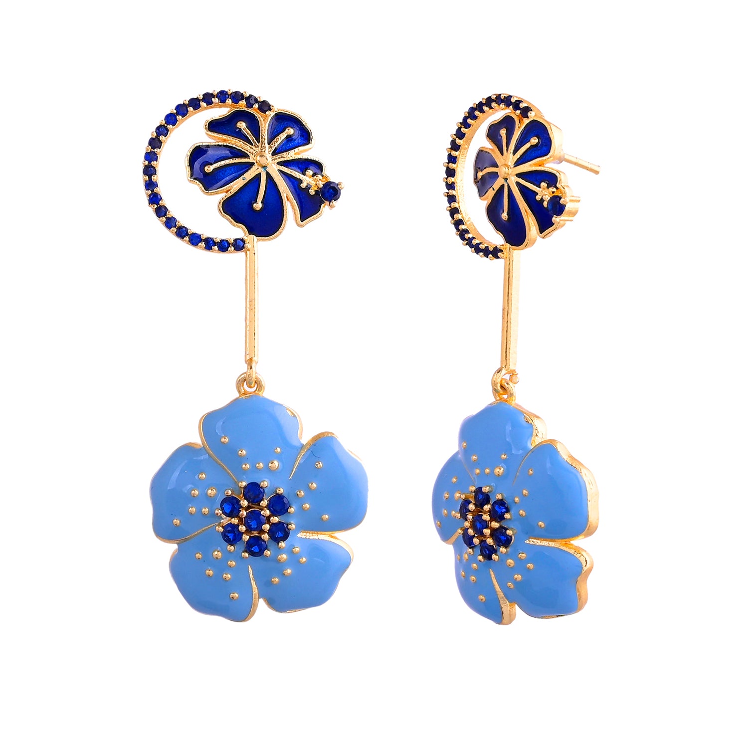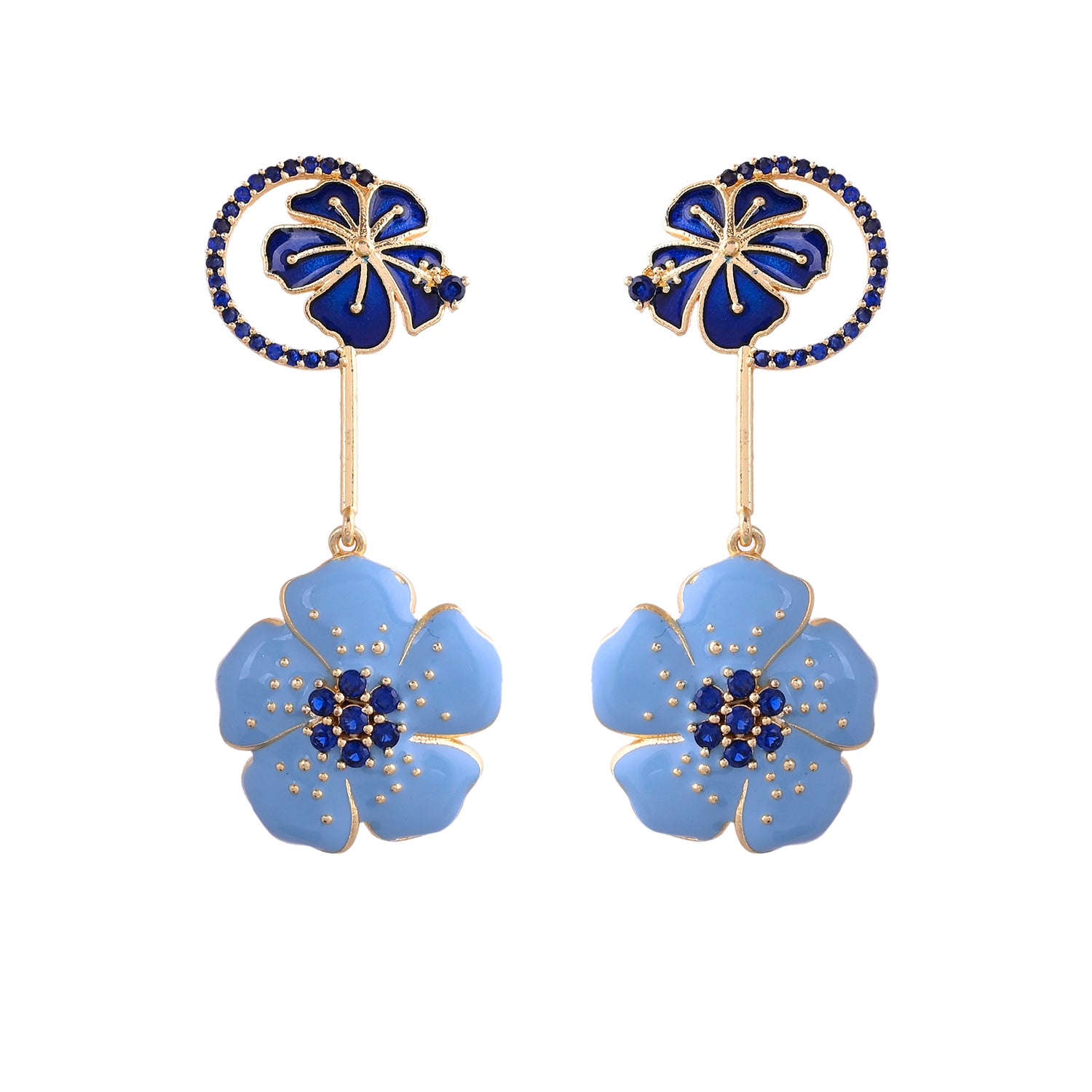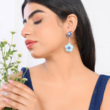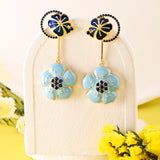 Embrace the serene beauty of the ocean with our Ocean Breeze earrings. These danglers, crafted from brass with a luxurious gold plating, feature two floral studs at the top and at the end, adorned in shades of blue and light blue. Elevate your look with a touch of coastal elegance and sophistication