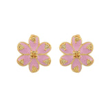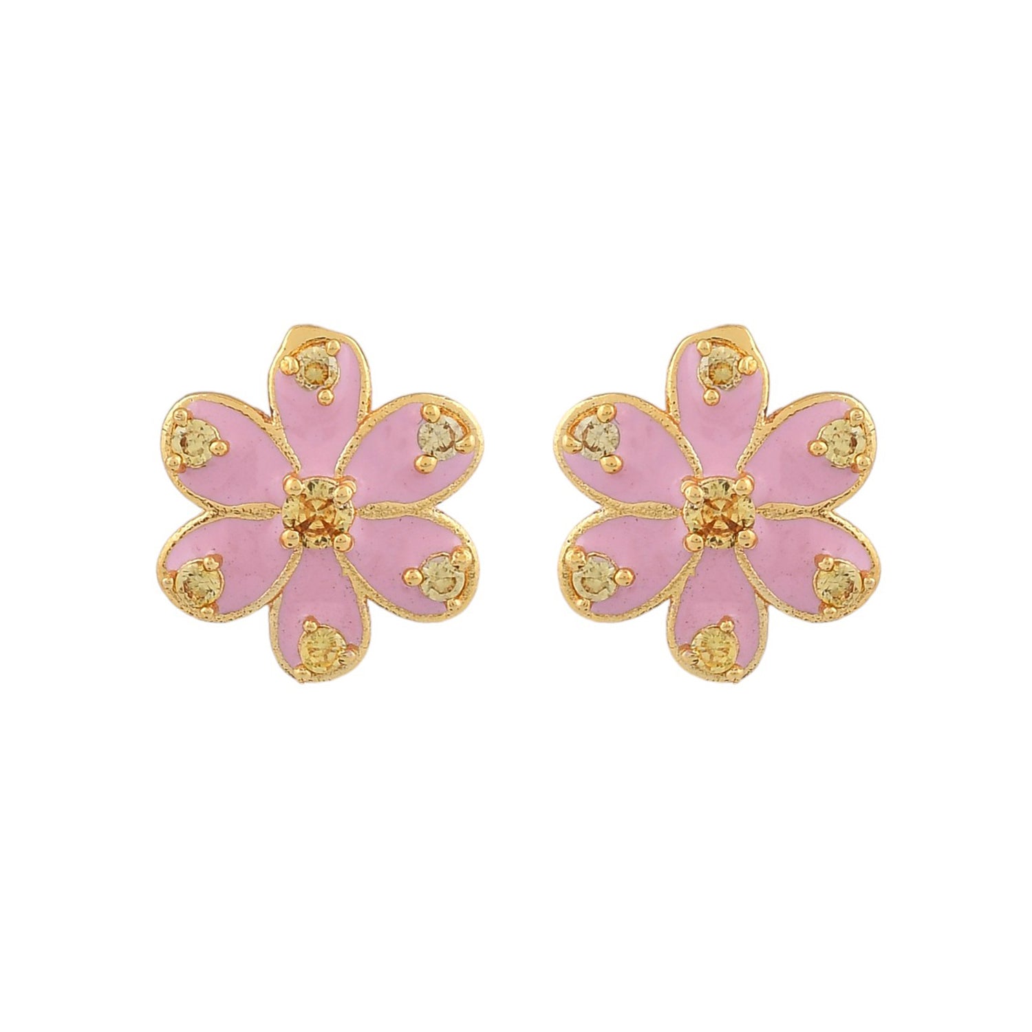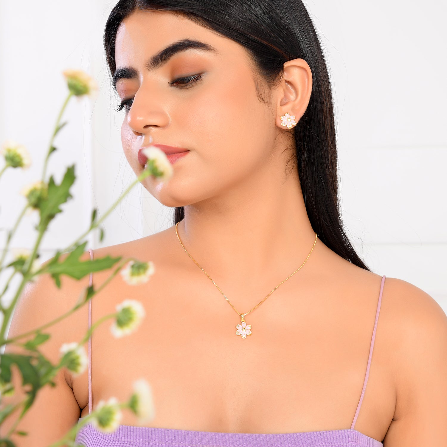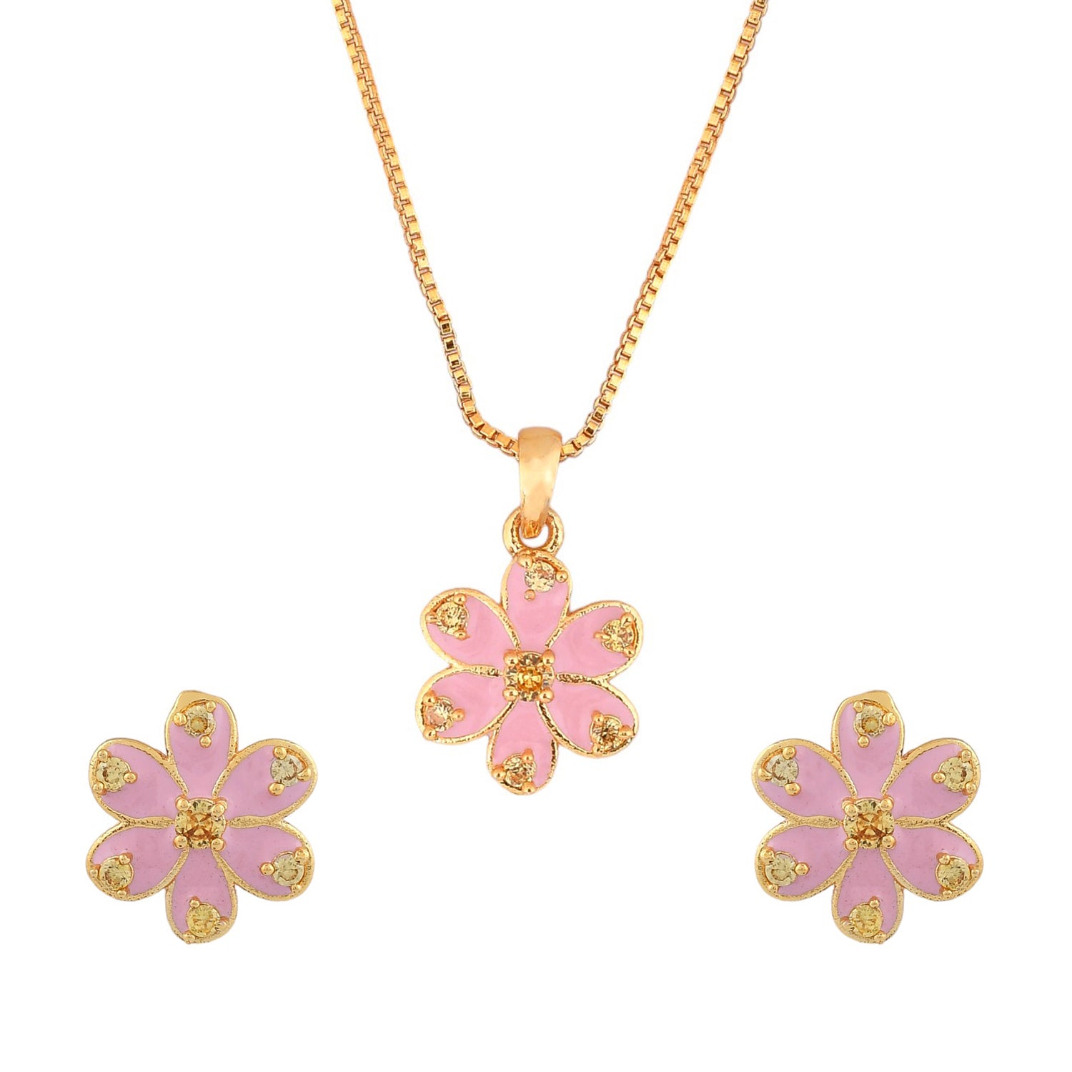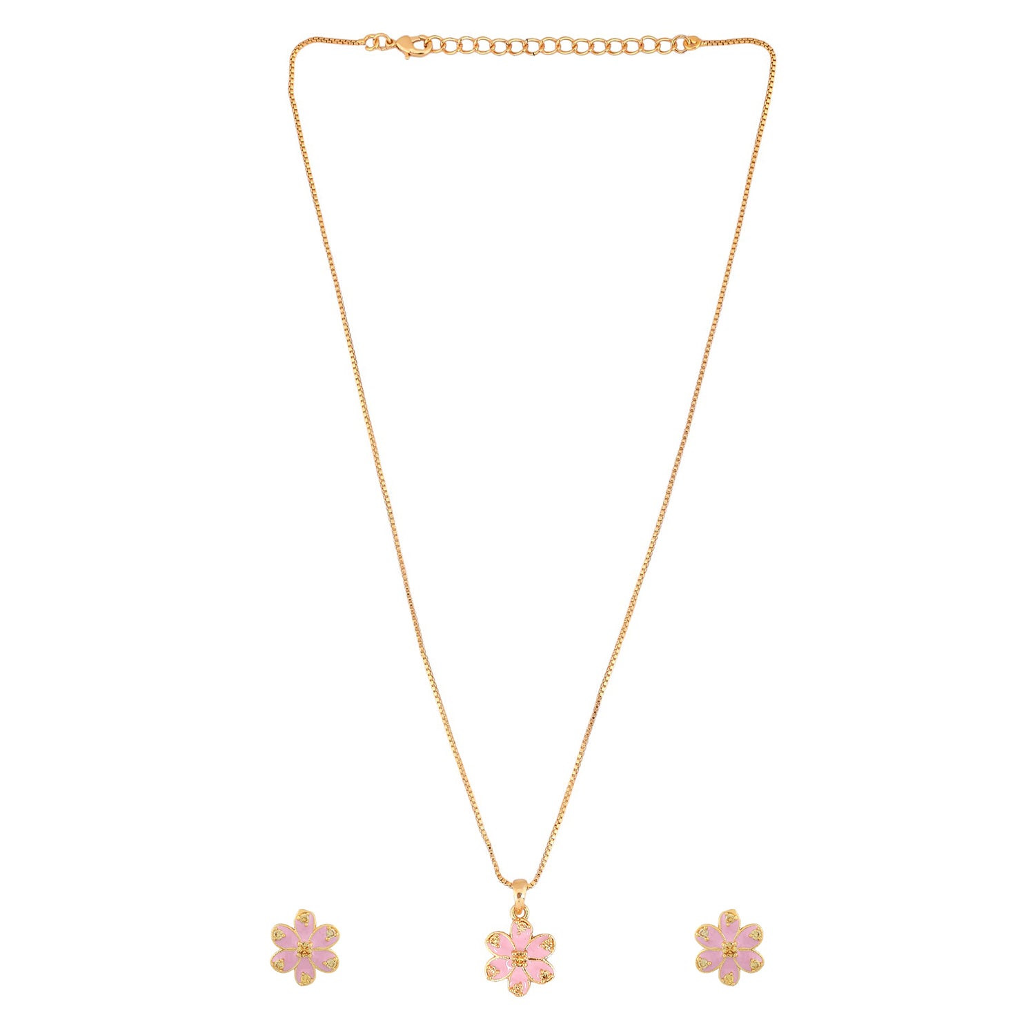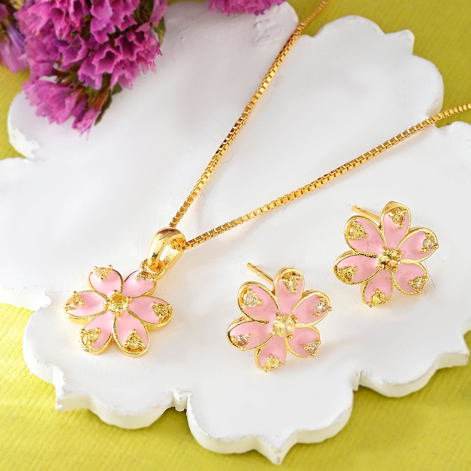 Indulge in elegance with our Pink Blossom Pendant Set with Matching Earrings. Crafted from brass with a radiant gold plating, this set features delicate floral designs in charming pink. Elevate your style with a touch of natural beauty and grace