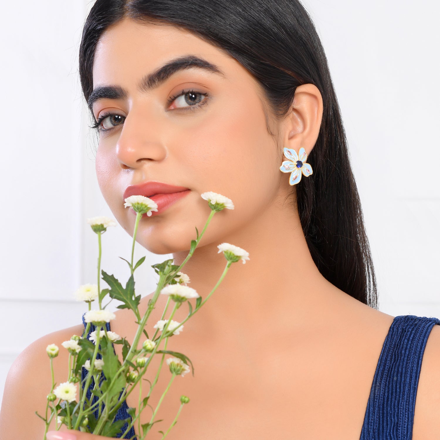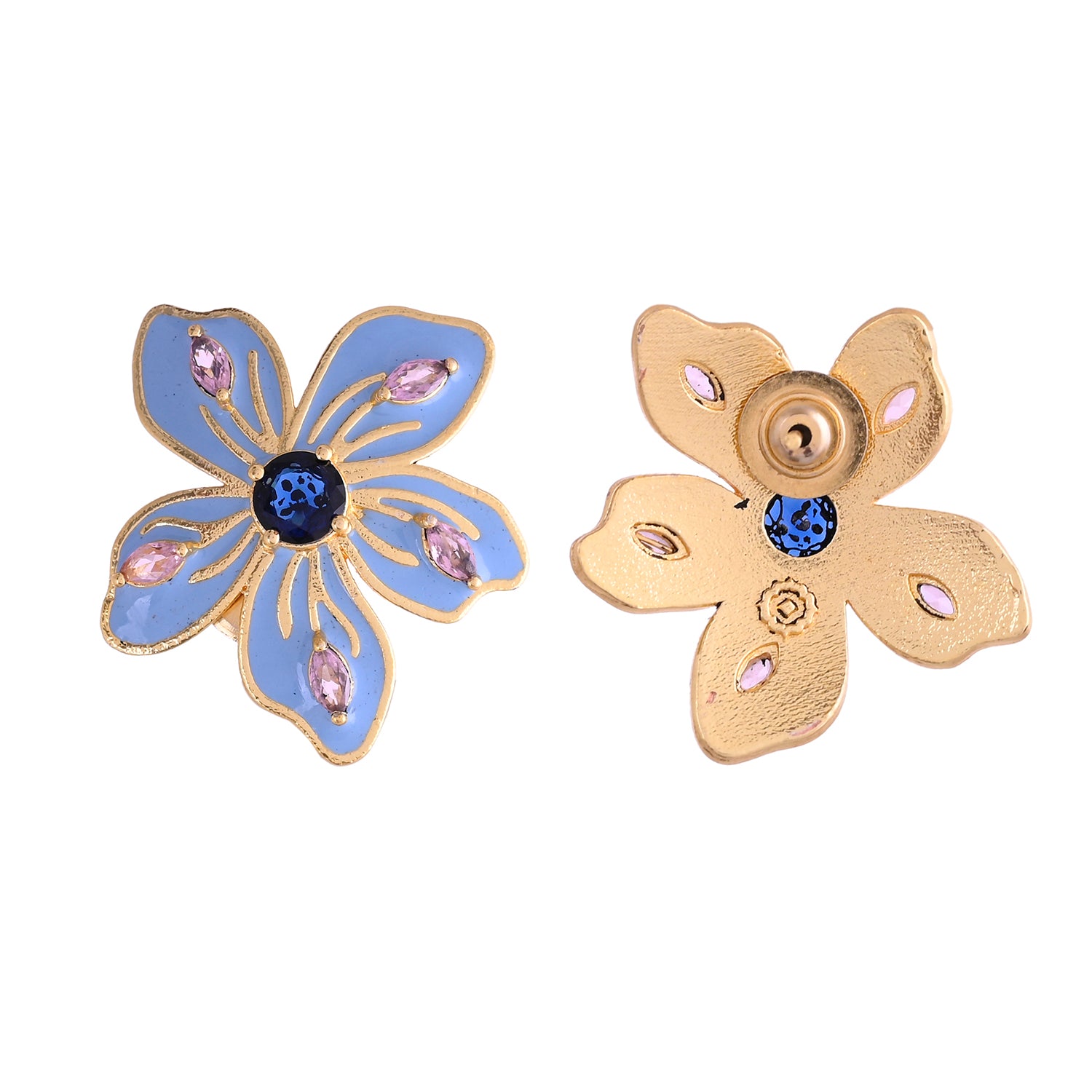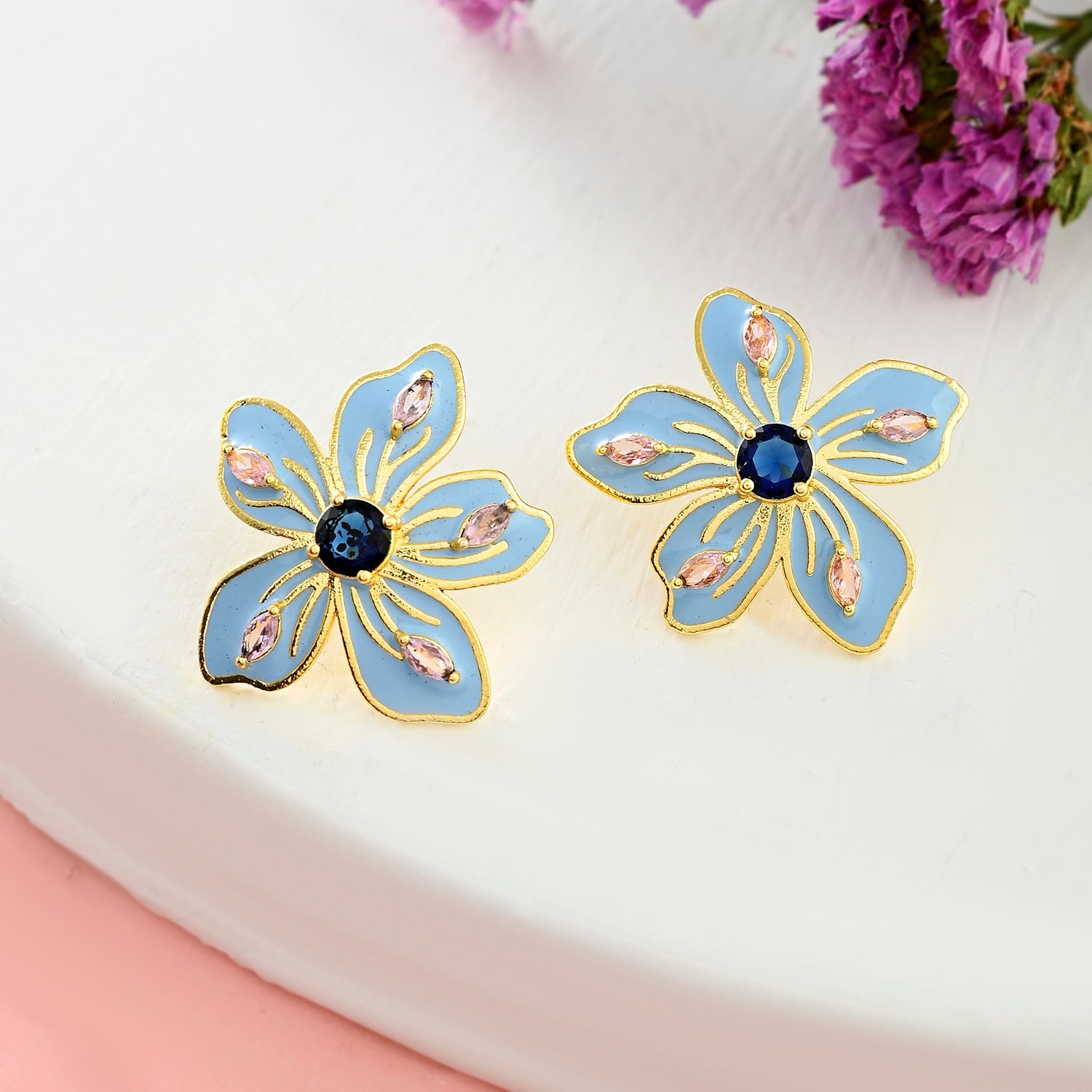 Elevate your elegance with our Sky Serenity earrings. Crafted from brass with a radiant gold plating, these big studs feature a serene light blue hue adorned with sparkling blue CZ stones. Enhance your style with a touch of sophistication and charm