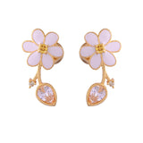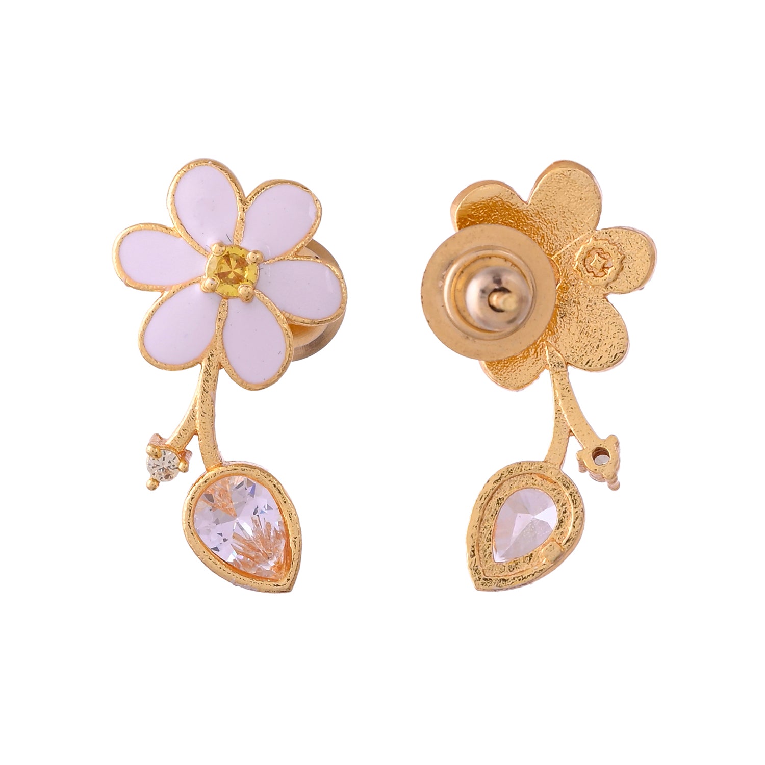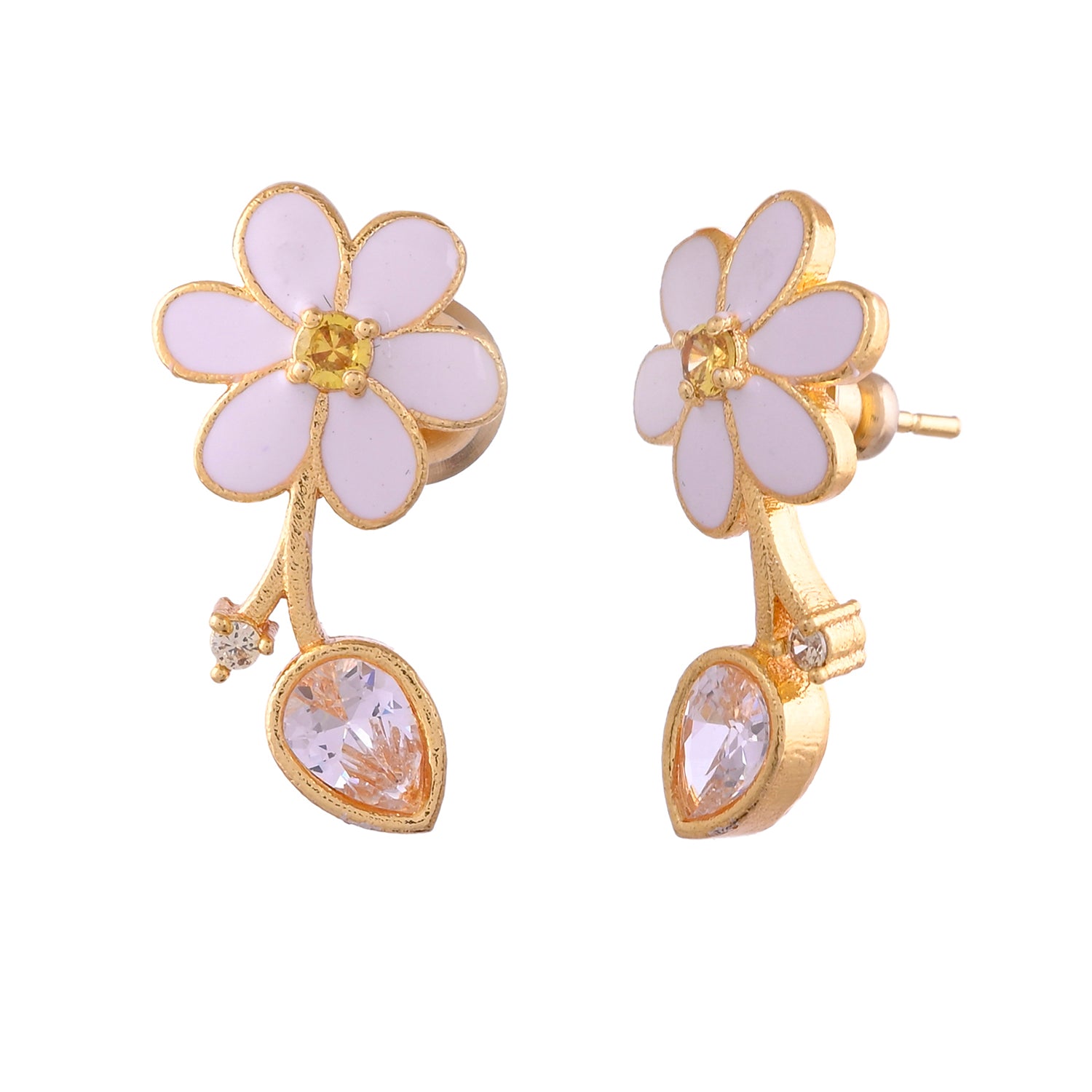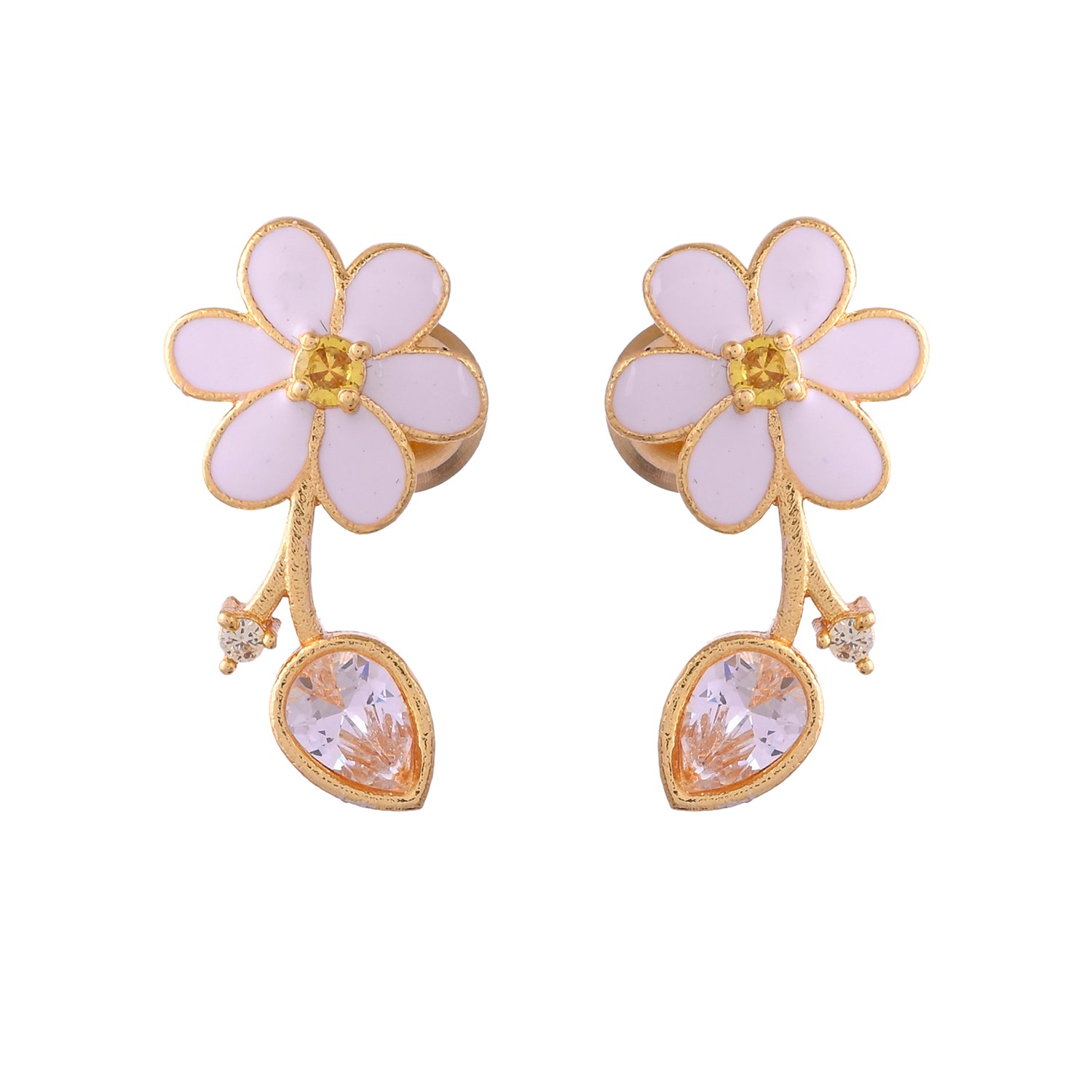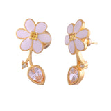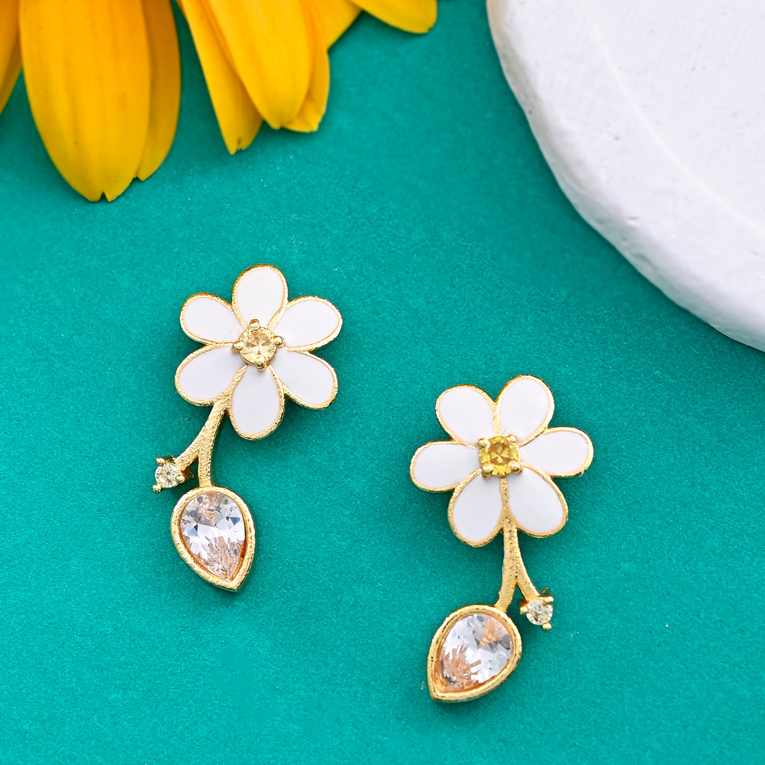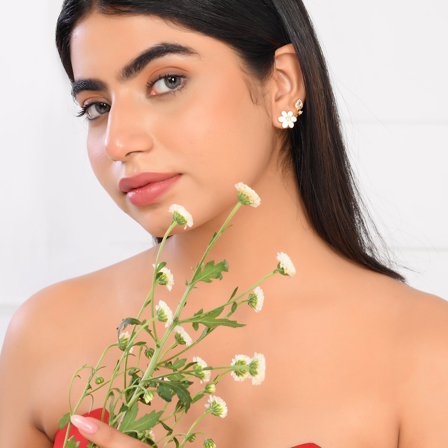 Step into winter's elegance with our Snowy Bloom Earrings. Crafted from brass with a radiant gold plating, this ring features intricate white floral designs adorned with a delicate leaf string and CZ accent. Elevate your style with a touch of natural beauty and sophistication!