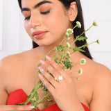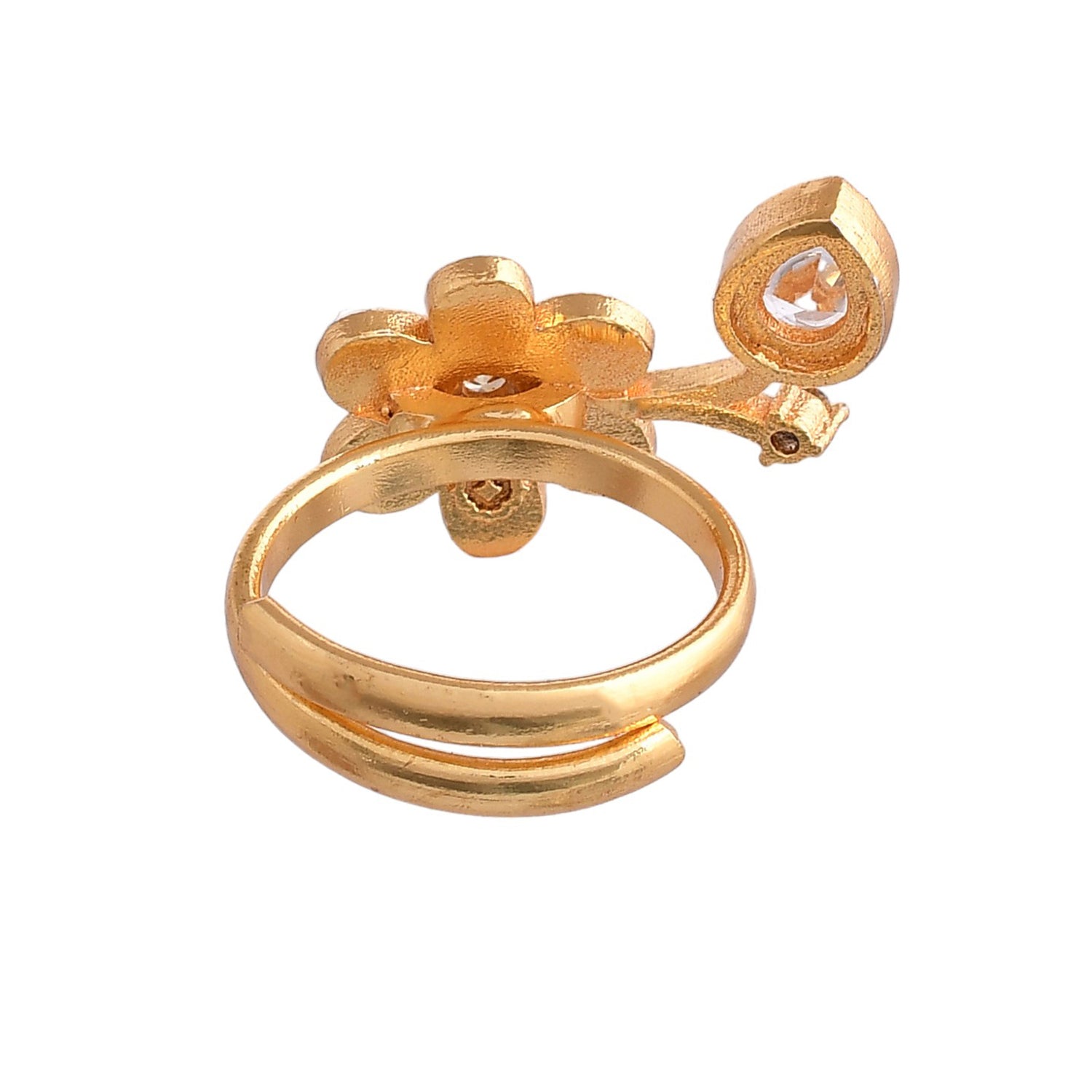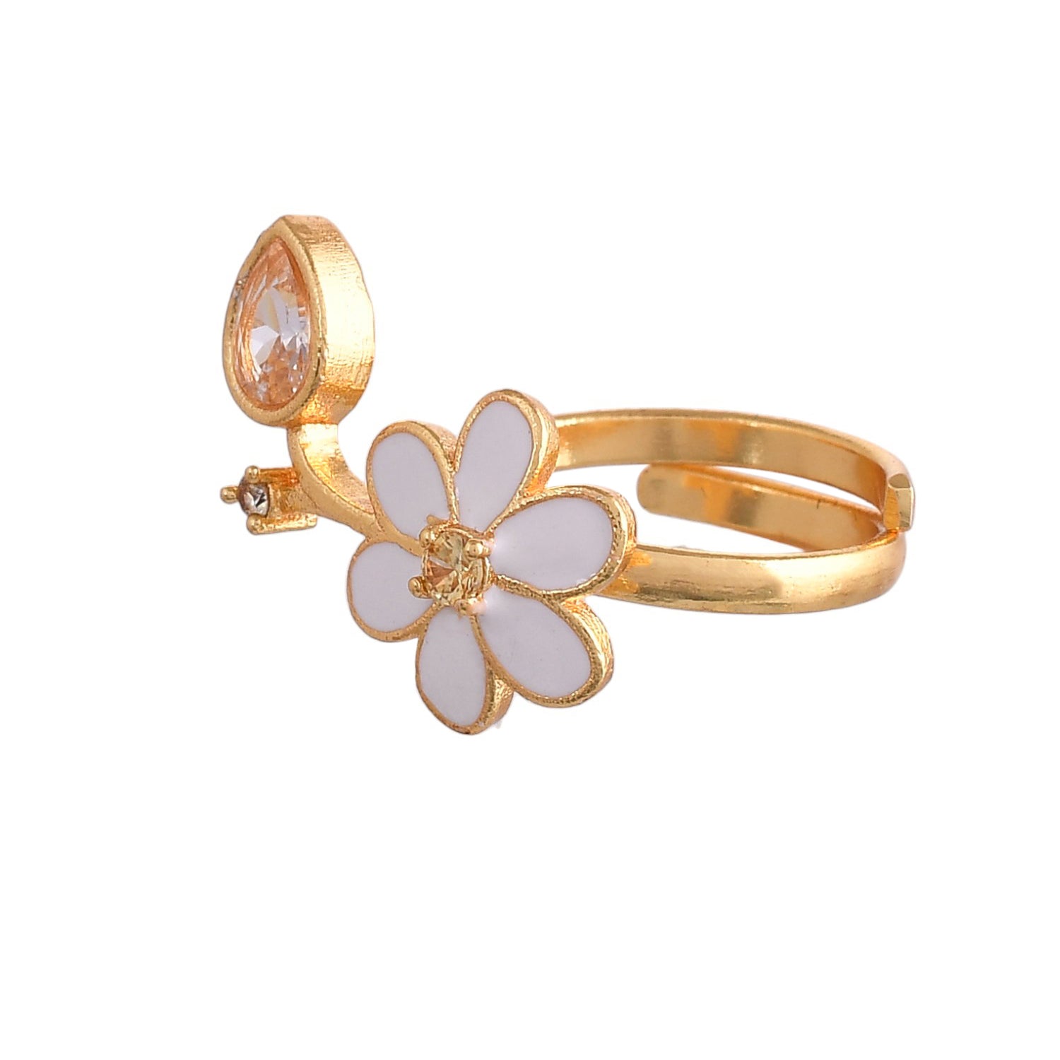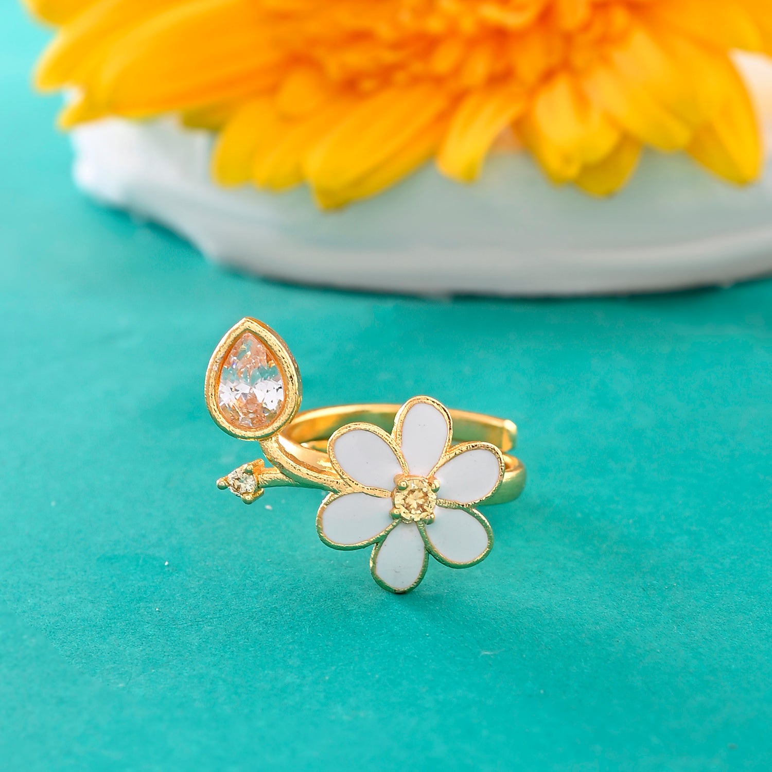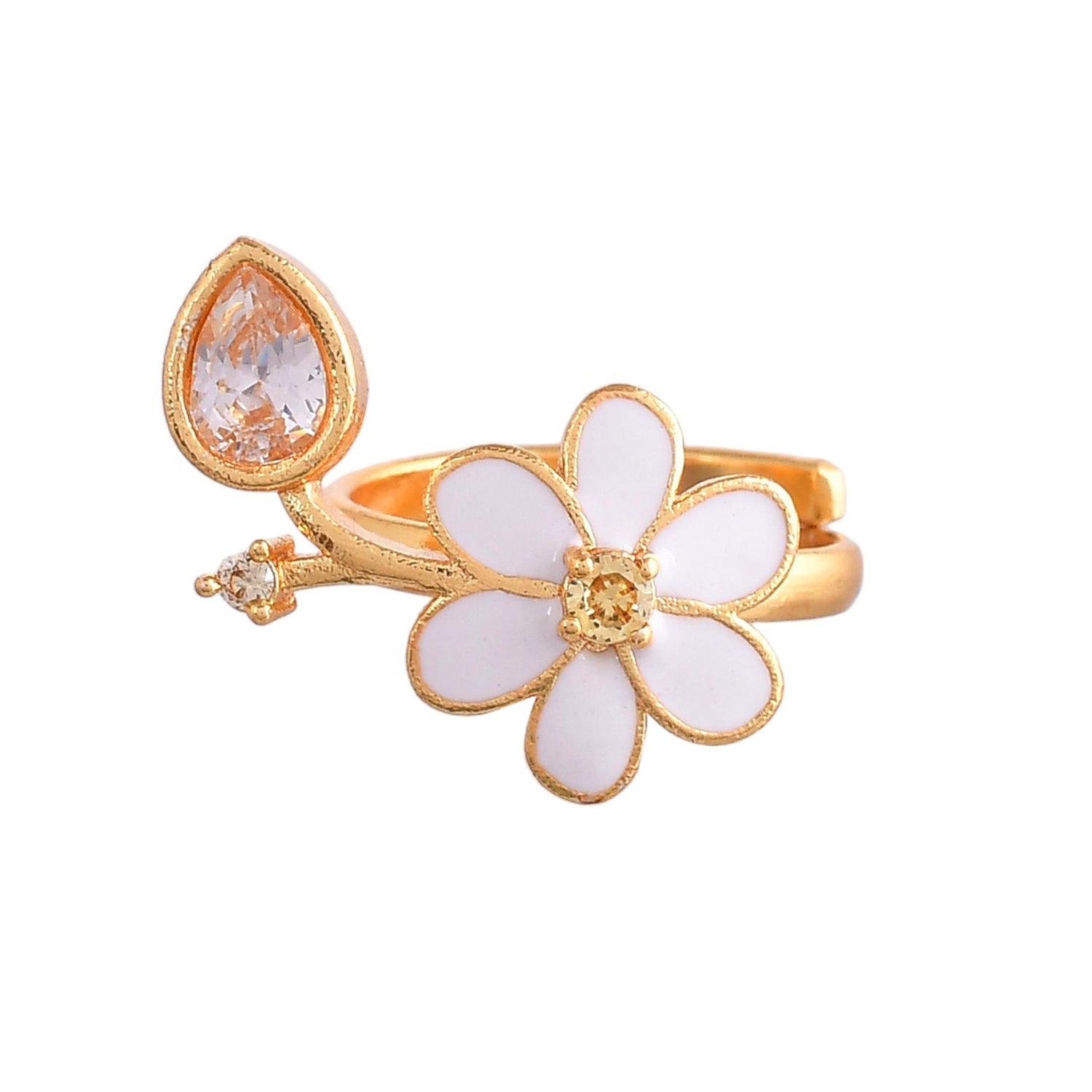 Step into winter's elegance with our Snowy Bloom ring. Crafted from brass with a radiant gold plating, this ring features intricate white floral designs adorned with a delicate leaf string and CZ accent. Elevate your style with a touch of natural beauty and sophistication!