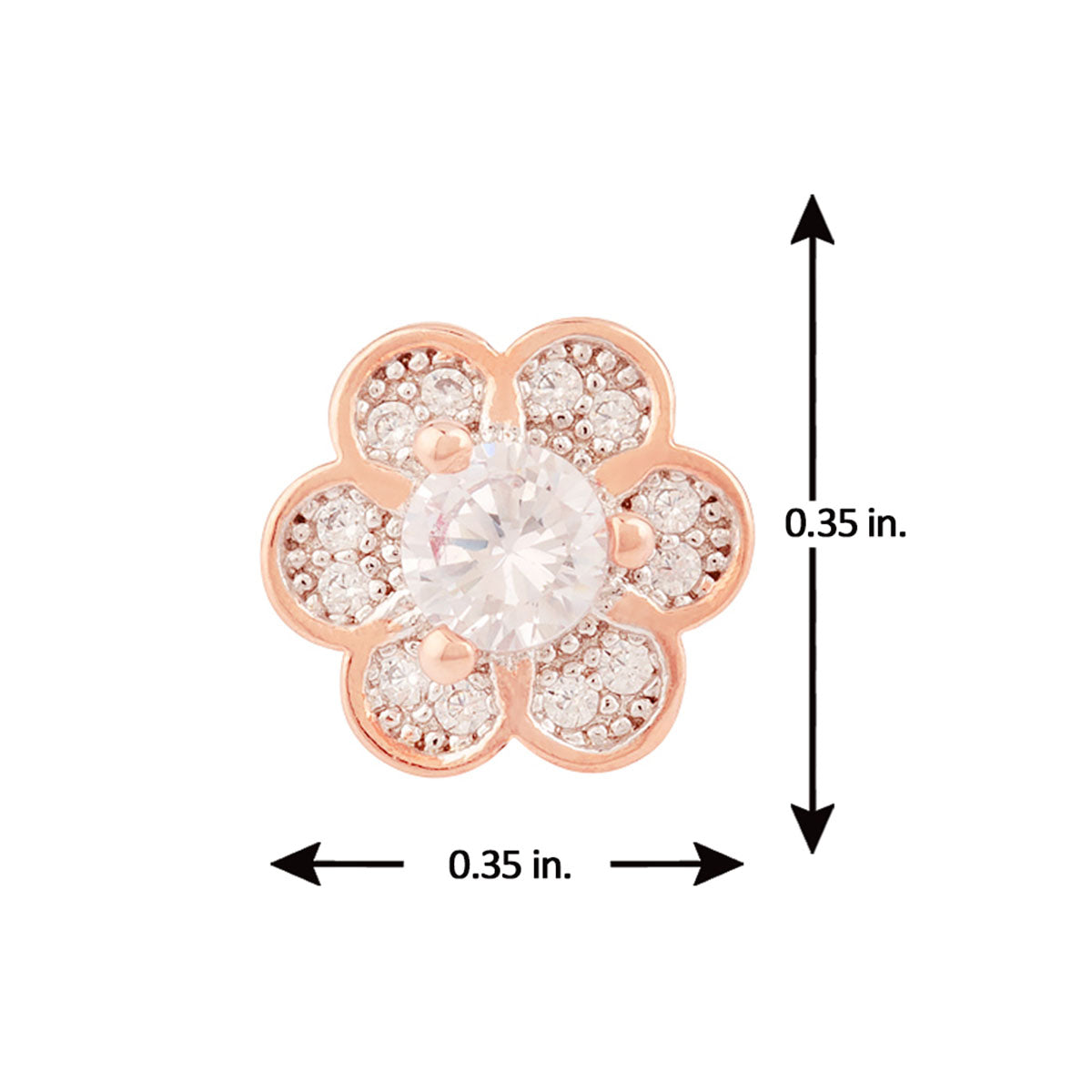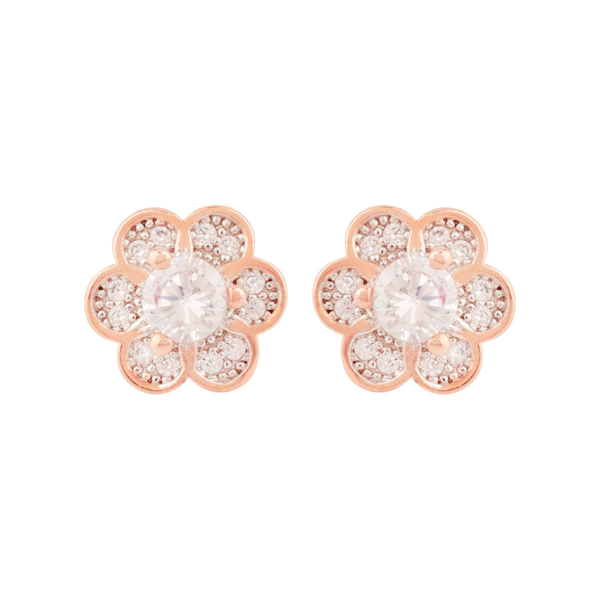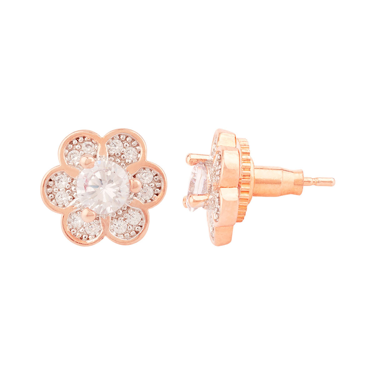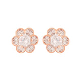 Zircons adorned flower stud earrings. Made from brass and rose gold plated. Wear with a summer dress.