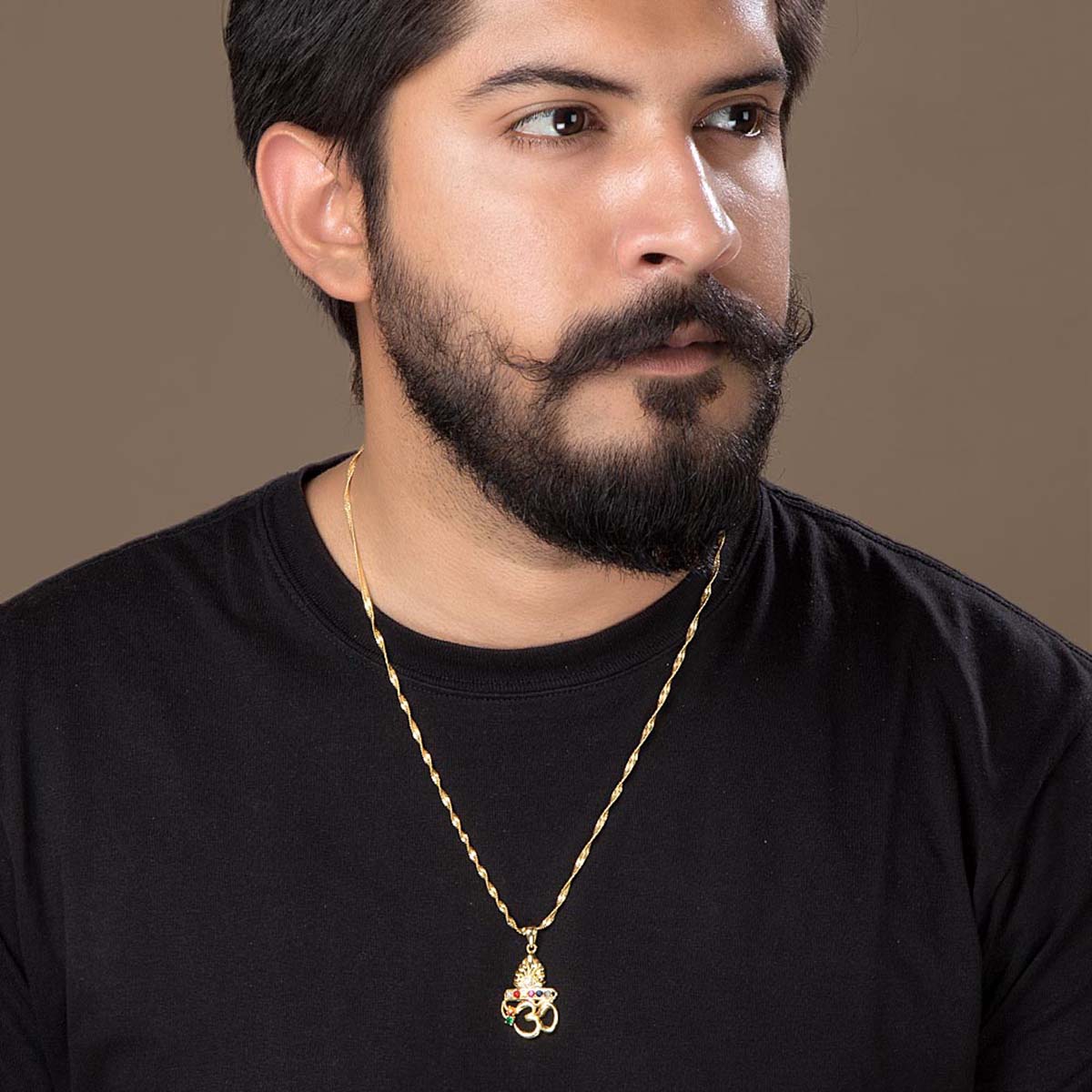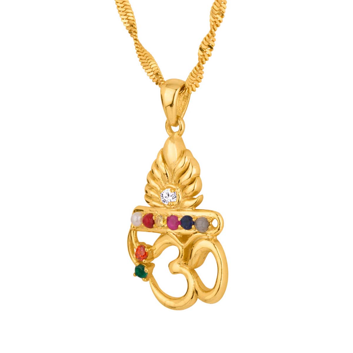 The Accessory: An artistically crafted Navratan pendant featuring a flute, peacock feather and OM.