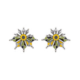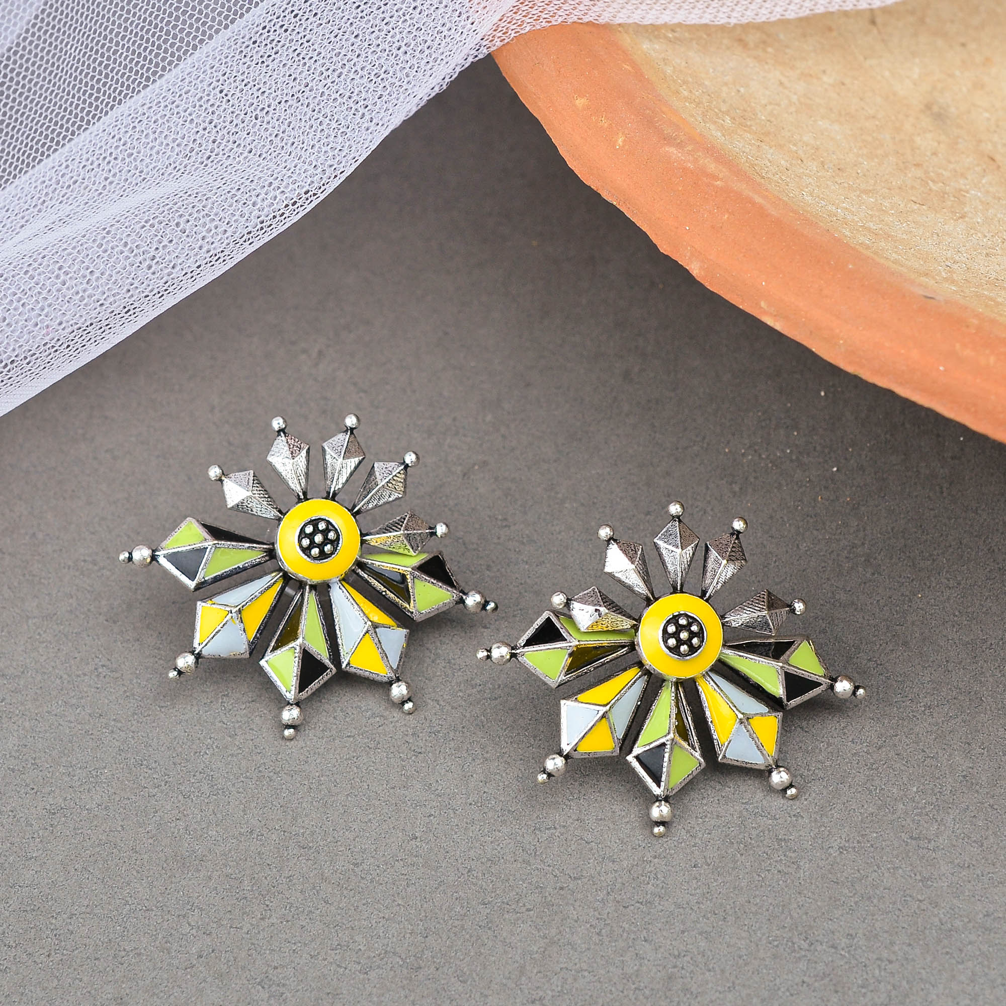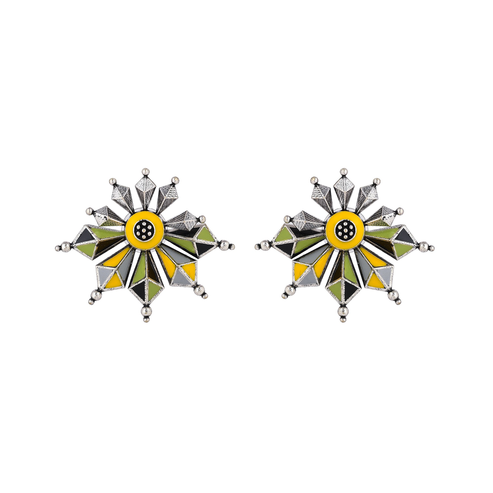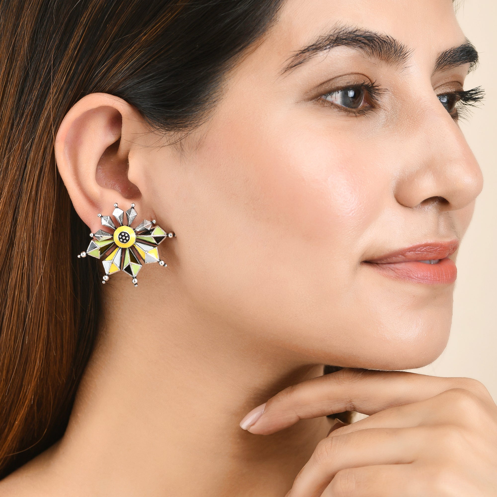Inspired by the colours, movements and grace of Rajasthan's Bhavai folk dance, these Aztec style stud earrings have been crafted from brass. Enamelled and silver plated, the earrings are lightweight, comfortable and versatile.