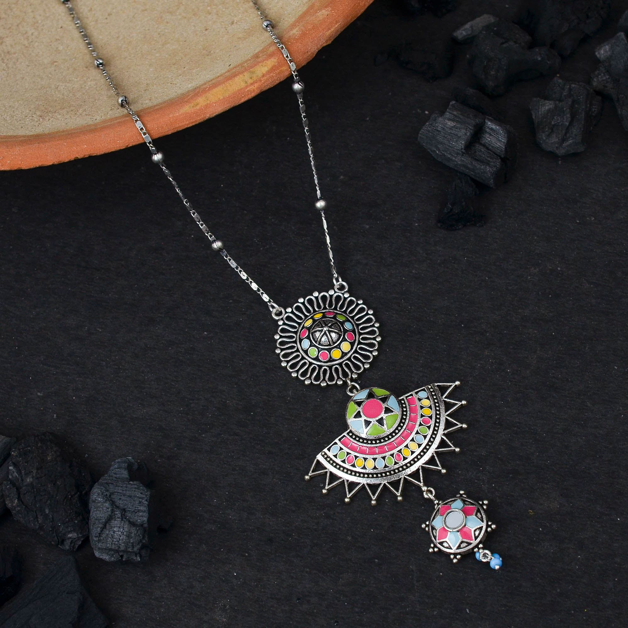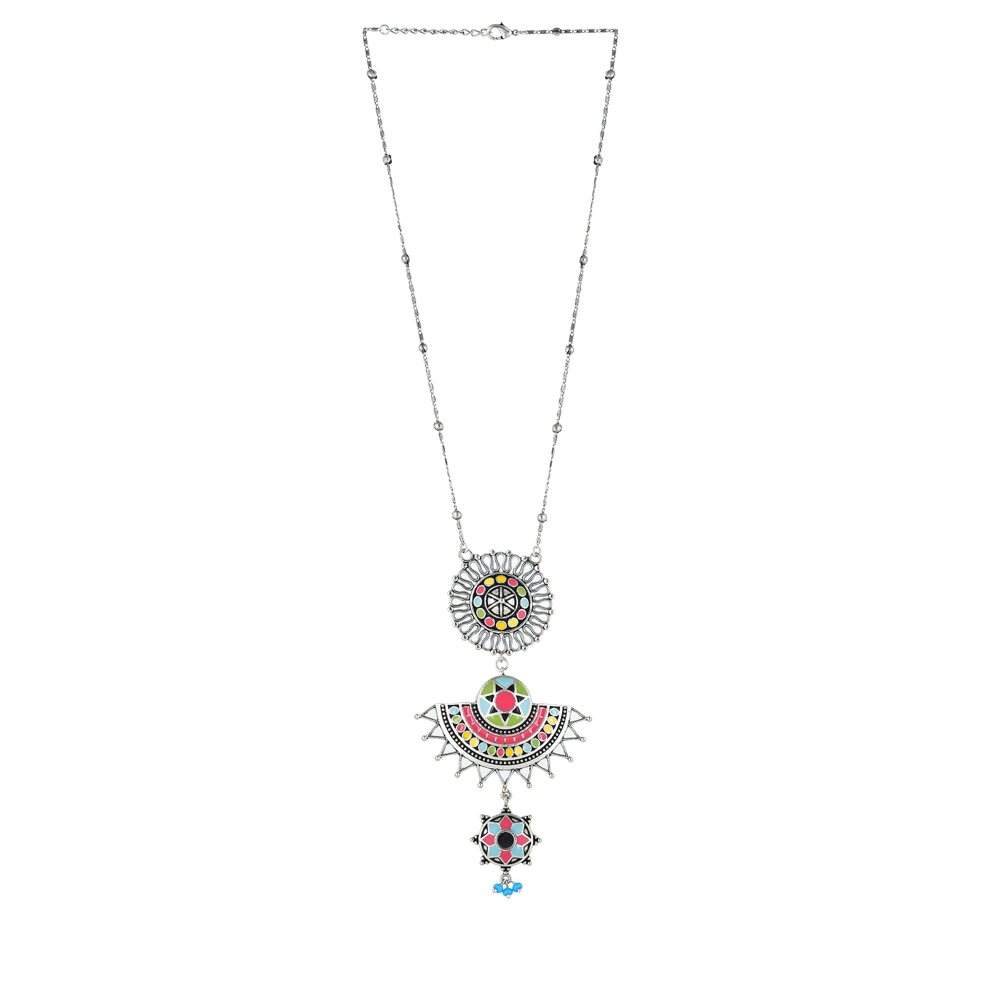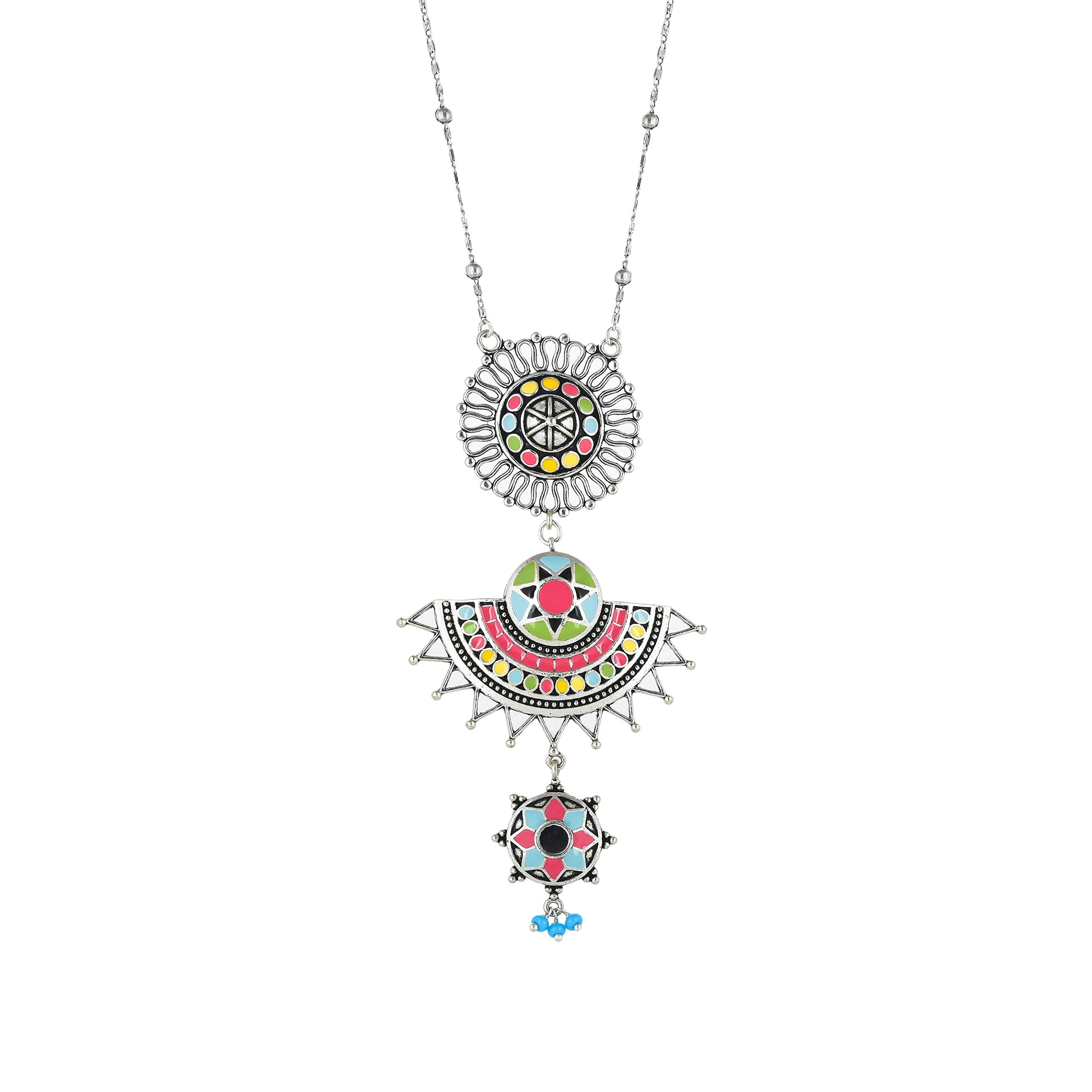 Inspired by the movements, colours and grace of the Bhavani folk dance of Rajasthan, this layered drop necklace has been fashioned out of brass. Silver plated and featuring enamelled details, the necklace is lightweight and versatile.