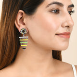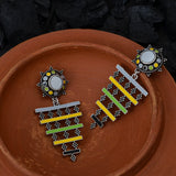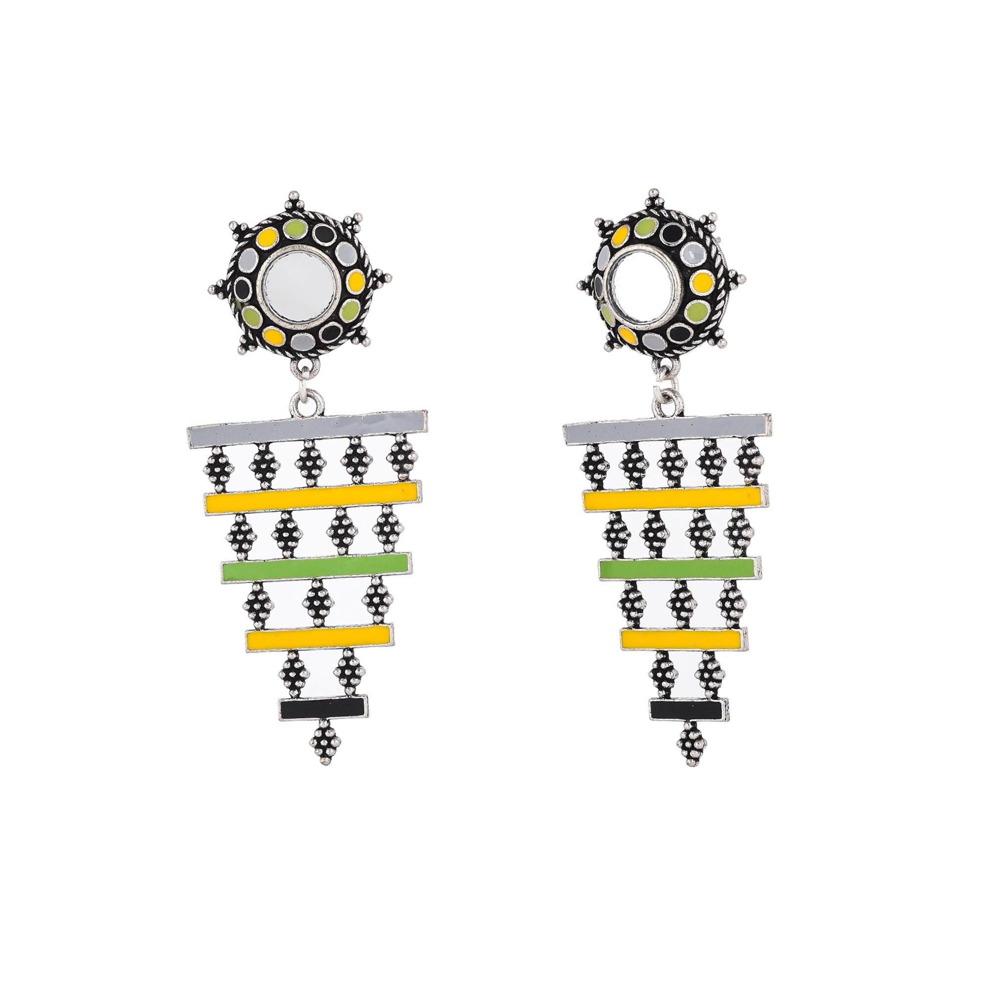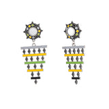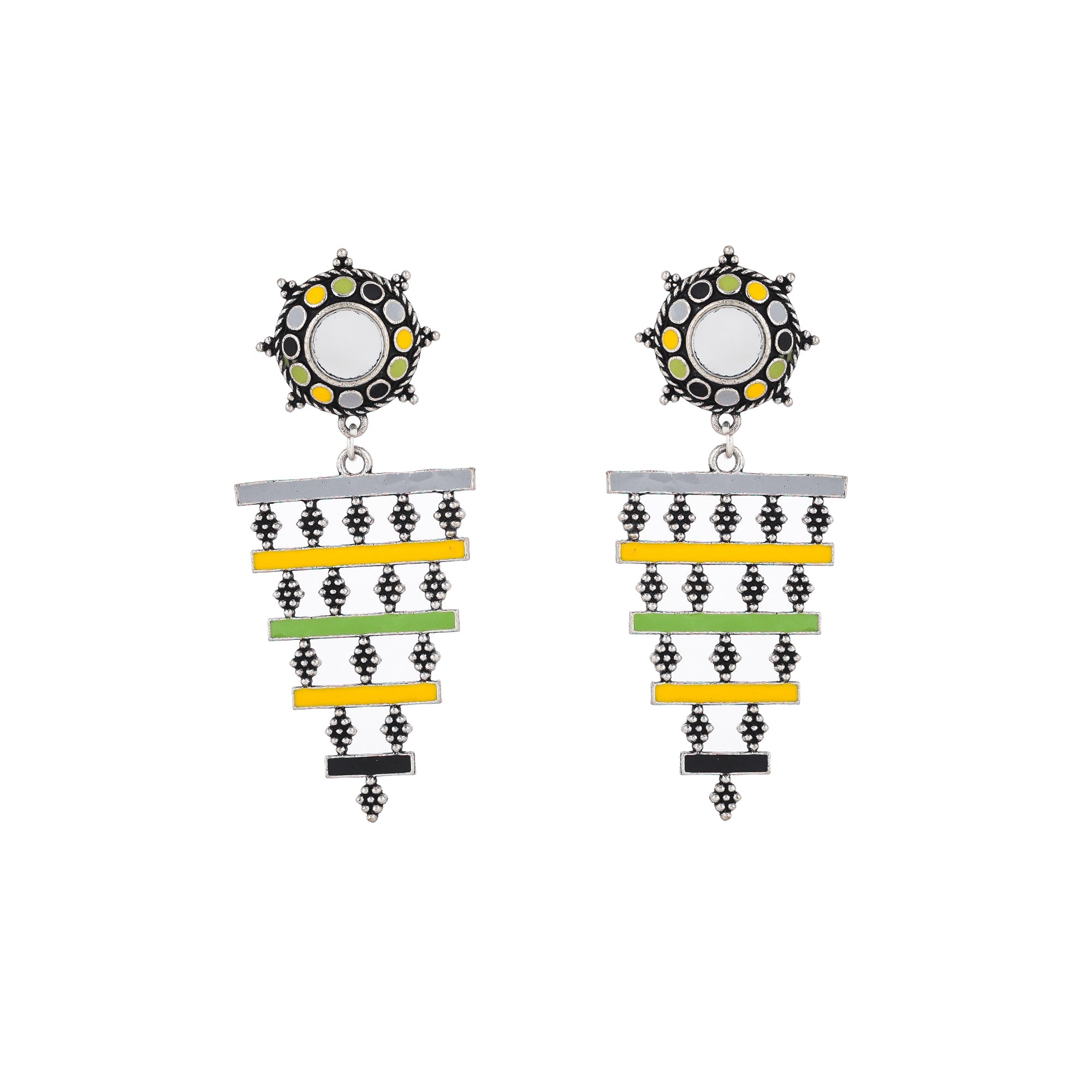 Drop earrings with a Mandala pattern, made from brass and inspired by Rajasthan's traditional Bhavani folk dance and its many elements. Silver plated and enamelled, the lightweight earrings are comfortable and versatile.