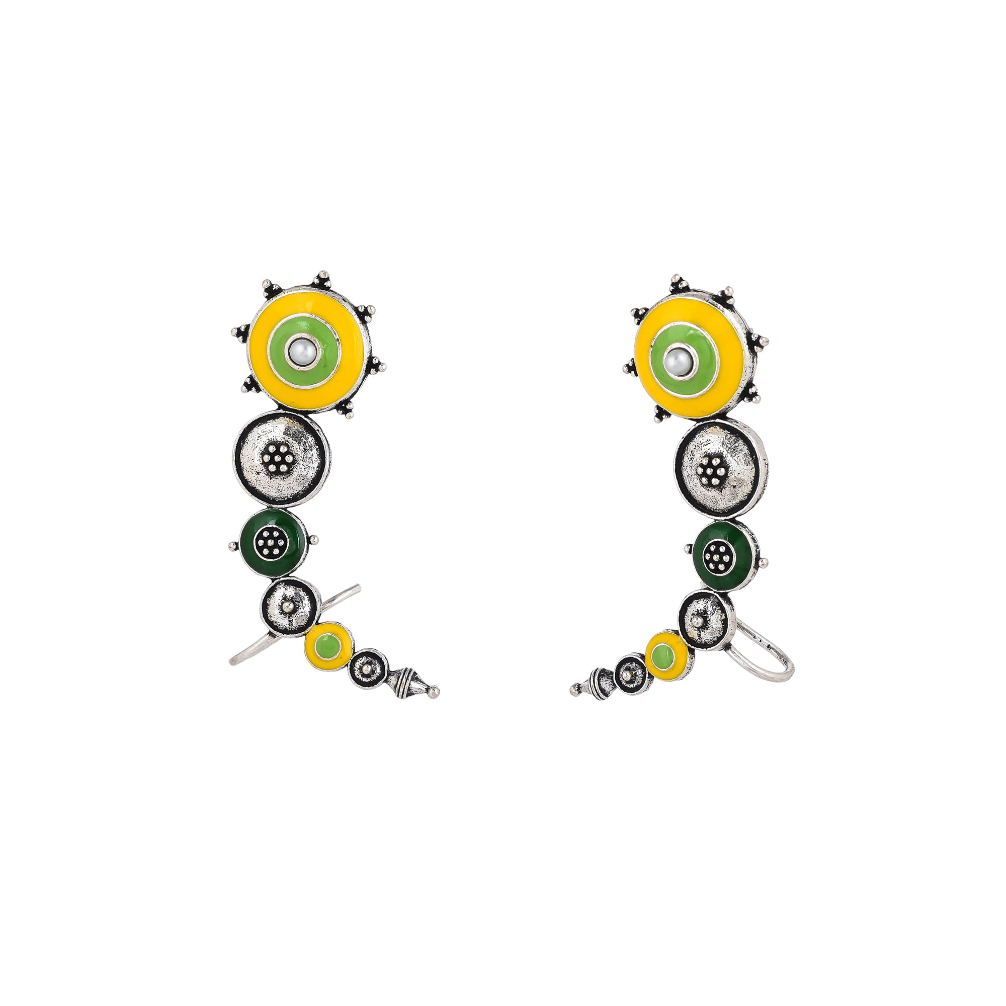 Inspired by the elements and grace of the Bhavai folk dance, these cuff earrings have been fashioned out of quality brass. Silver plating adds to the rustic charm of this pair, which is lightweight and versatile.