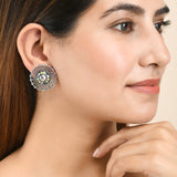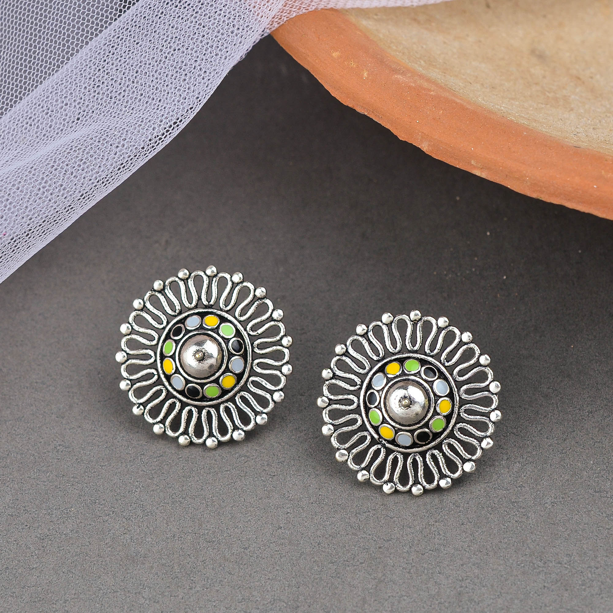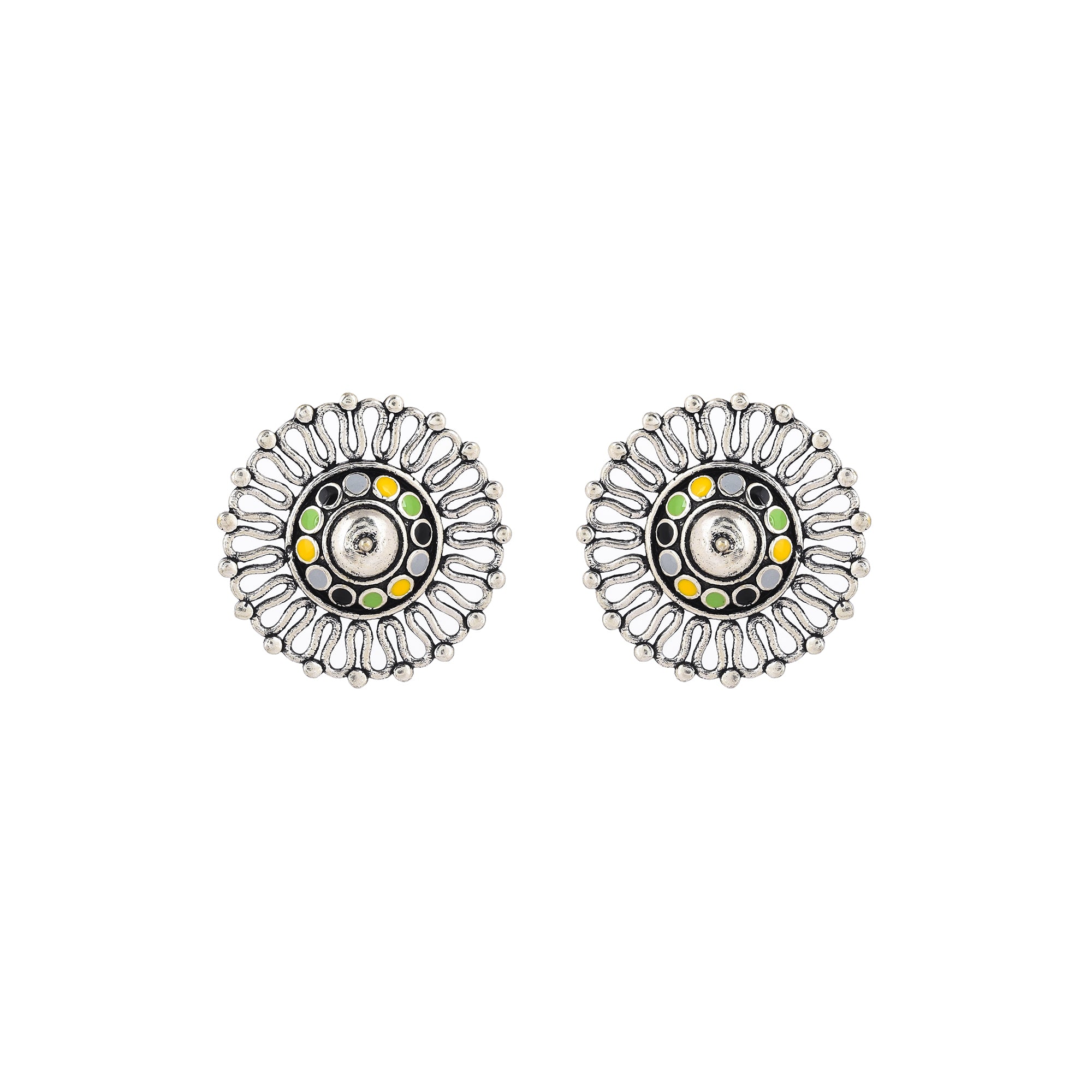 Cutwork design round stud earrings, inspired by the elegant and delicate movements of the Bhavai folk dance. The lightly enamelled pair has been fashioned out of brass. Silver plating adds to the grace of these earrings, which are versatile enough to be paired with a wide range of looks and outfits.