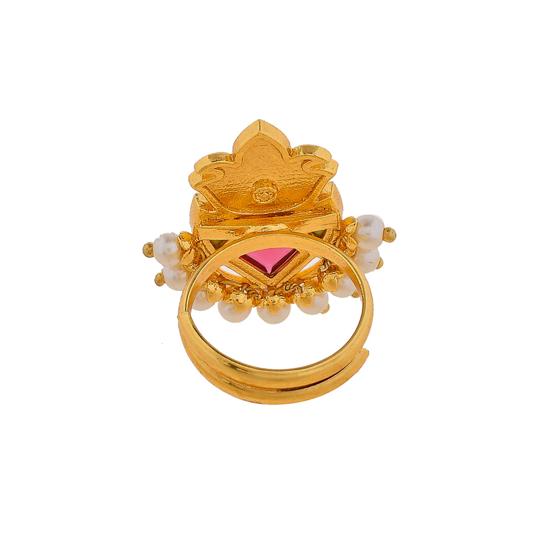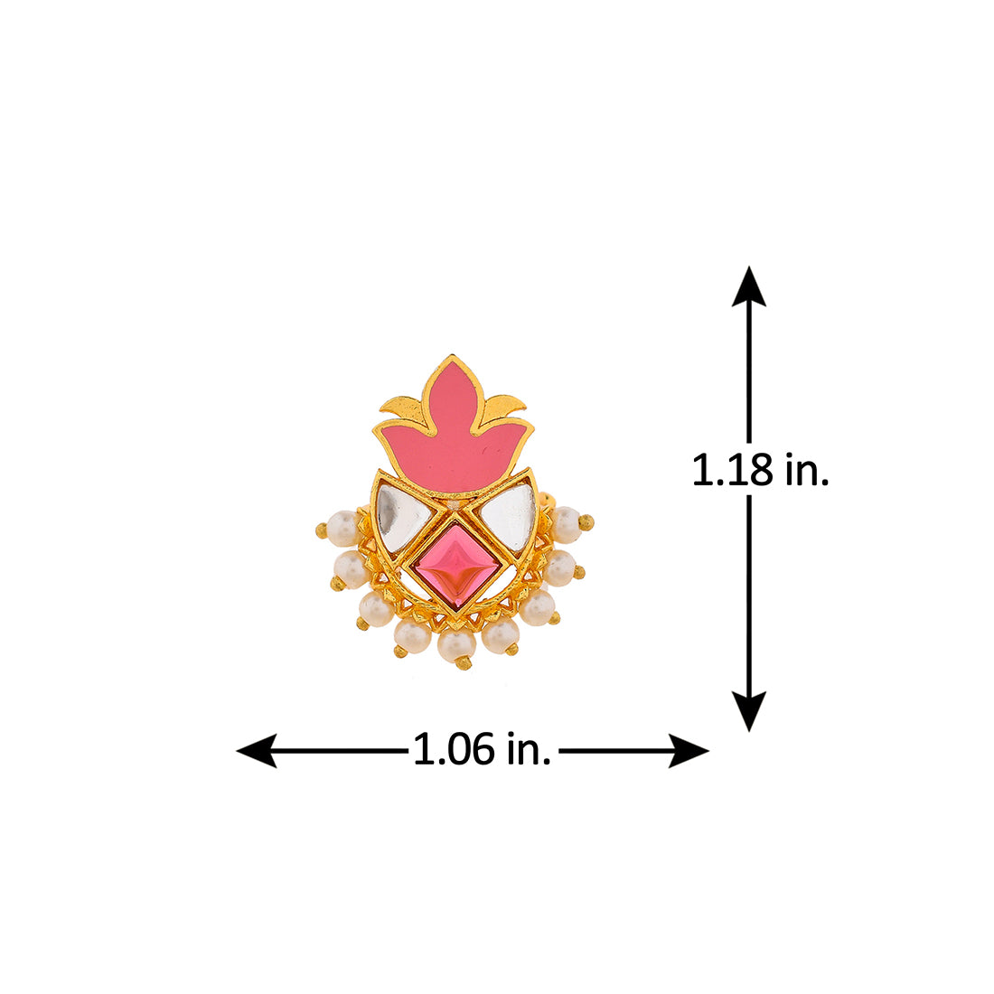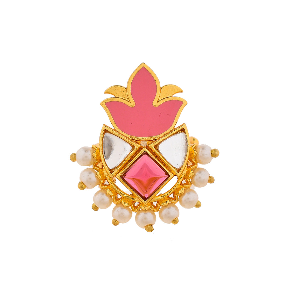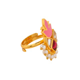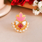 A beautiful enamelled ring with tulip motif. Enamelled and embellished with white pearls. Made from brass and yellow gold plated for added charm.