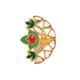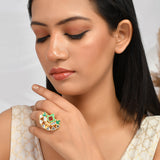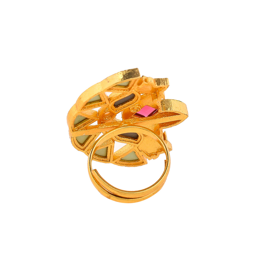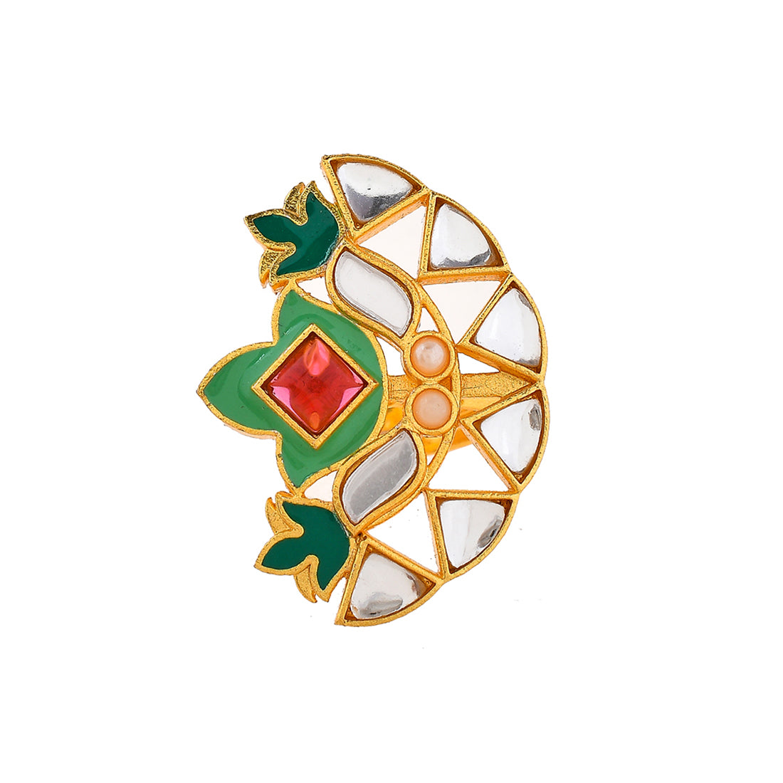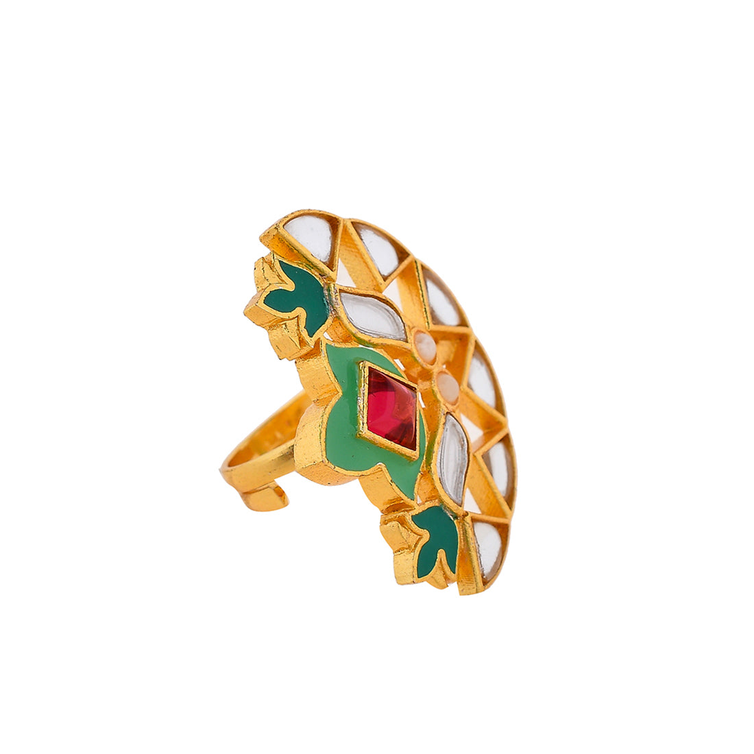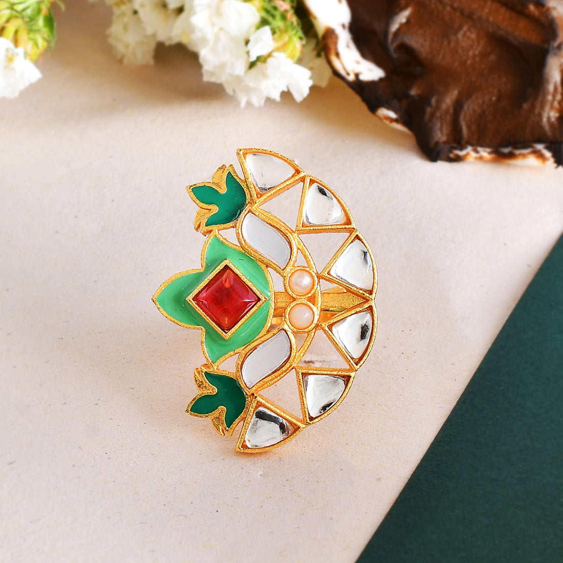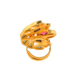 Floral cocktail ring, made from brass and yellow gold plated. Enamelled and embellished with pink stone. Pair with ethnic attire.