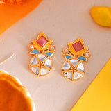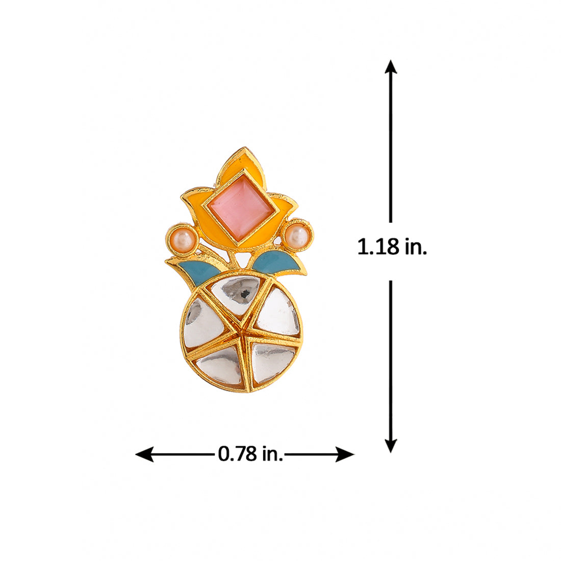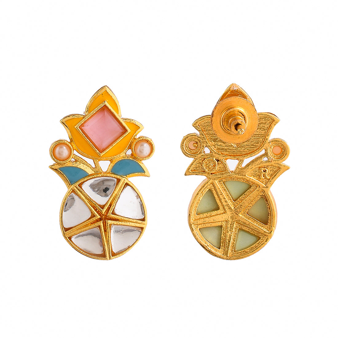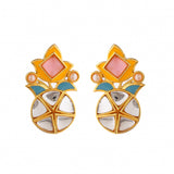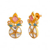 Stud style floral earrings with enamel details. Adorned with pink stone and white pearl, the pair has been crafted from brass. Pair the yellow gold plated earrings with ethnic attire.