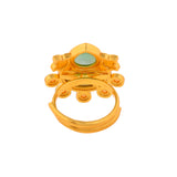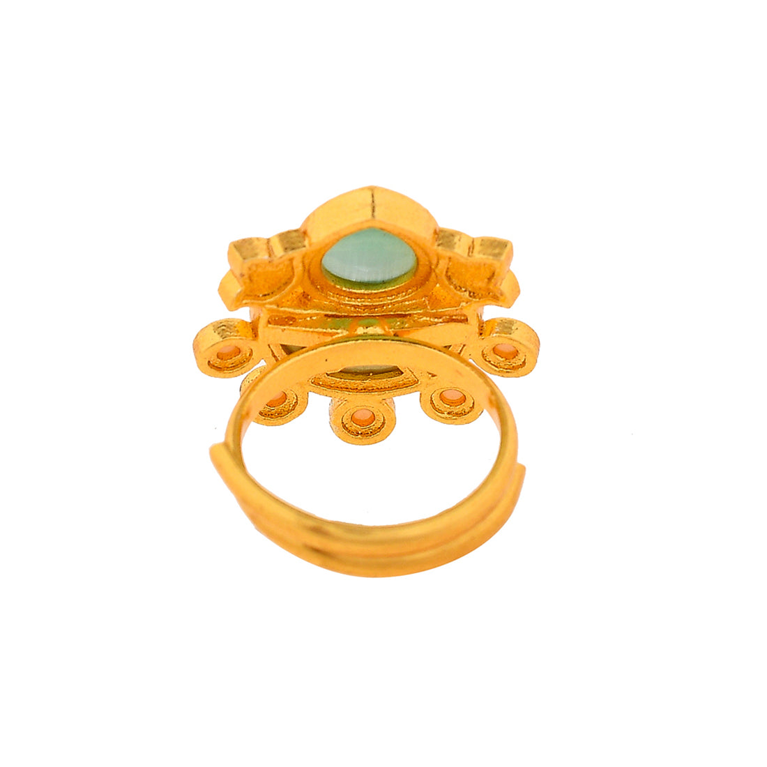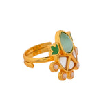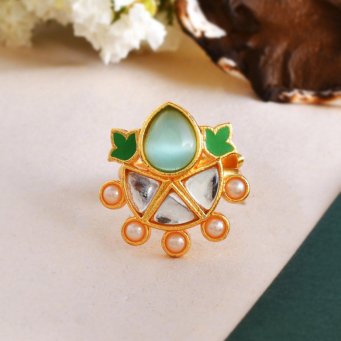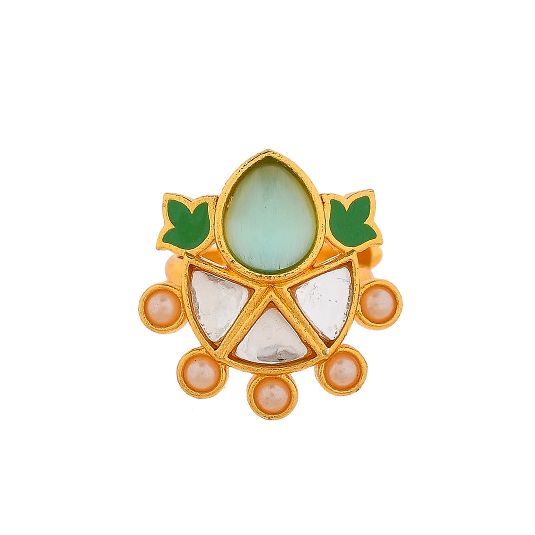 Green enamel and white pearls adorned floral ring with yellow gold plating. Made from brass and perfect for everyday as well as occasional wear.