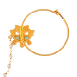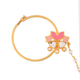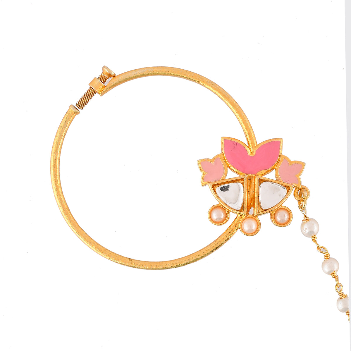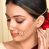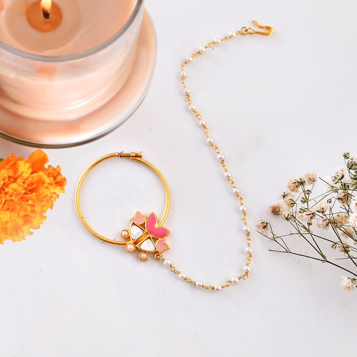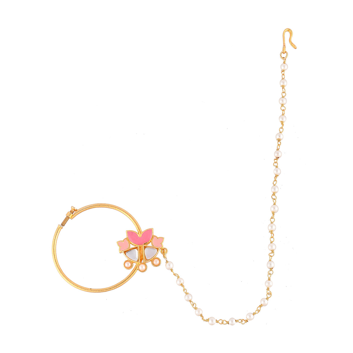 White pearl beads adorned brass non-piercing nose ring with yellow gold plating. Adorned with dainty floral motifs and enamelled, the nose ring can be paired with formal Indian and Indo-Western attire.