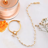 Brass nose ring in a classic Indian design with a sahara chain. Yellow gold plated and embellished with white pearl beads, the lightweight and comfortable nose ring will pair well with Indian formal attire as well as bridal wear.
