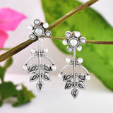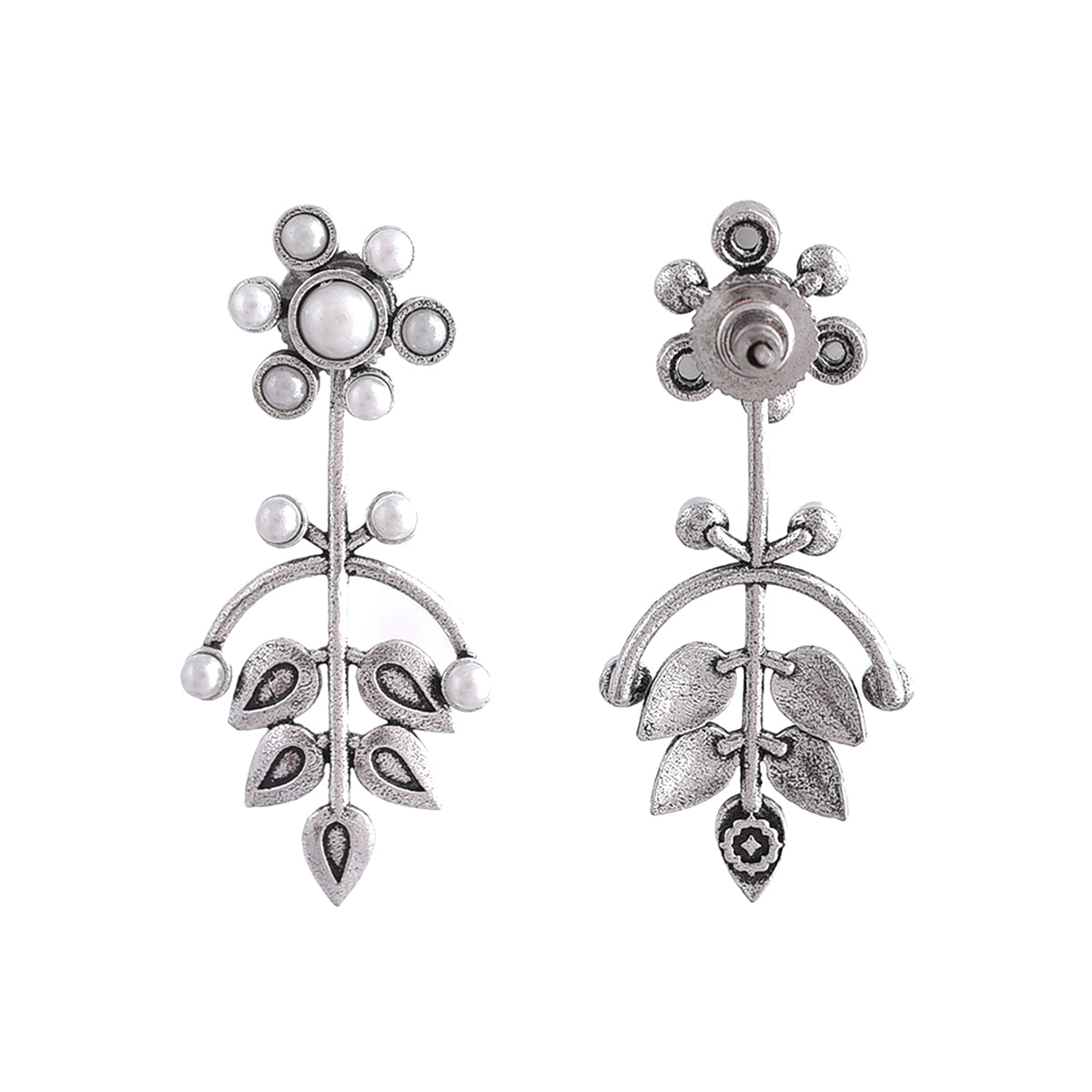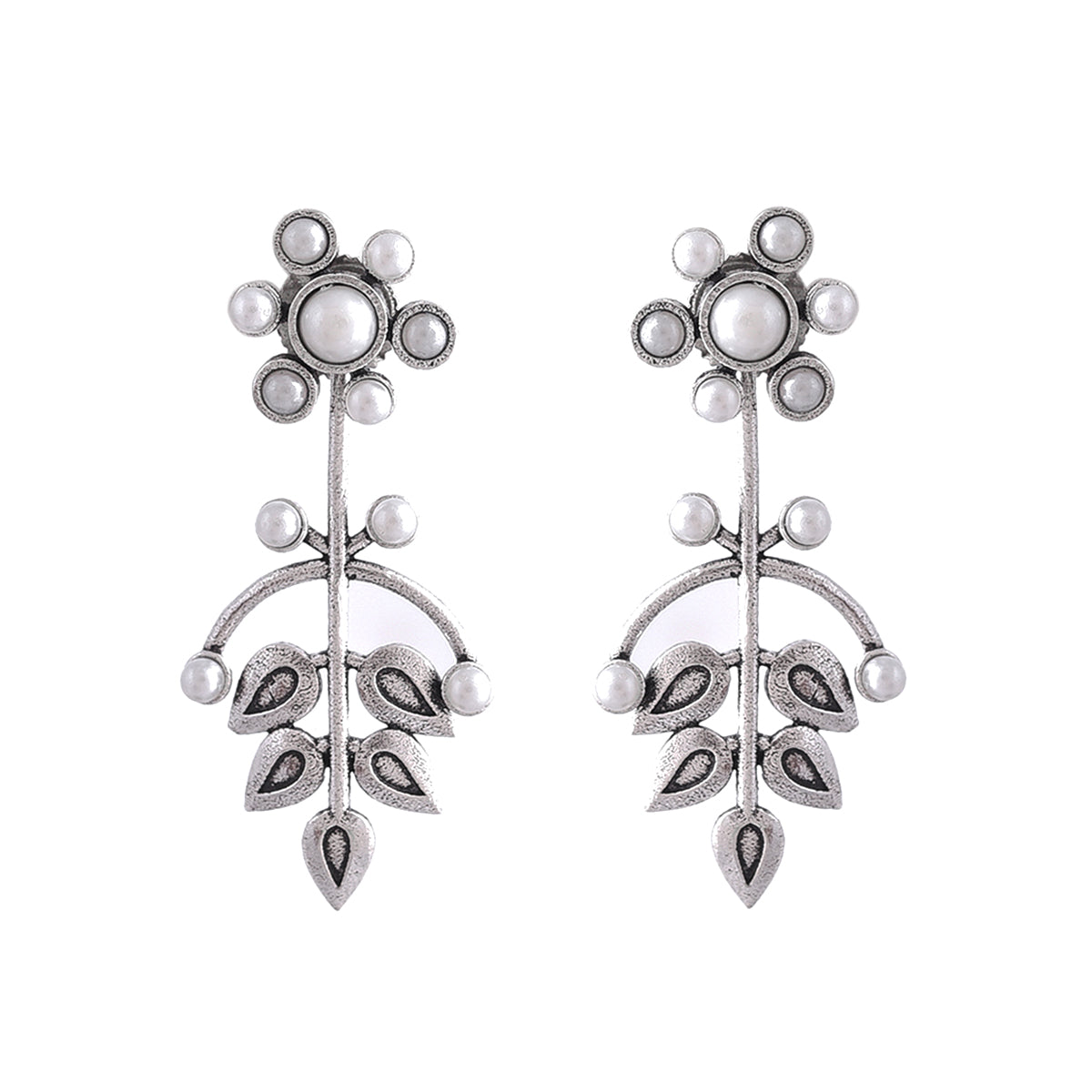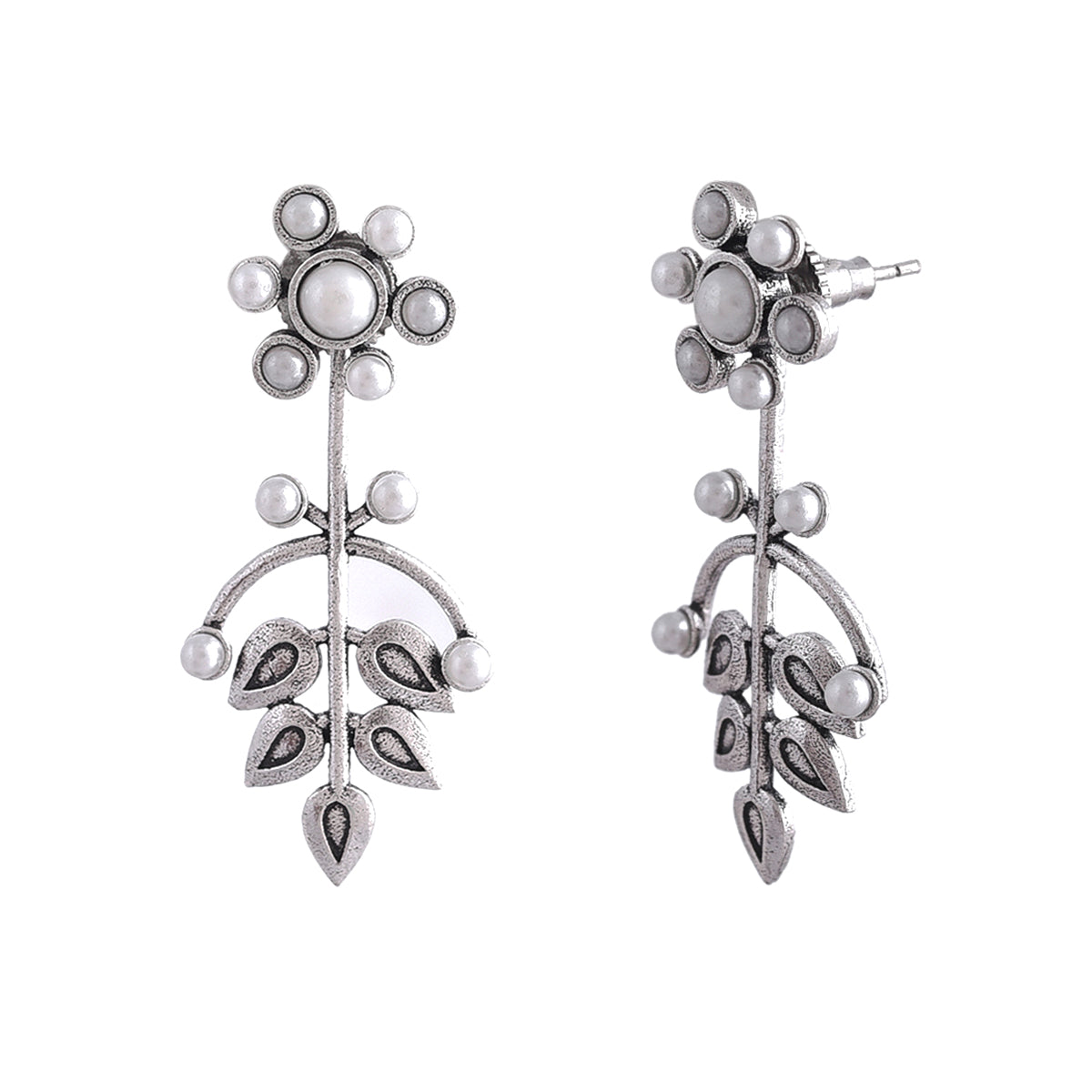 Edgy and eye-catching earrings dotted with white pearls, designed as a tribute to the lovely and resilient fern leaf. Made from brass, the delicate earrings have been given an oxidized silver plating. Pair with any of your favorite outfits.