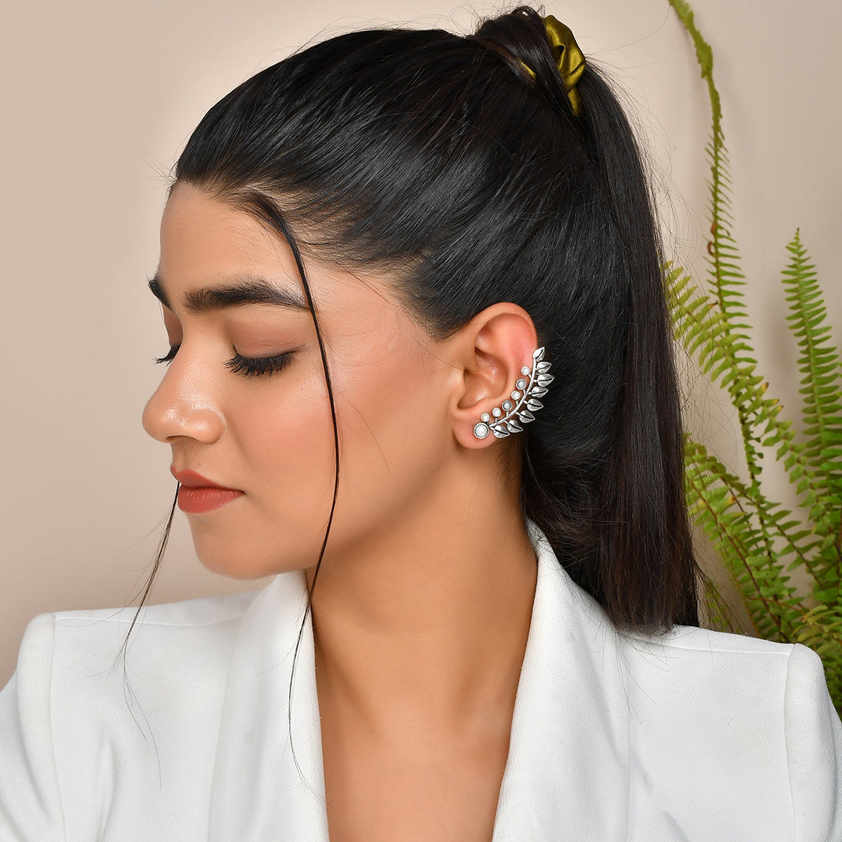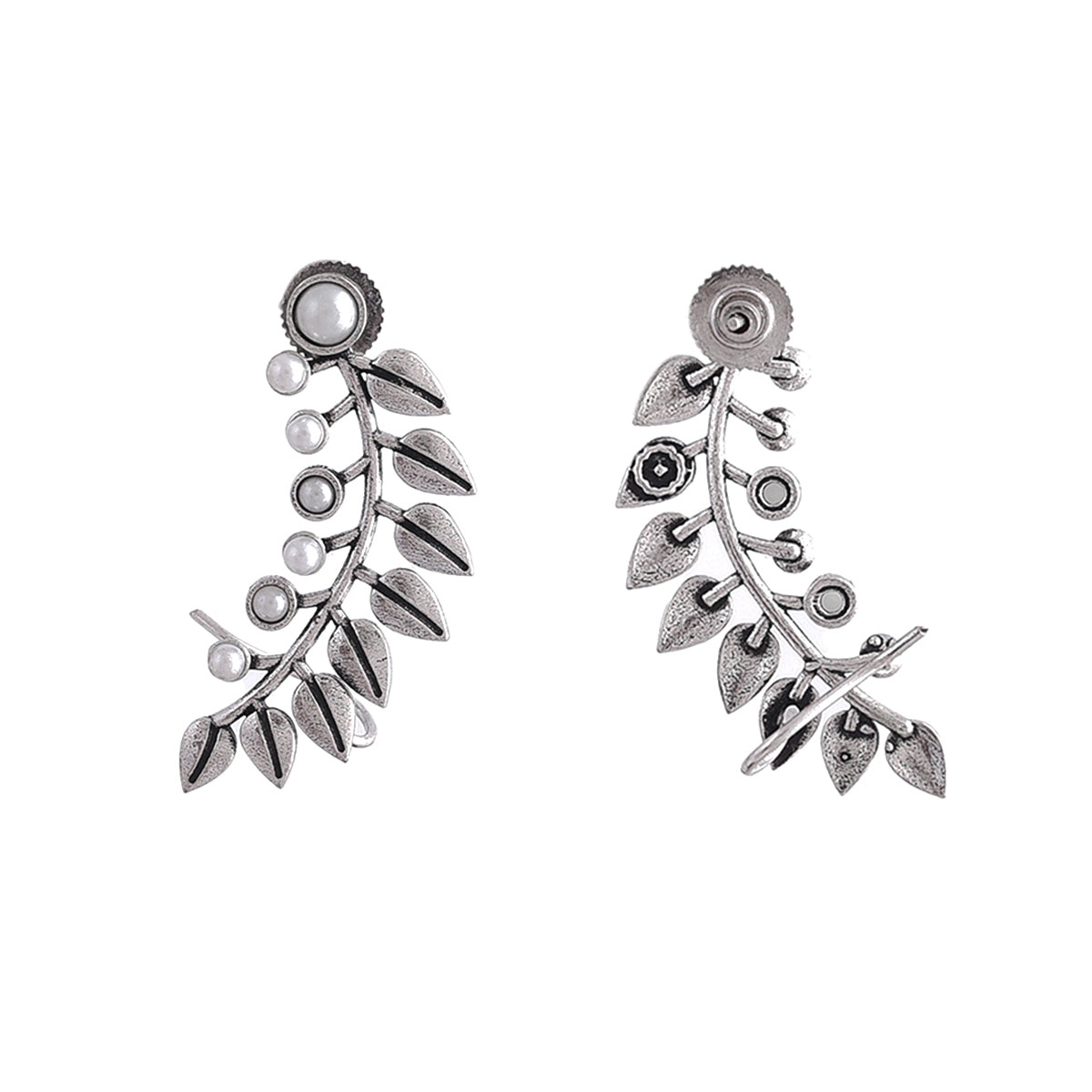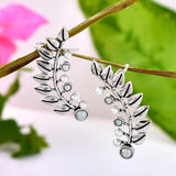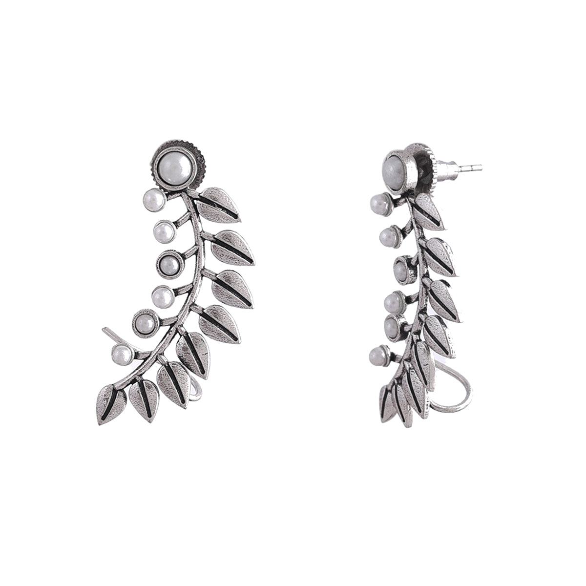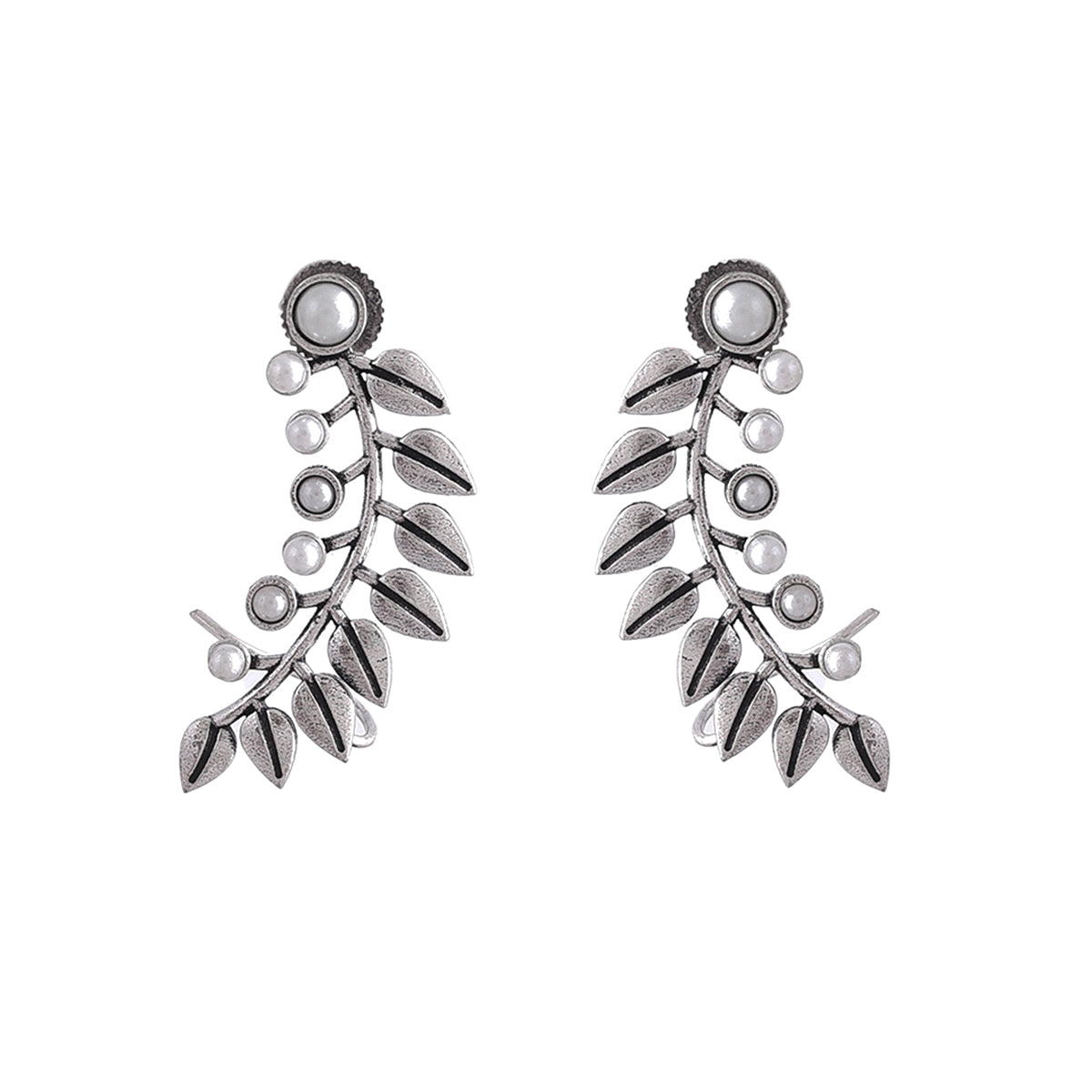 The beautiful resilient and lovely fern leaf has inspired these brass earrings, which have been dotted with white pearls. Oxidized silver plating adds to the charm of this versatile and comfortable pair.