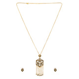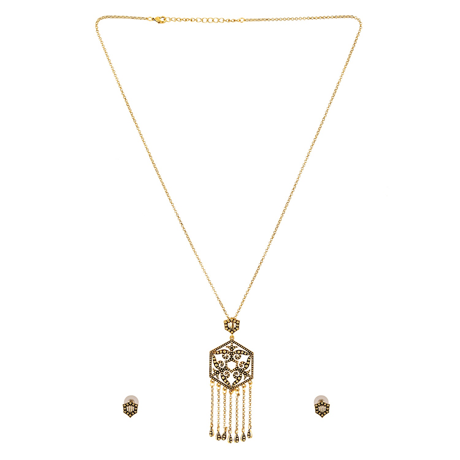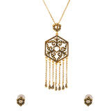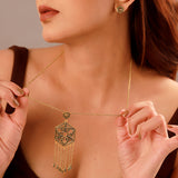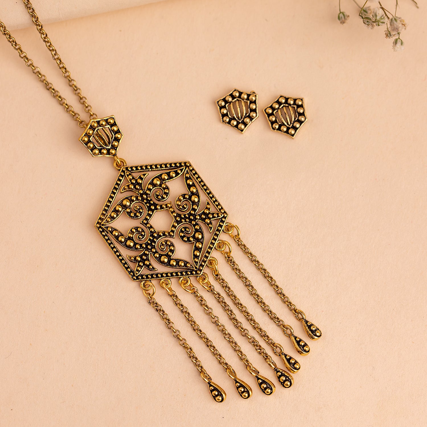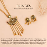 The Dramatic Fringe Pendant Set is an exquisite blend of opulence and movement, designed for the woman who loves to make an impression. This stunning pendant set showcases a hexagonal filigree pendant, intricately crafted with delicate beadwork that lends an air of sophistication. The pendant cascades into tassel chains, creating a dynamic fringe effect that enhances its statement appeal. Matching earrings echo the pendant’s artistry with similar detailing, ensuring a cohesive look. The oxidized gold plating over high-quality brass adds a vintage charm while preserving its luxurious durability. A signature piece from the Fringes Collection, this pendant set celebrates fluidity, motion, and effortless elegance, perfect for brunch outings, cocktail evenings, festive celebrations, and chic everyday wear. Whether styled with a flowing maxi dress for a boho vibe, a structured blazer for work, or layered over a casual western ensemble, this versatile piece embodies grace in every setting. An ideal gift for sisters, girlfriends, wives, mothers, and friends, it makes for a thoughtful present for Diwali, Rakshabandhan, Christmas, New Year, Valentine's Day, and other special occasions.