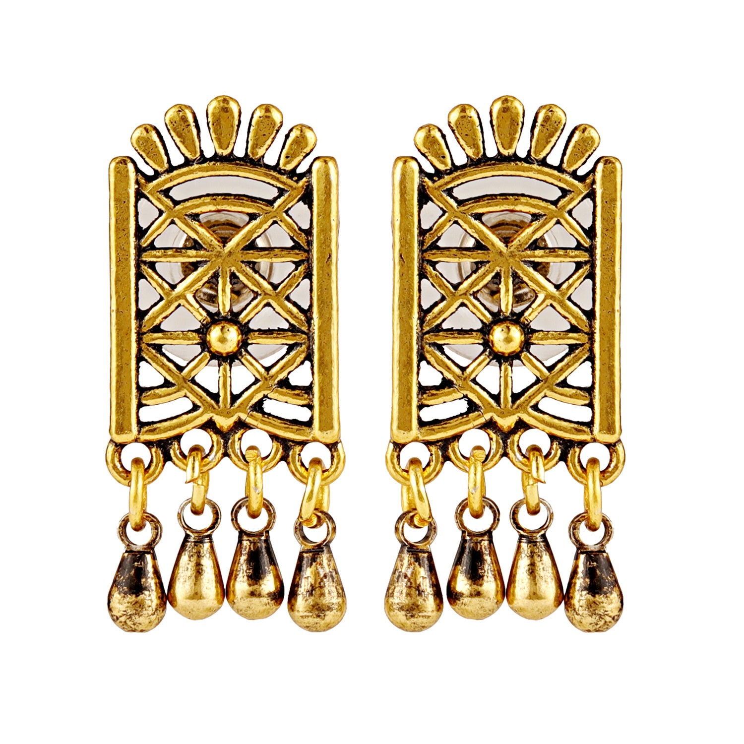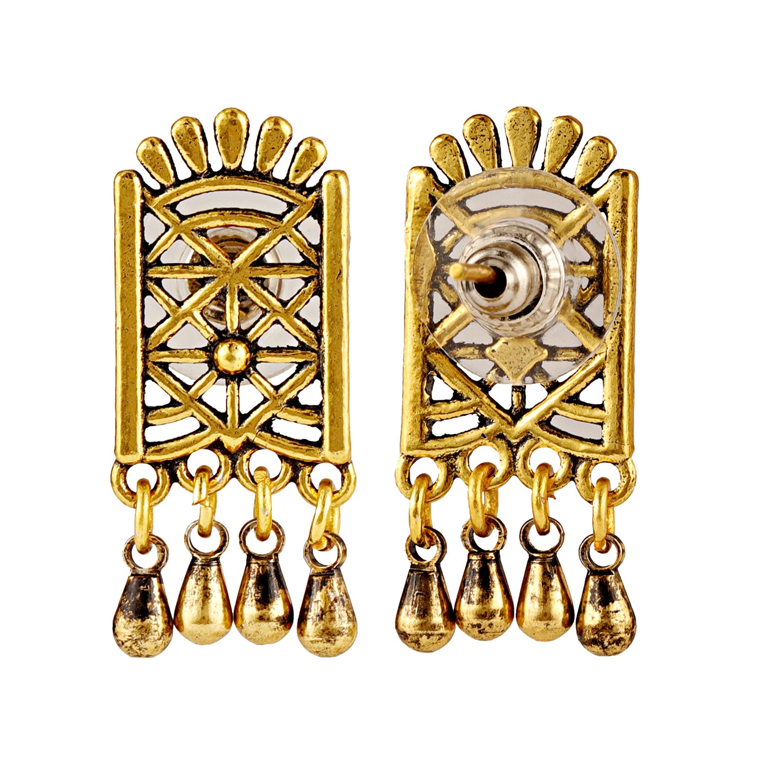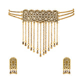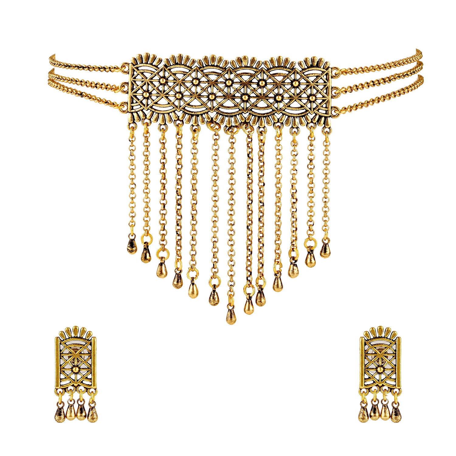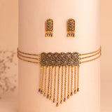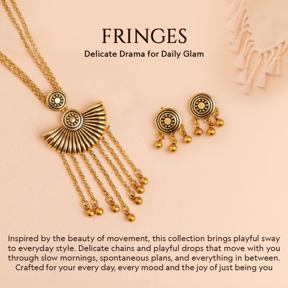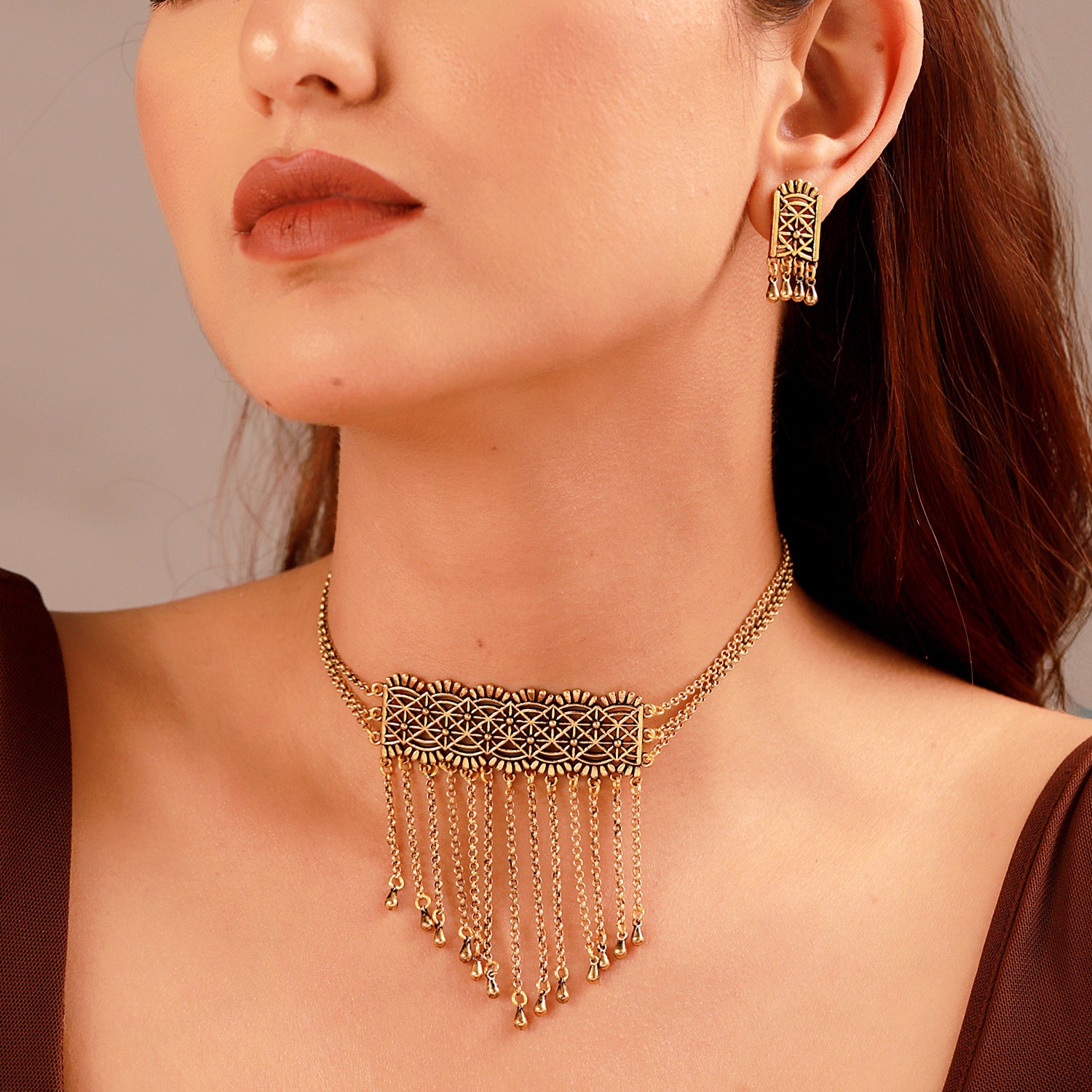 Step into elegance with the Weaved Fringe Choker Set, a stunning testament to movement, sophistication, and artistry. Crafted in high-quality brass and adorned with oxidized gold plating, this set embodies a free-spirited charm that effortlessly transitions between festive celebrations, casual brunches, and glamorous cocktail evenings. The choker is defined by its intricate woven texture, creating a mesmerizing interplay of patterns that drape delicately around the neck, enhanced by cascading fringe tassels that exude a sense of fluidity and grace. Paired with matching earrings that mirror the dynamic fringed aesthetic, this set is a bold yet refined statement piece perfect for those who embrace the blend of tradition and modernity. Its warm gold hue complements a spectrum of styles—be it western chic, boho-luxe, or ethnic glam—making it a must-have accessory. Whether you're searching for the perfect Valentine’s Day gift, a thoughtful Rakshabandhan surprise, or a dazzling Diwali treasure, the Weaved Fringe Choker Set ensures an unforgettable gesture of love and celebration.