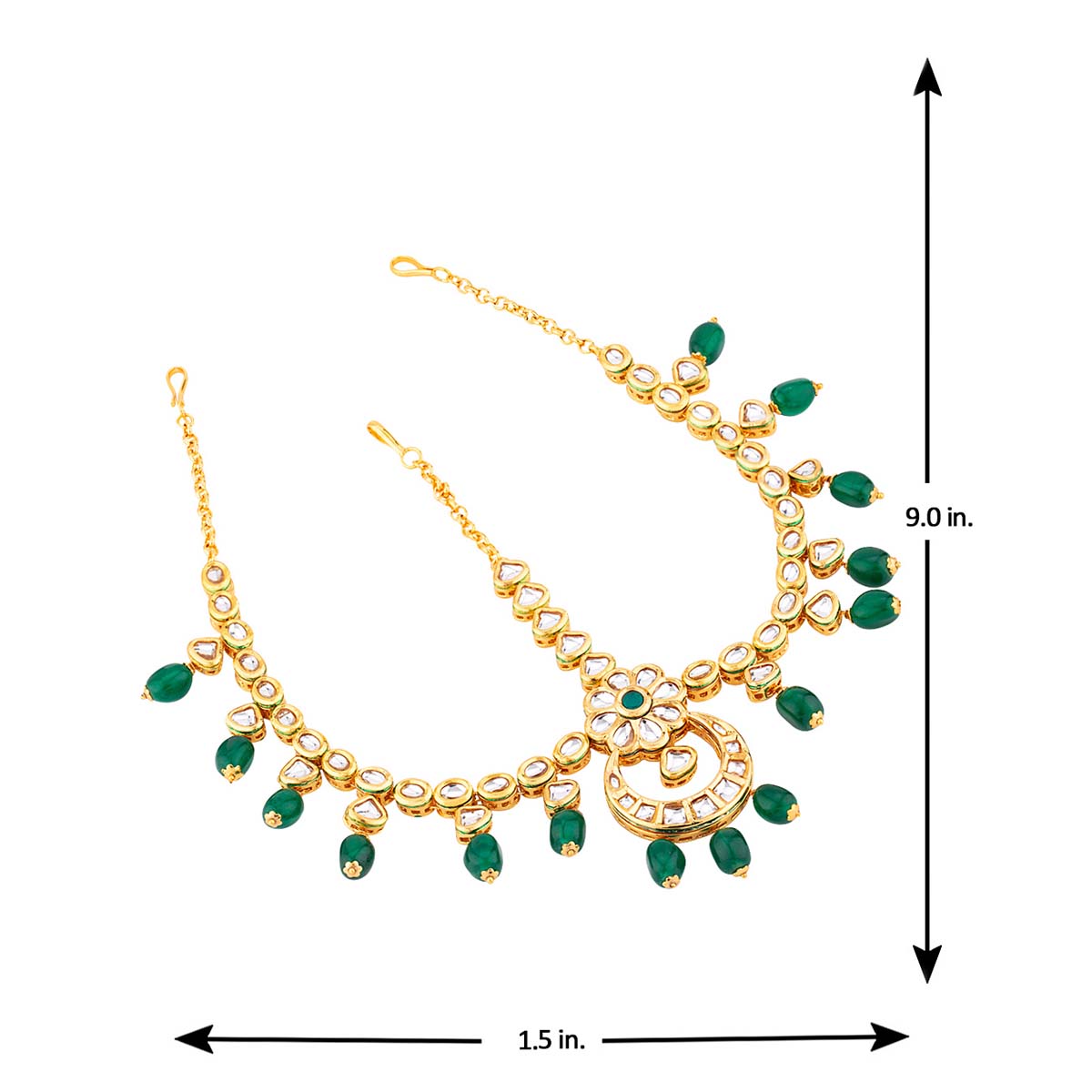 Gemstones embellished brass maang tika with yellow gold plating. Pair with Indian attire.