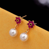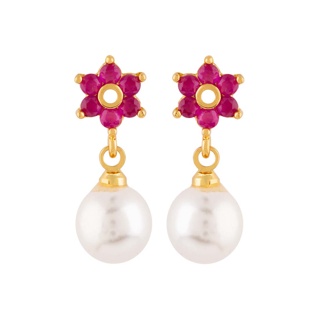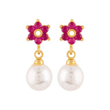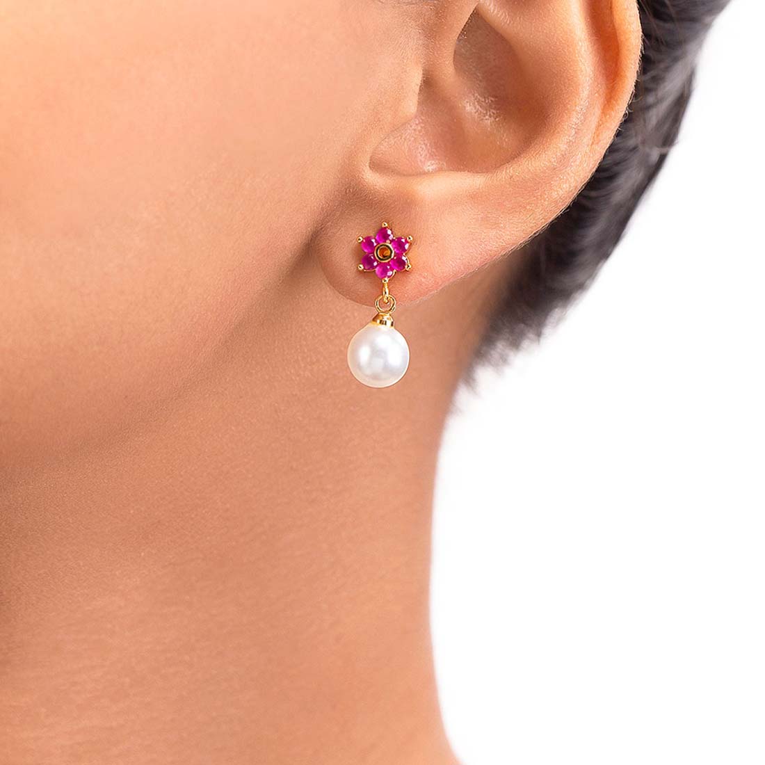 Floral motif earrings with faux pearls and gems. Made from brass and yellow gold plated. Pair with casual outfits.