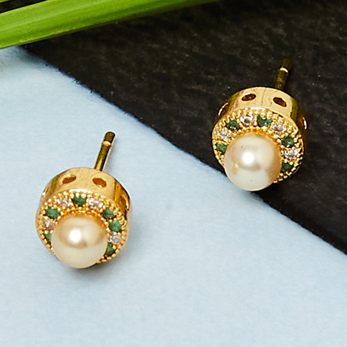 Gems and faux pearls adorned brass earrings with yellow gold plating. Pair with ethnic looks.
