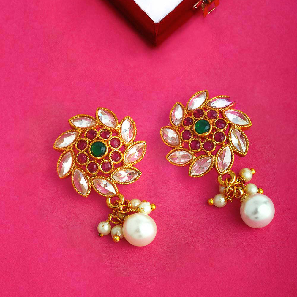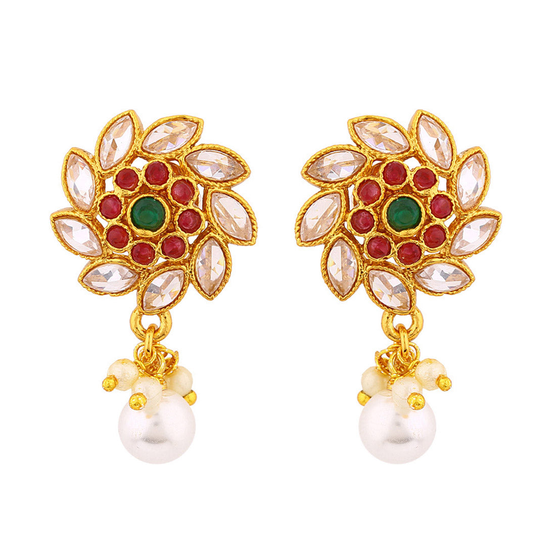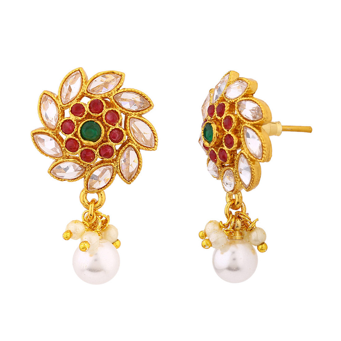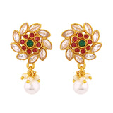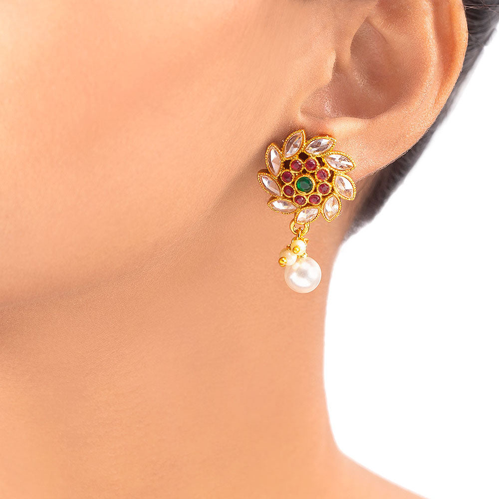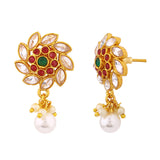 Floral earrings embellished with faux pearls and gems. Made from brass and yellow gold plated. Good match for ethnic wear.