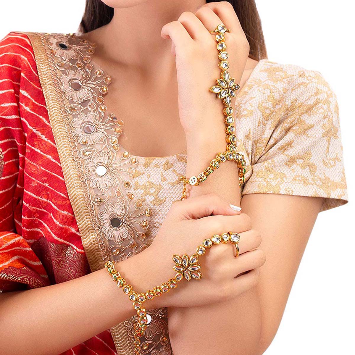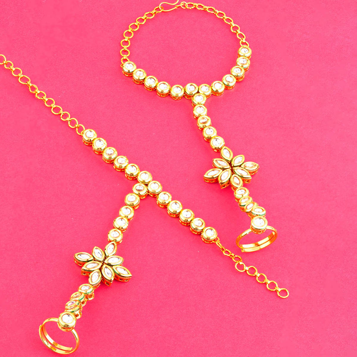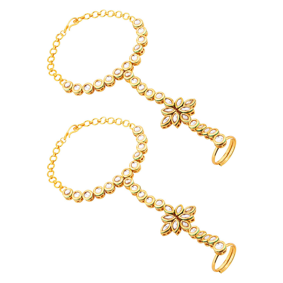 Gemstones embellished hath phool. Made from brass and yellow gold plated. Wear with formal ethnic and Indo-Western looks.