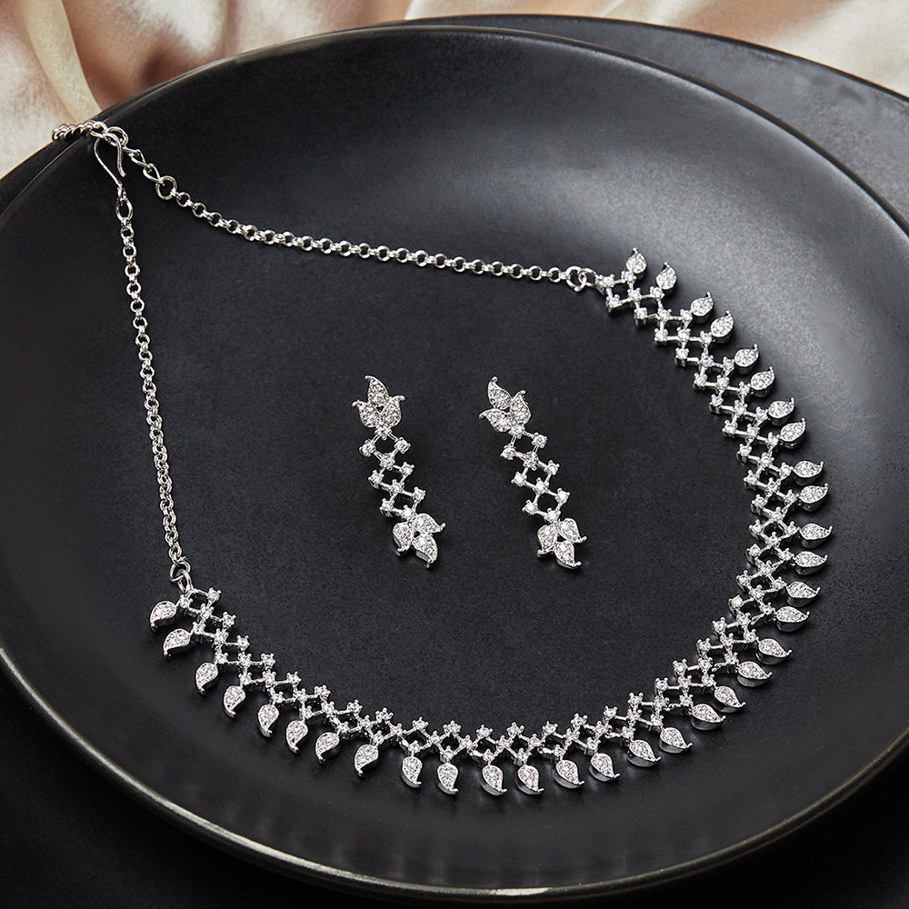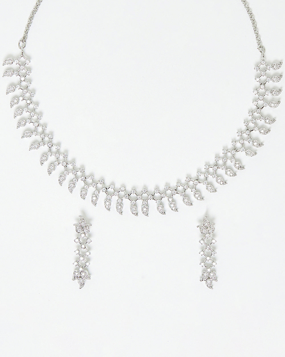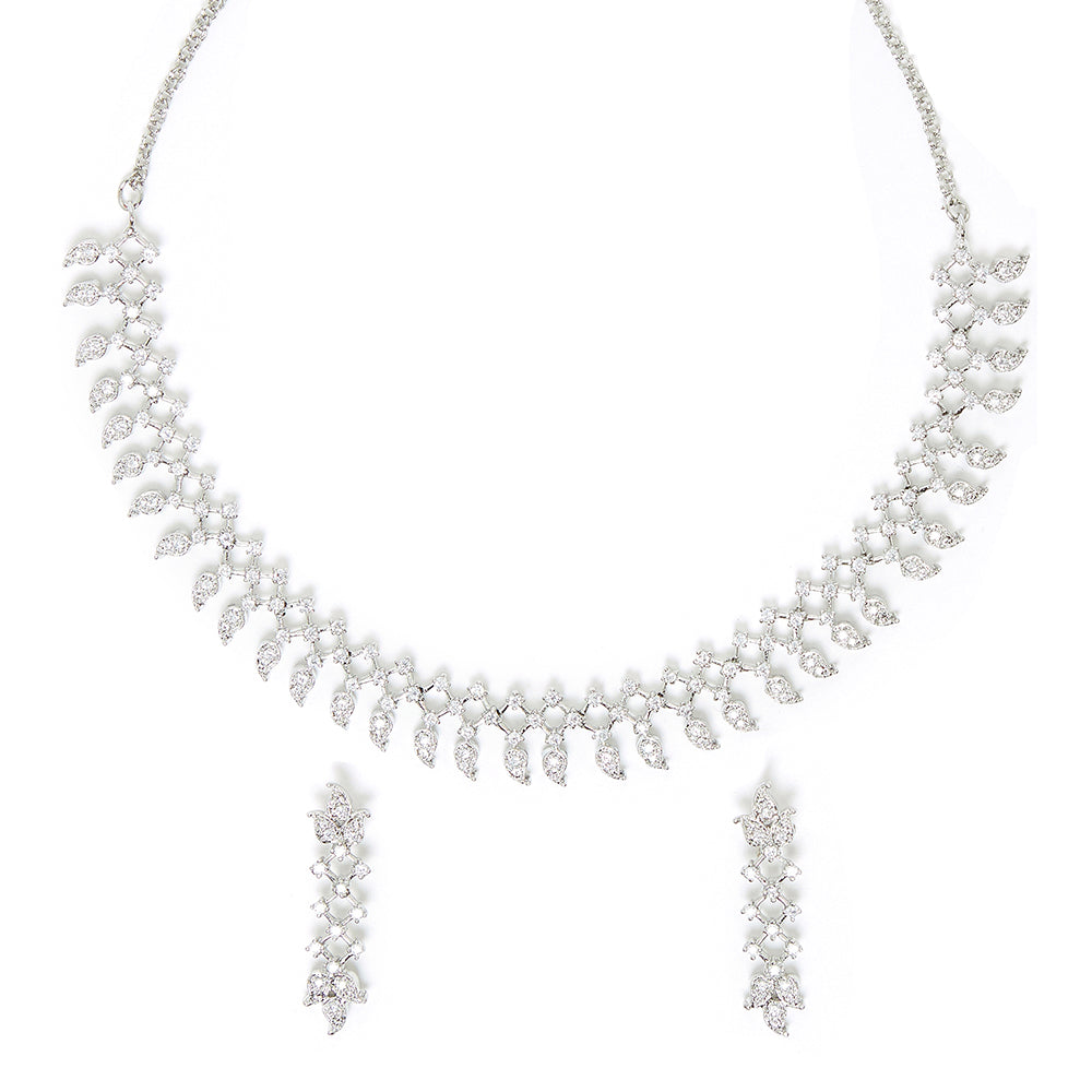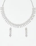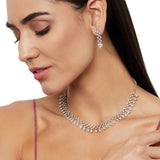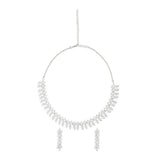 This elegantly styled necklace is crafted with high-quality brass and silver plating for a sparkling luxurious look. The dazzling earrings add a dramatic statement to this magical jewelry piece. Pair it with a long-neck evening gown or a traditional saree or lehenga to make a statement at your next event.