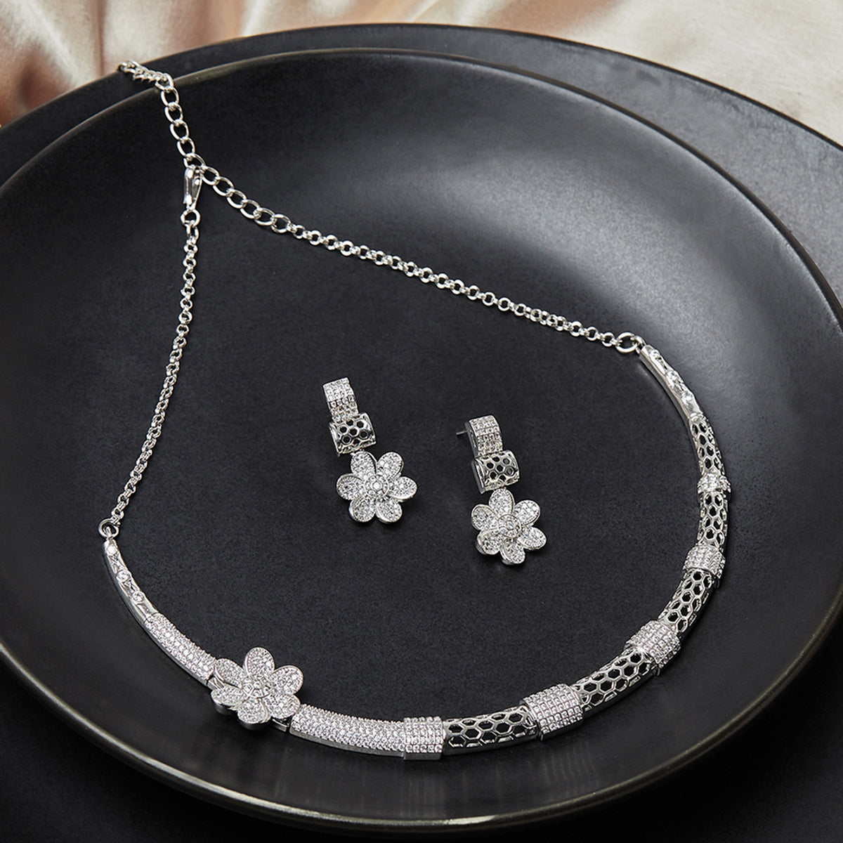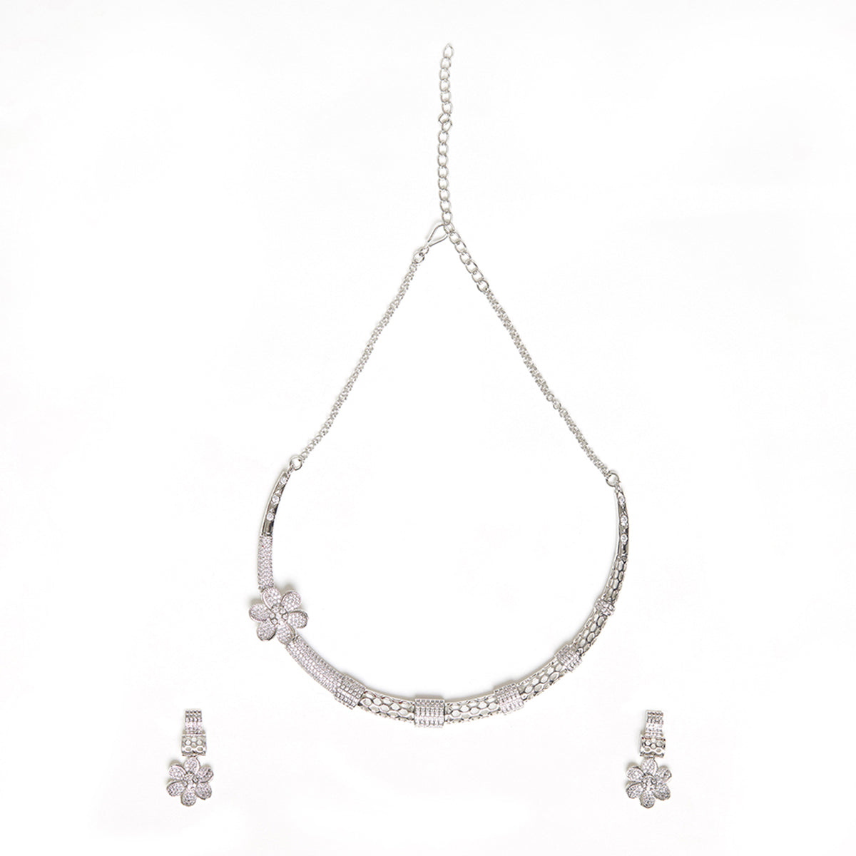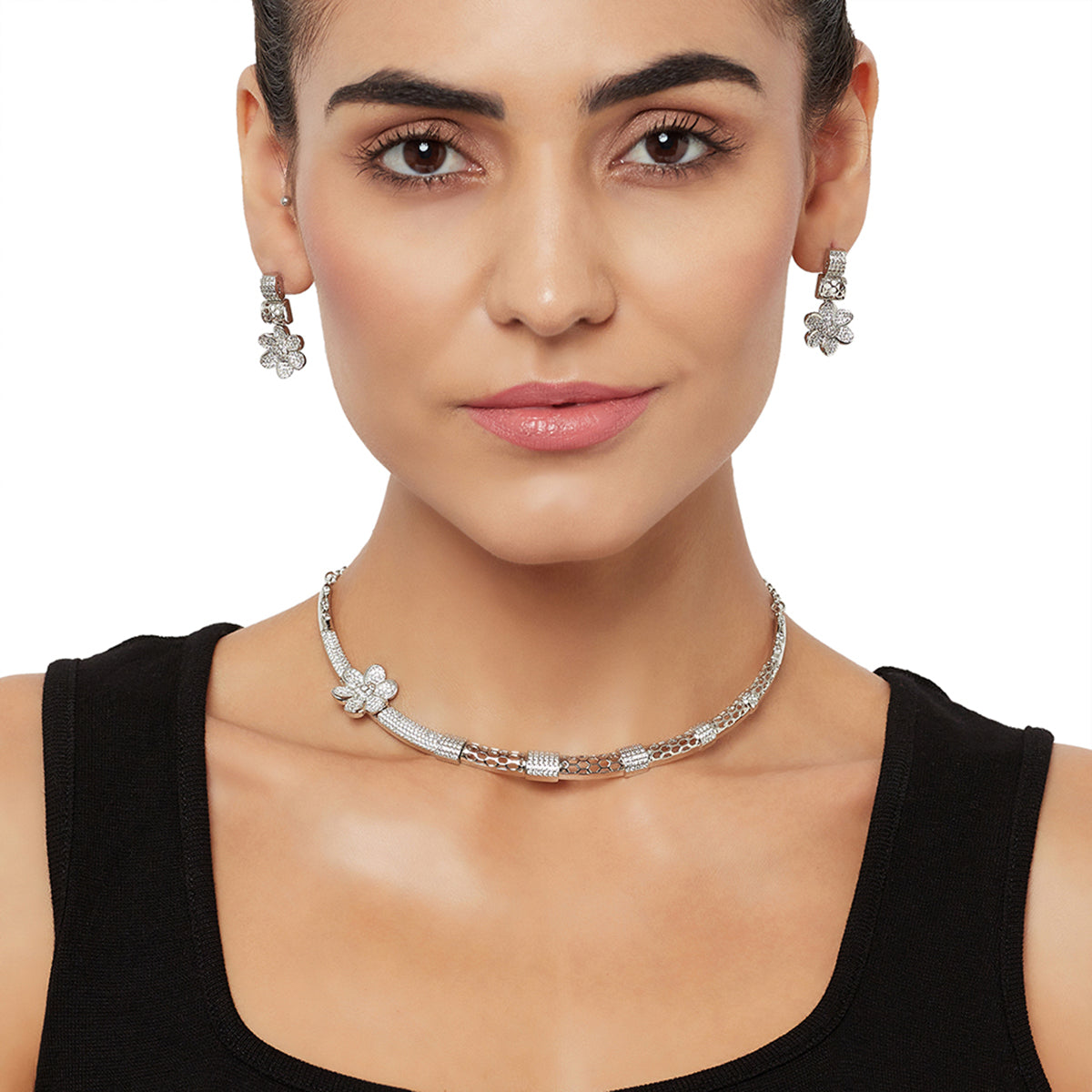 With its unique design, the choker necklace is brought to life with a spectacular floral design with CZ stones. It comes with a pair of floral drop earrings. It is a necklace that you can wear with your traditional as well as western outfits and elevate your festive/wedding look.