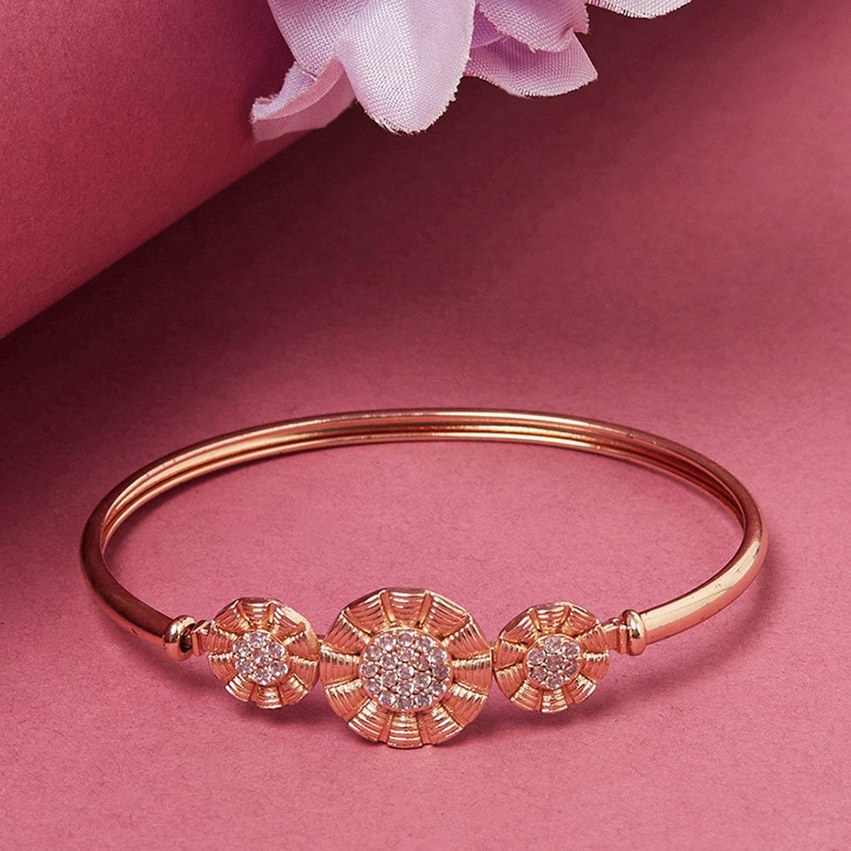 The delightful floral design in gold plating encrusted with CZ stones is enough to add to your smile at any given time. Pair this gorgeous bracelet with a black dress, denim, white kurti, crisp office shirt - the list is endless. The versatility of the design makes it a must have.
