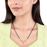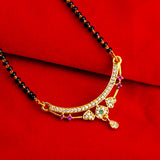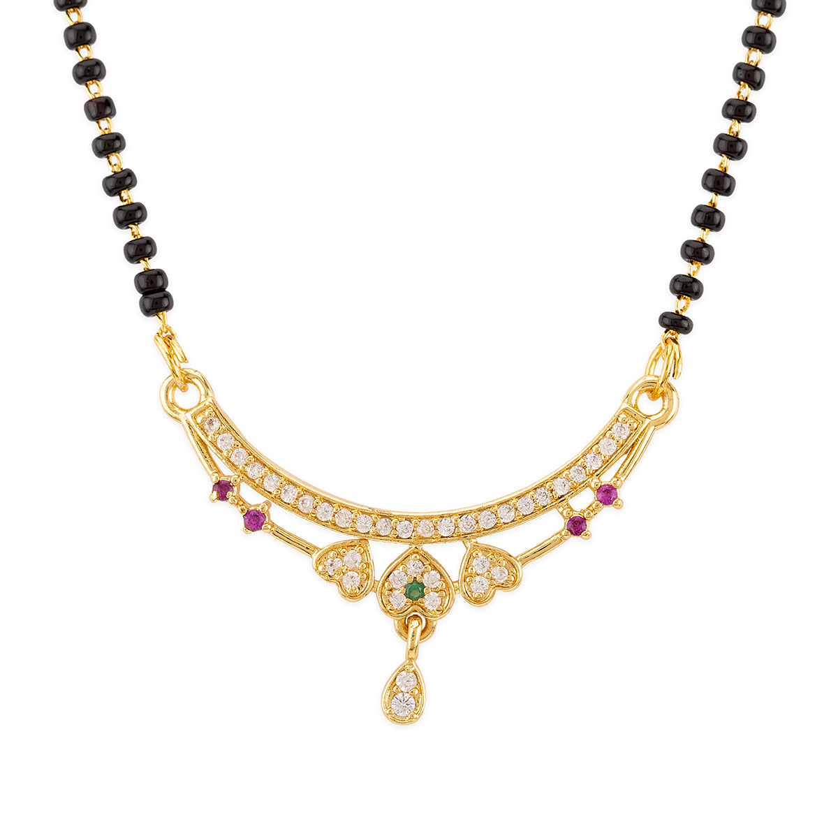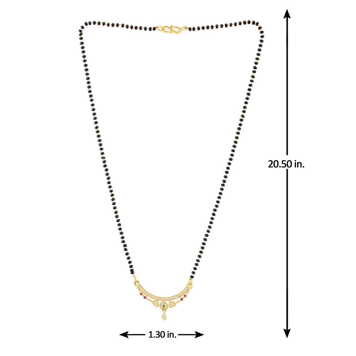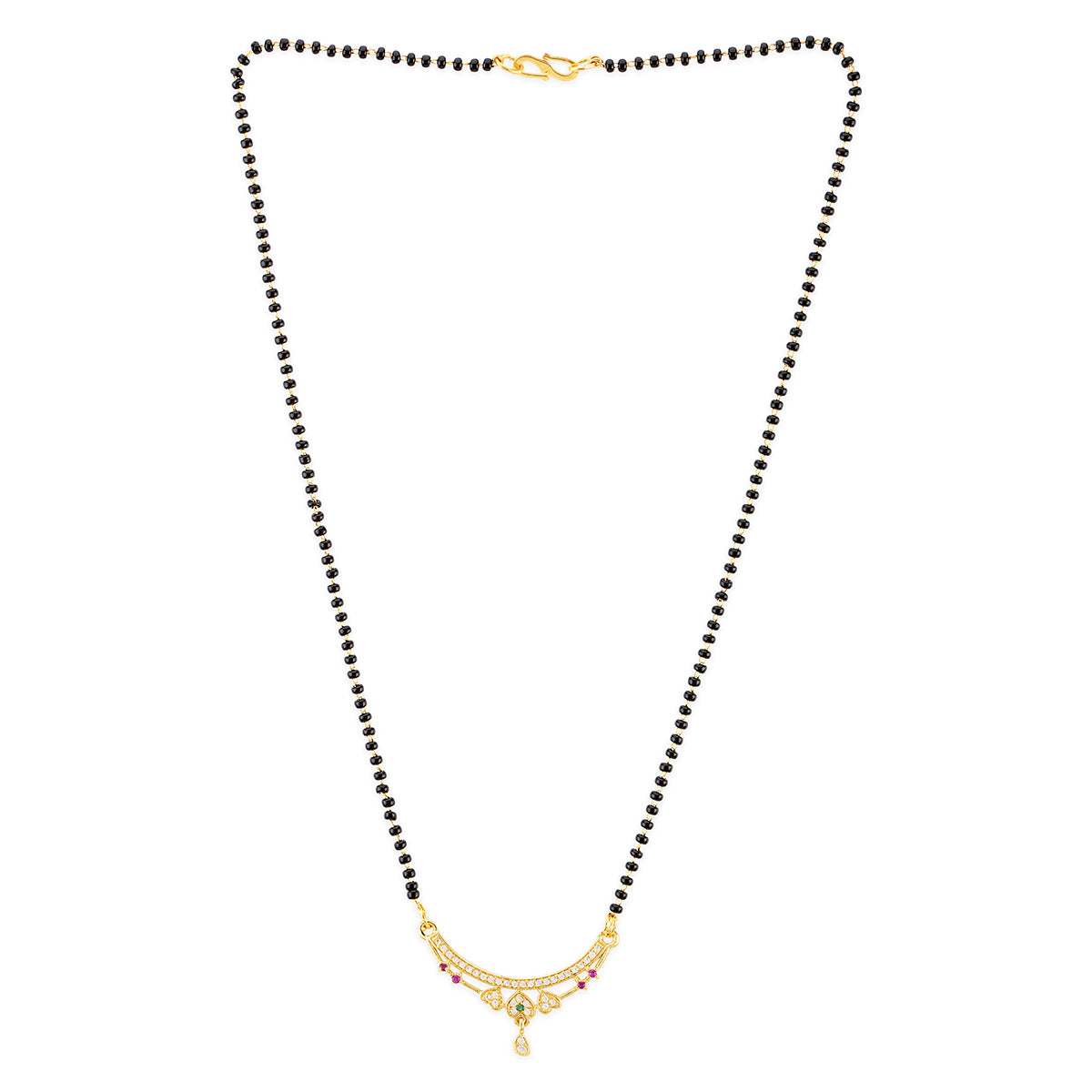 Here we bring to you this designer mangalsutra in a stylish look. It is decked with precious American Diamond stones and features wonderful carving design. In addition, the die gold finish chain is woven with black color beads and made from metal. It is superior in quality and rust resistant as well.