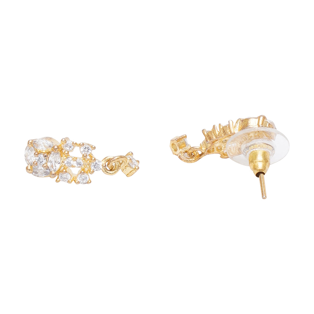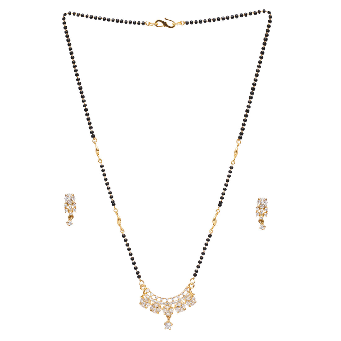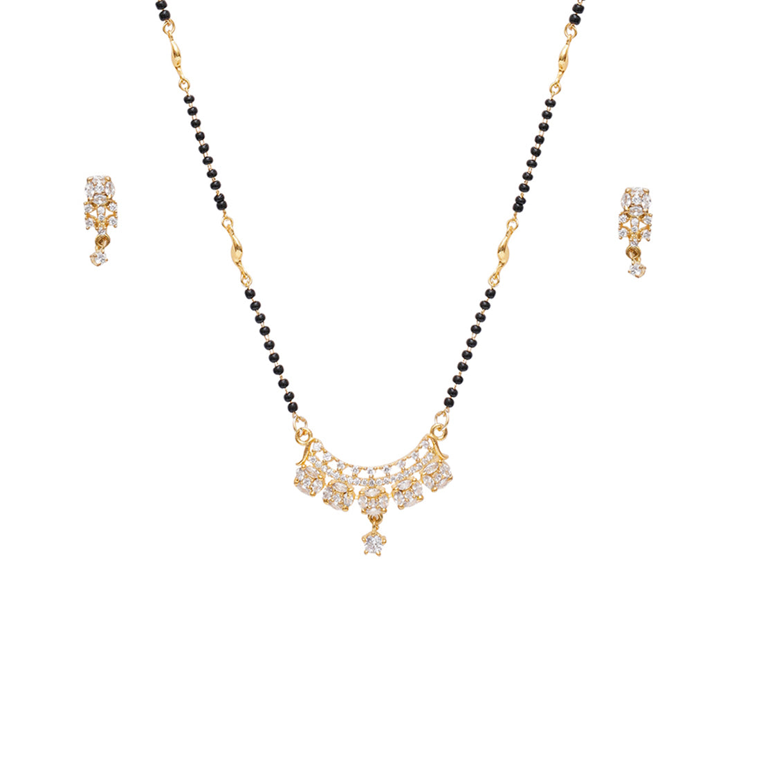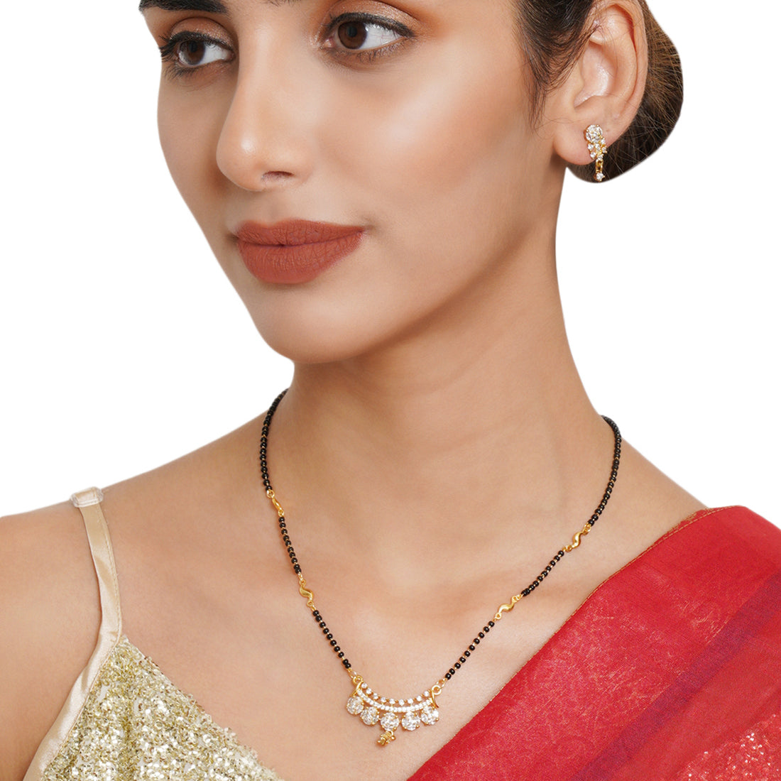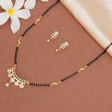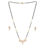Brass single-string mangalsutra with a pair of matching earrings. Pearl drops and gold plated, this set can go well with Indian outfits.