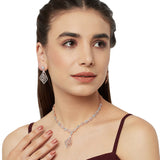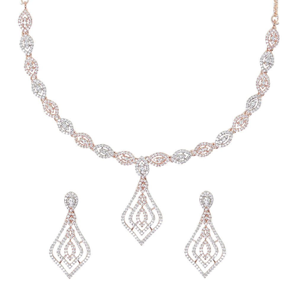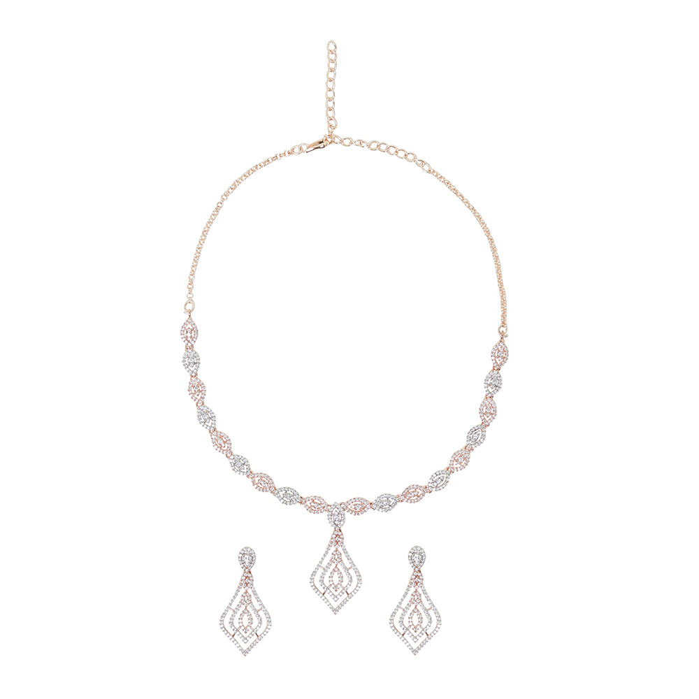 Give a touch of elegance to your look b donning this neckpiece with a pair of earrings. It is crafted with brass and a smooth rose gold plating. Featuring a teardrop design studded with sparkling CZ stones, this necklace set is sure a show stealer at a wedding or special occasion.
