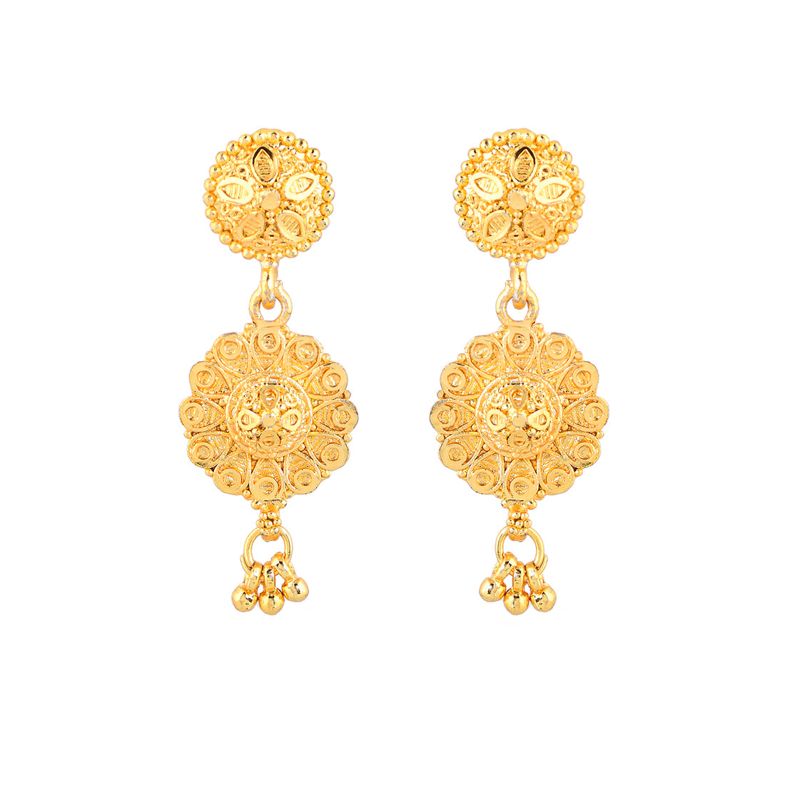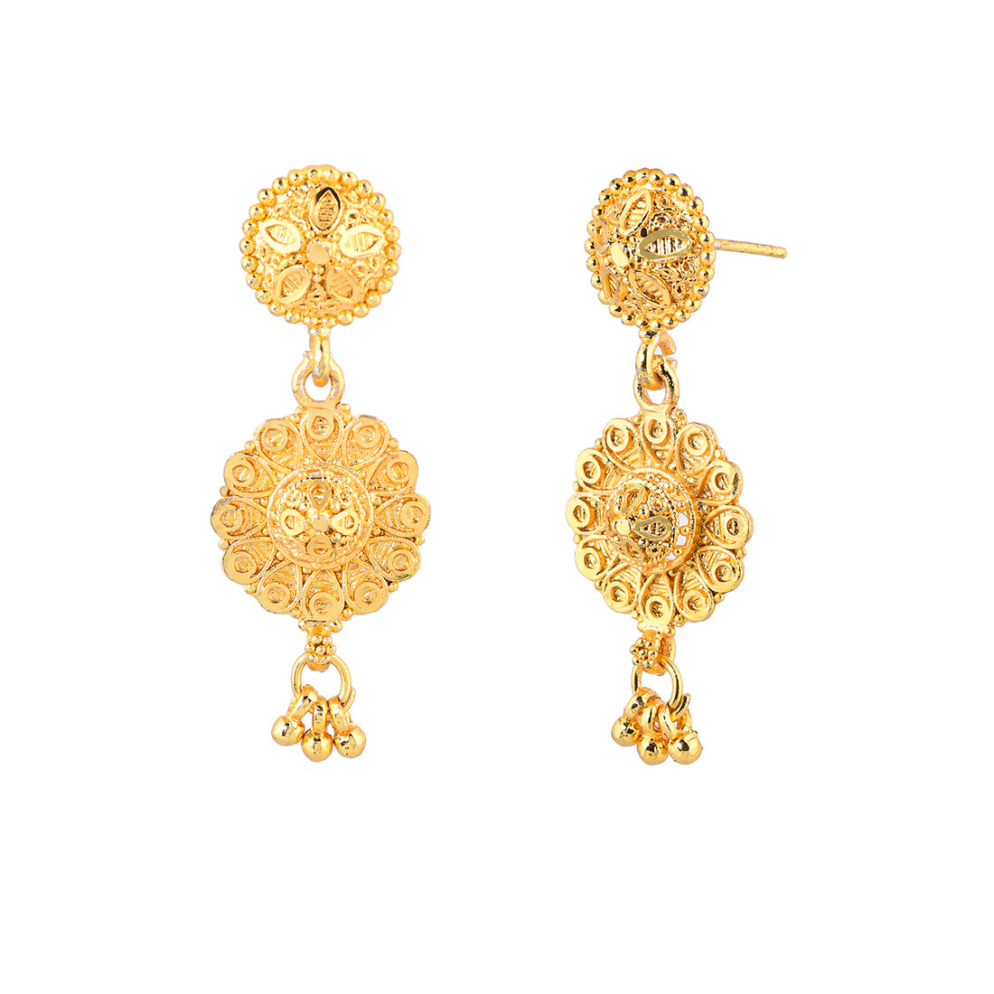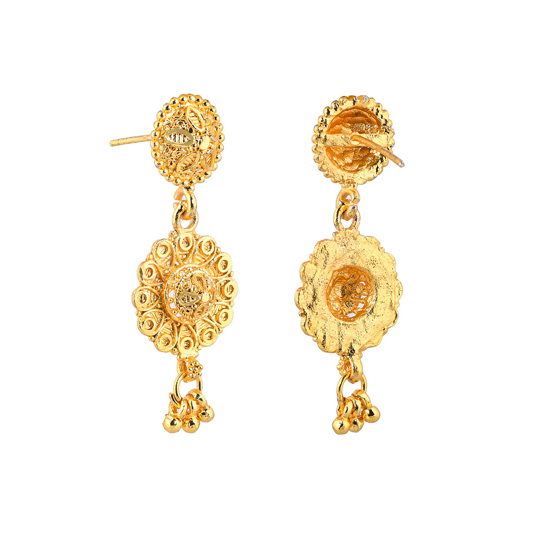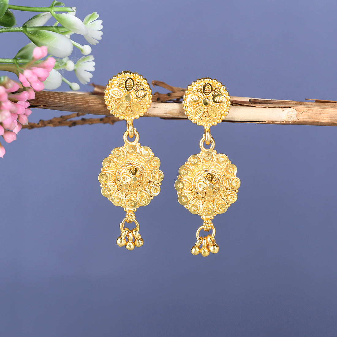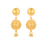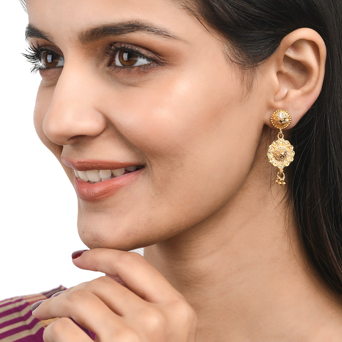 Elevate your style statement instantly with these traditional jhumka earrings, fashioned out of brass. Featuring a traditional design with gold plating, making it perfect for any festive wear. Team them with an ethnic saree or suit for a gorgeous look.