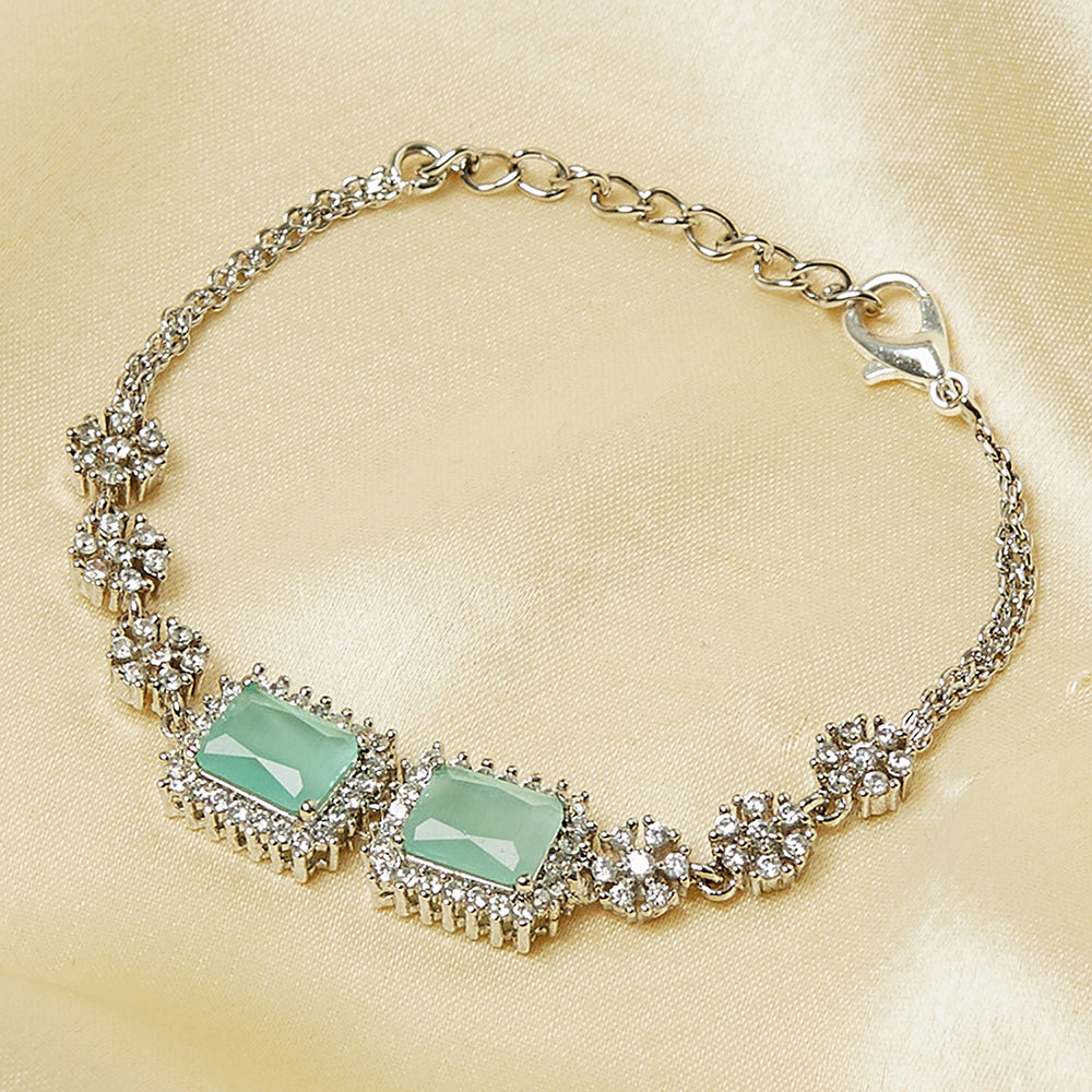 The bracelet are the Universal jwellery that the women worn it beautifully in her wrist. With the tremendous combination of colours like sea blue gemstone and silver brass material,the look of your women will become so classy. The silver plating with CZ sea blue gemstone of the bracelet will enhance your beauty. You can pair them up with any Western as well as traditional dress.