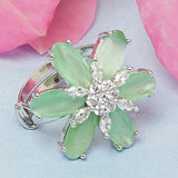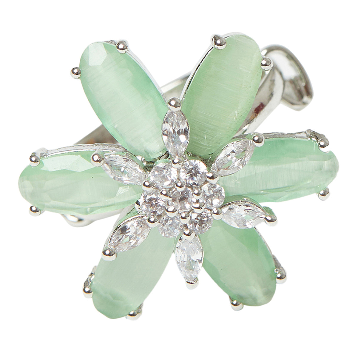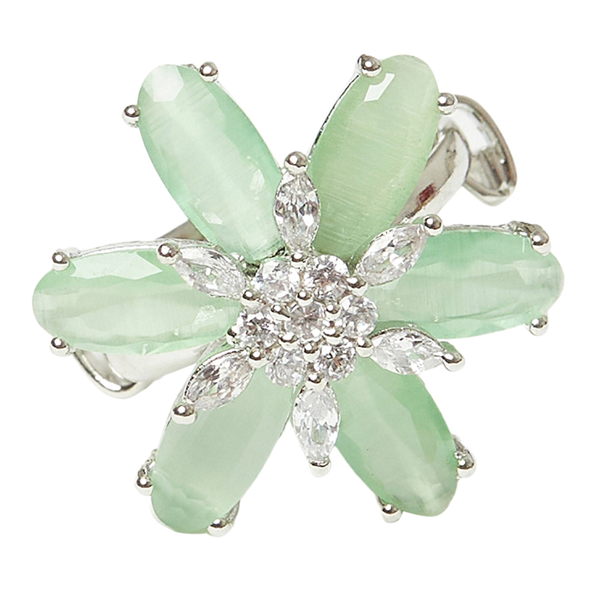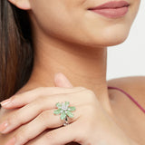 Sparkling Elegance silver plated brass rings catch everyone's eyes towards its outstanding new design. The ornament is Handcrafted with sea green colored stones in a beautiful flower shape; women can add another piece of royalty to their jewelry box. Rings symbolize wealth and power. Embrace and celebrate your beauty with this ring that goes well with all your attires.