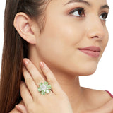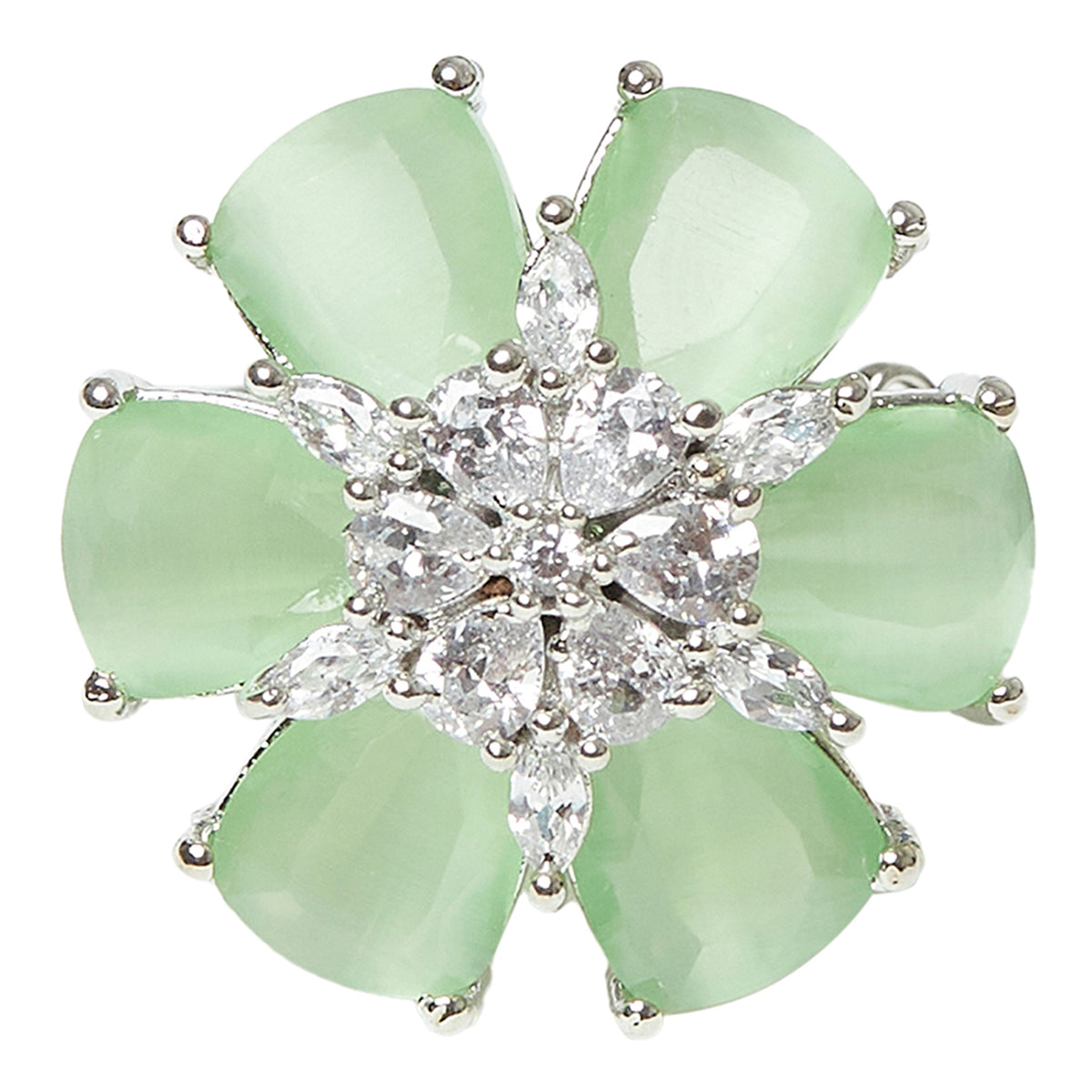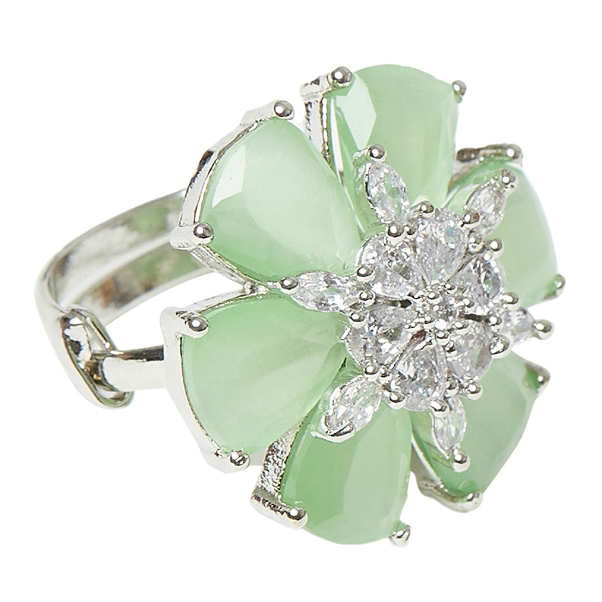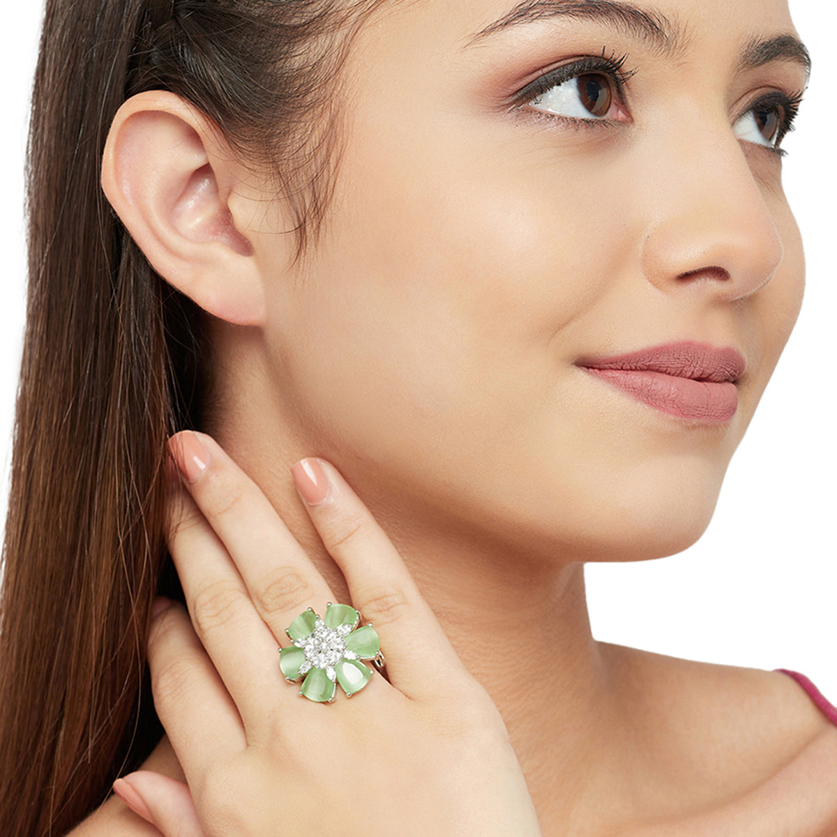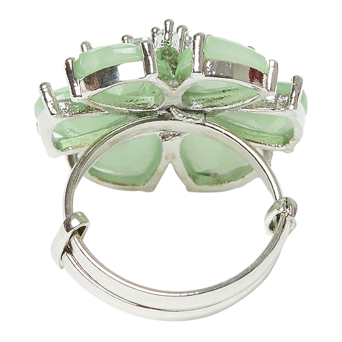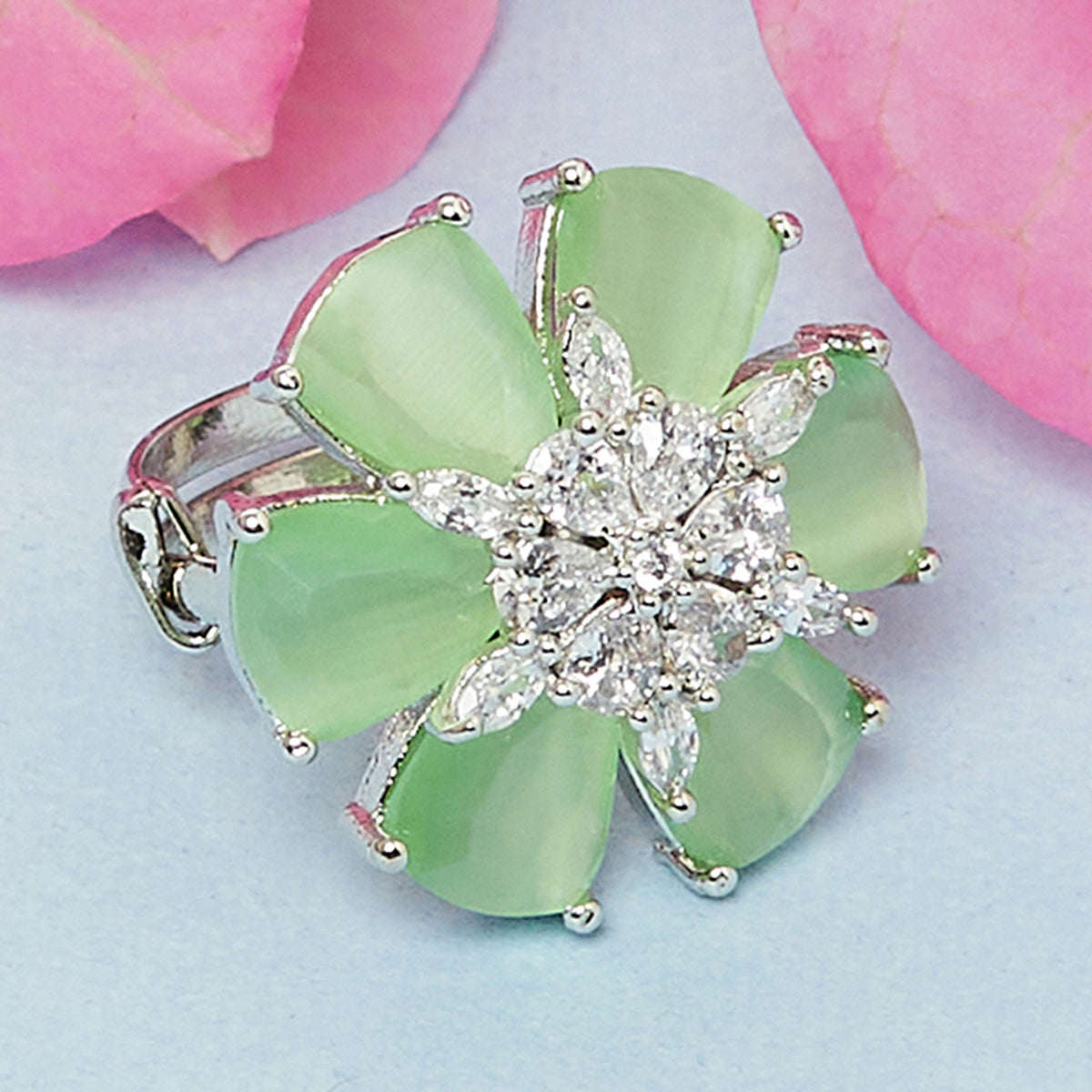 Sparkling Elegance Collection added an entirely new range of exceptional colored stone rings to its exhibition. Handcrafted with seafoam green colored stones and styled in a precious five-petal design goes well with Ethnic and Western attires. Women carrying it flaunt their elegance to everyone around. The silver plating adds five stars to the ornament.