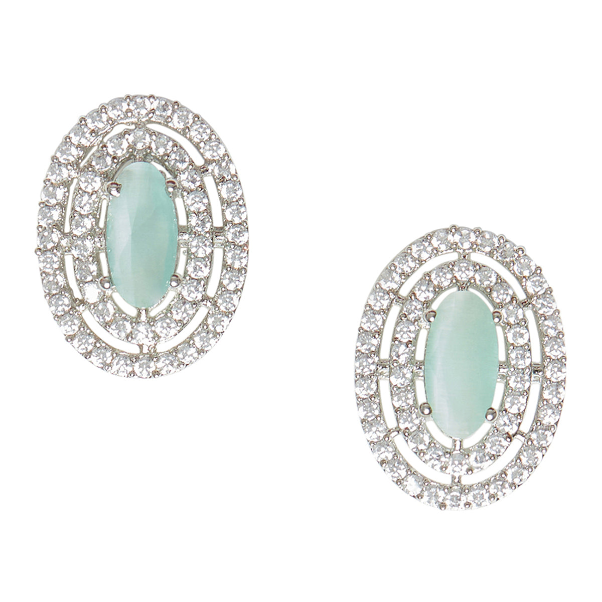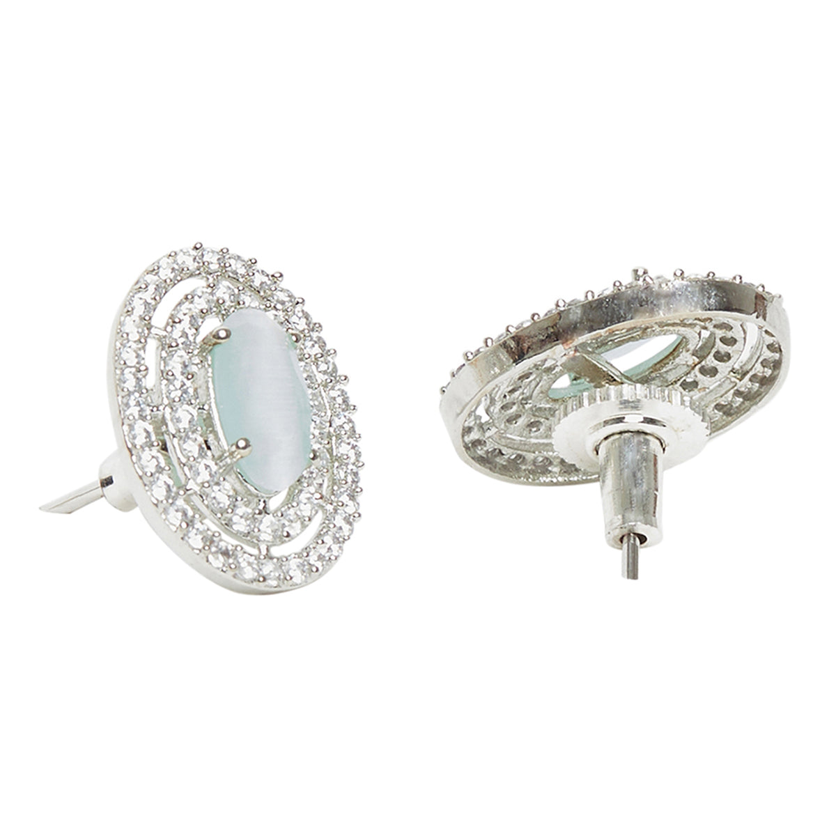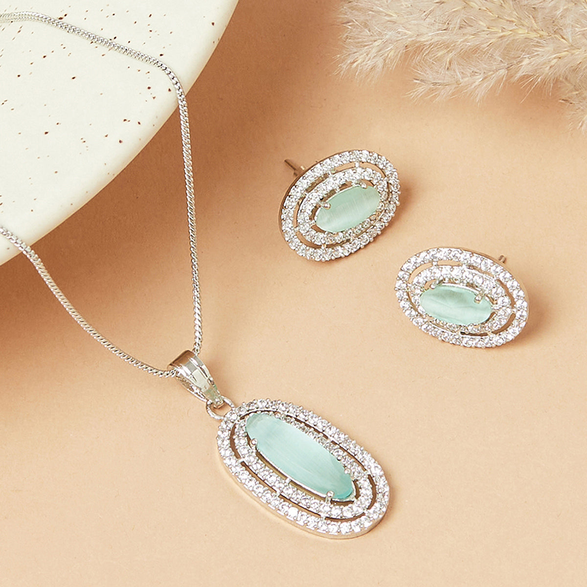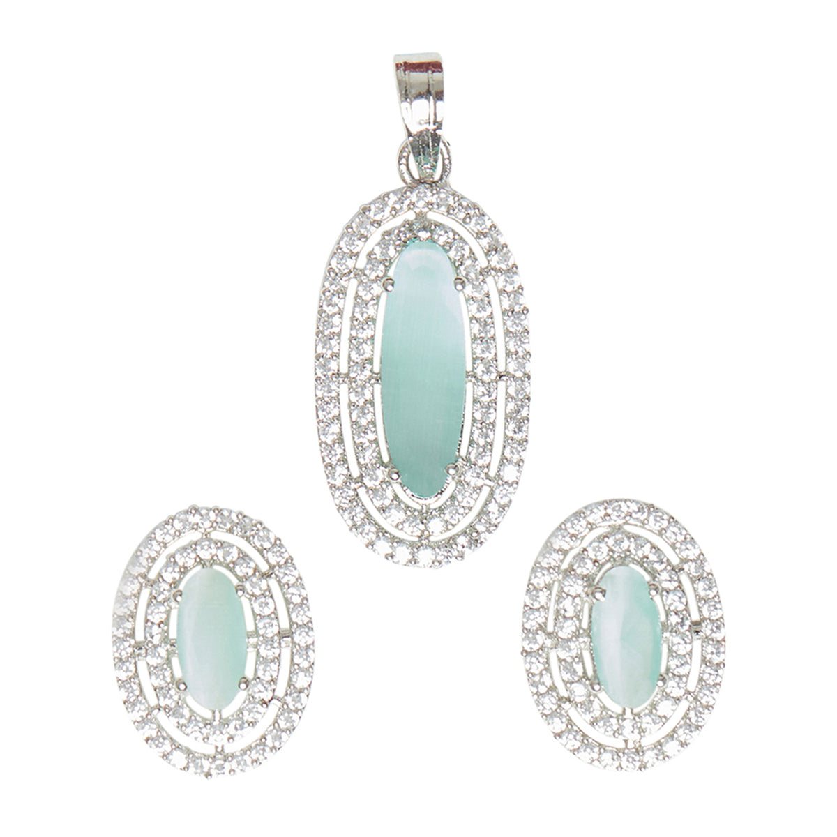 Sparking Elegance launched the wide range of beautiful pendant sets.The work of this silver plated pendant set is done with delicacy. The light mint green CZ stone with brass give blooming look to your loved ones. This eye reliefing ornament for women completes her look and keeps everyone else eyes on her.