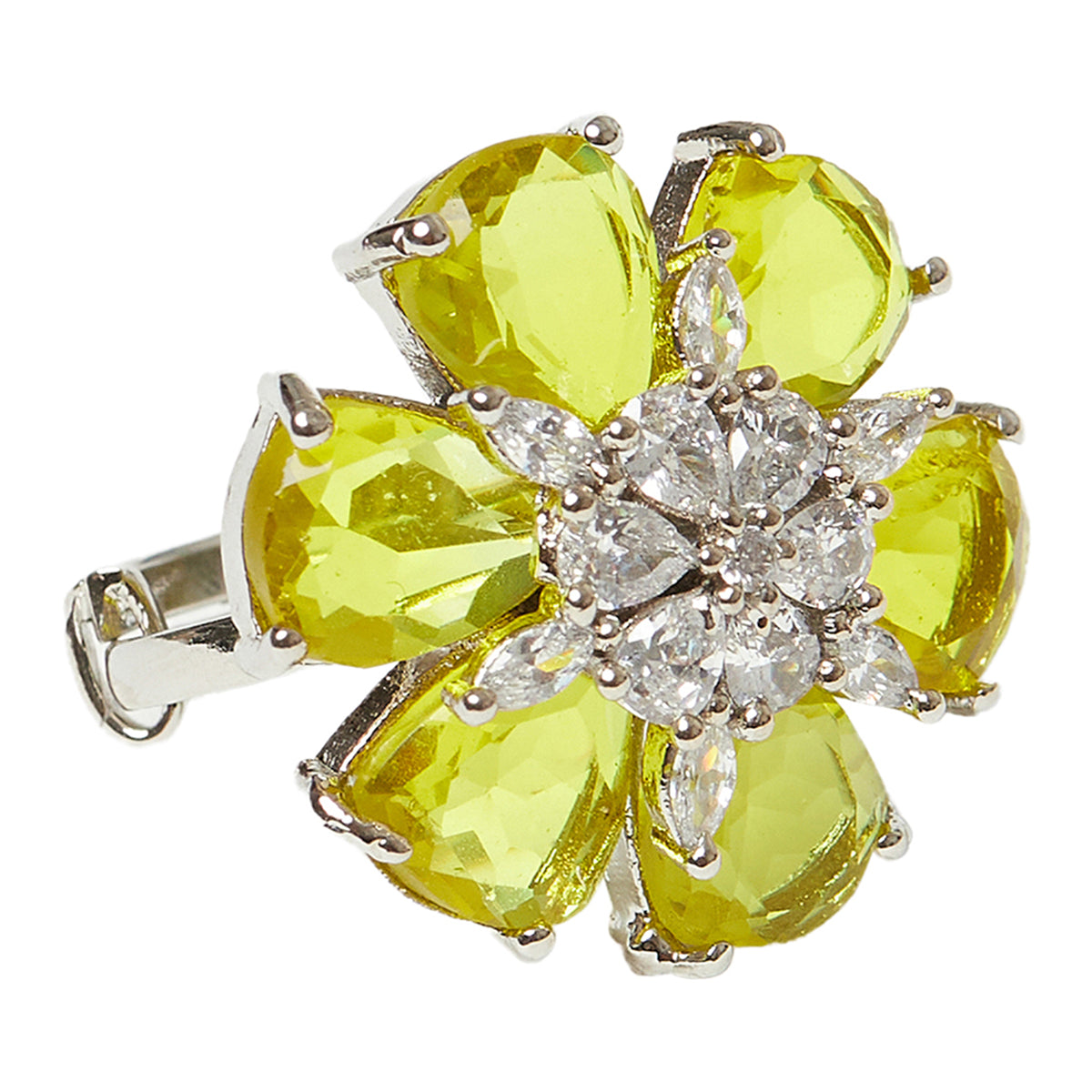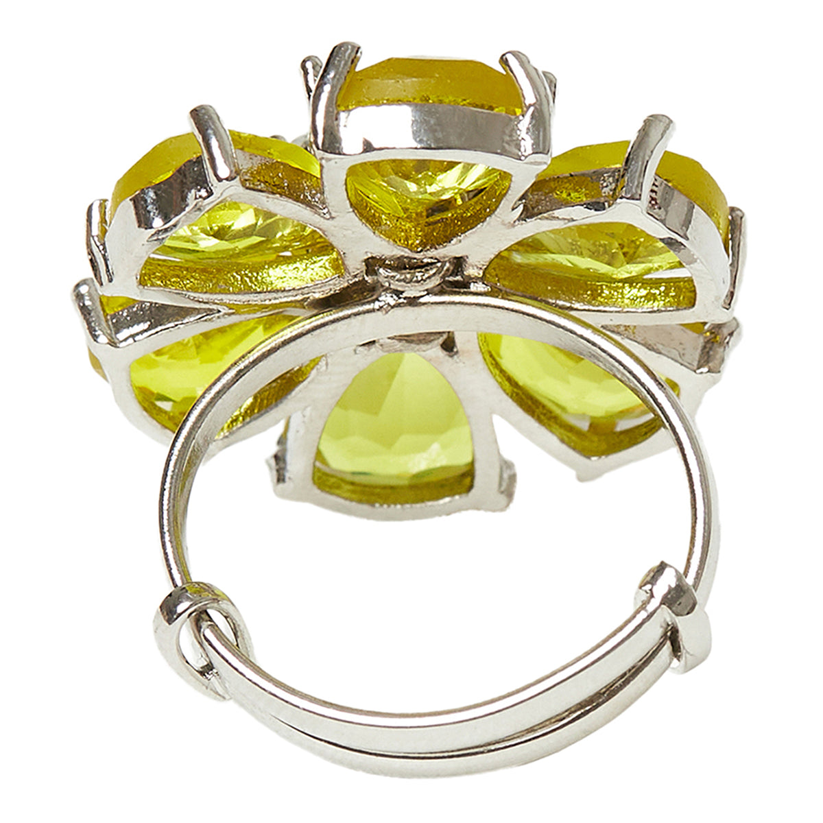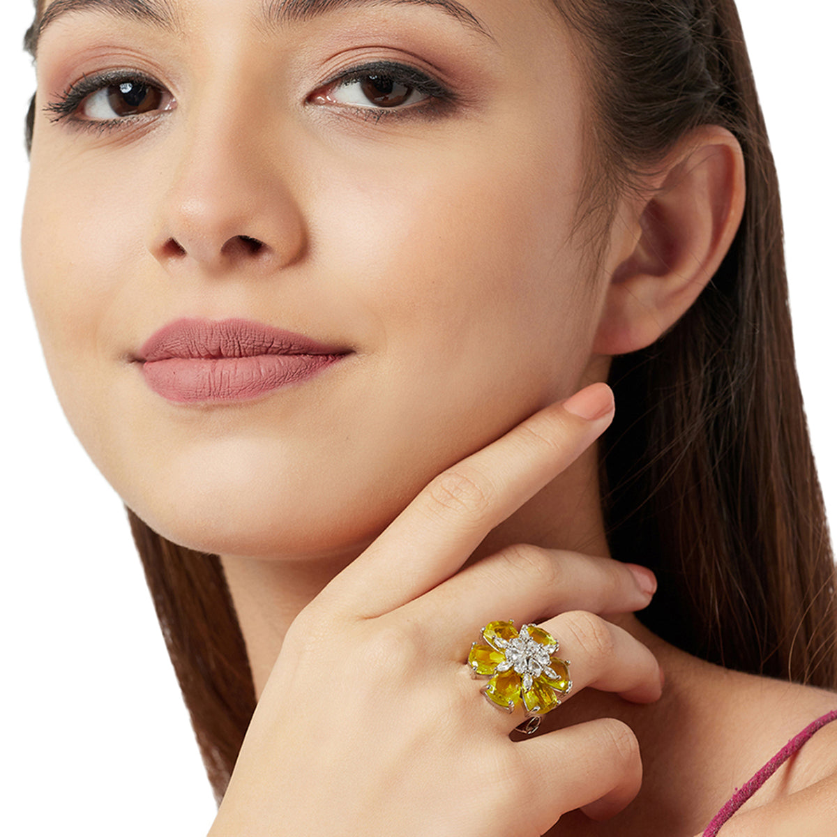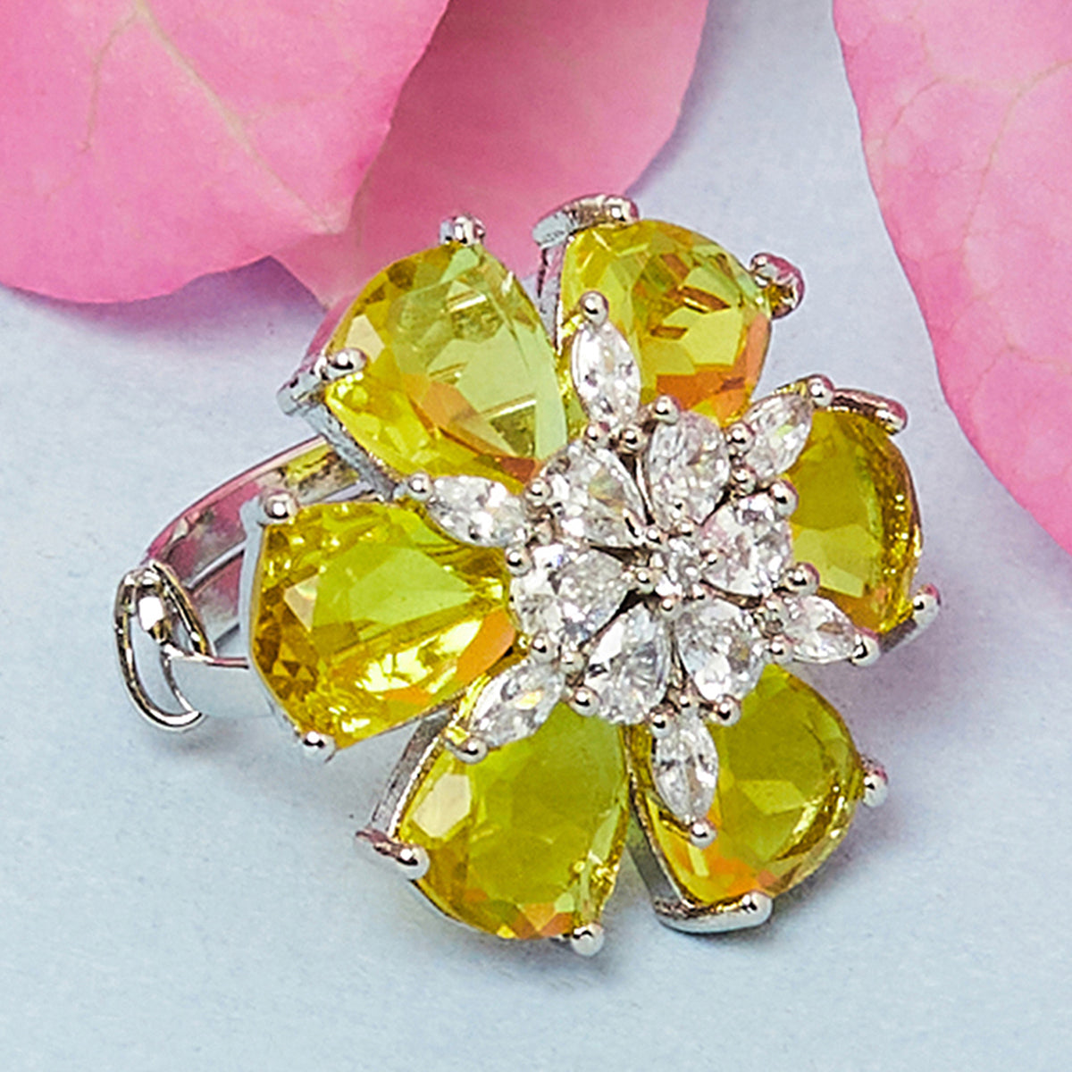 Sparkling Elegance Women's brass material white rhodium plated rings are catching everyone's eyes. The wide variety of different yet unique colored stones makes the ornament stand out from the queue. Rings are a part of women's solah Shringaar. Choosing either sarees or suits, these handcrafted rings with yellow-colored stones go well with your wardrobe.