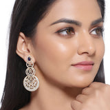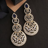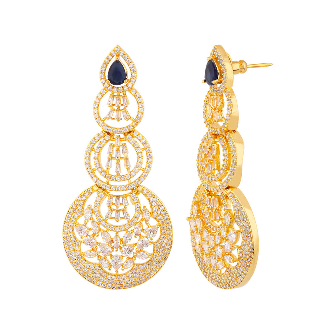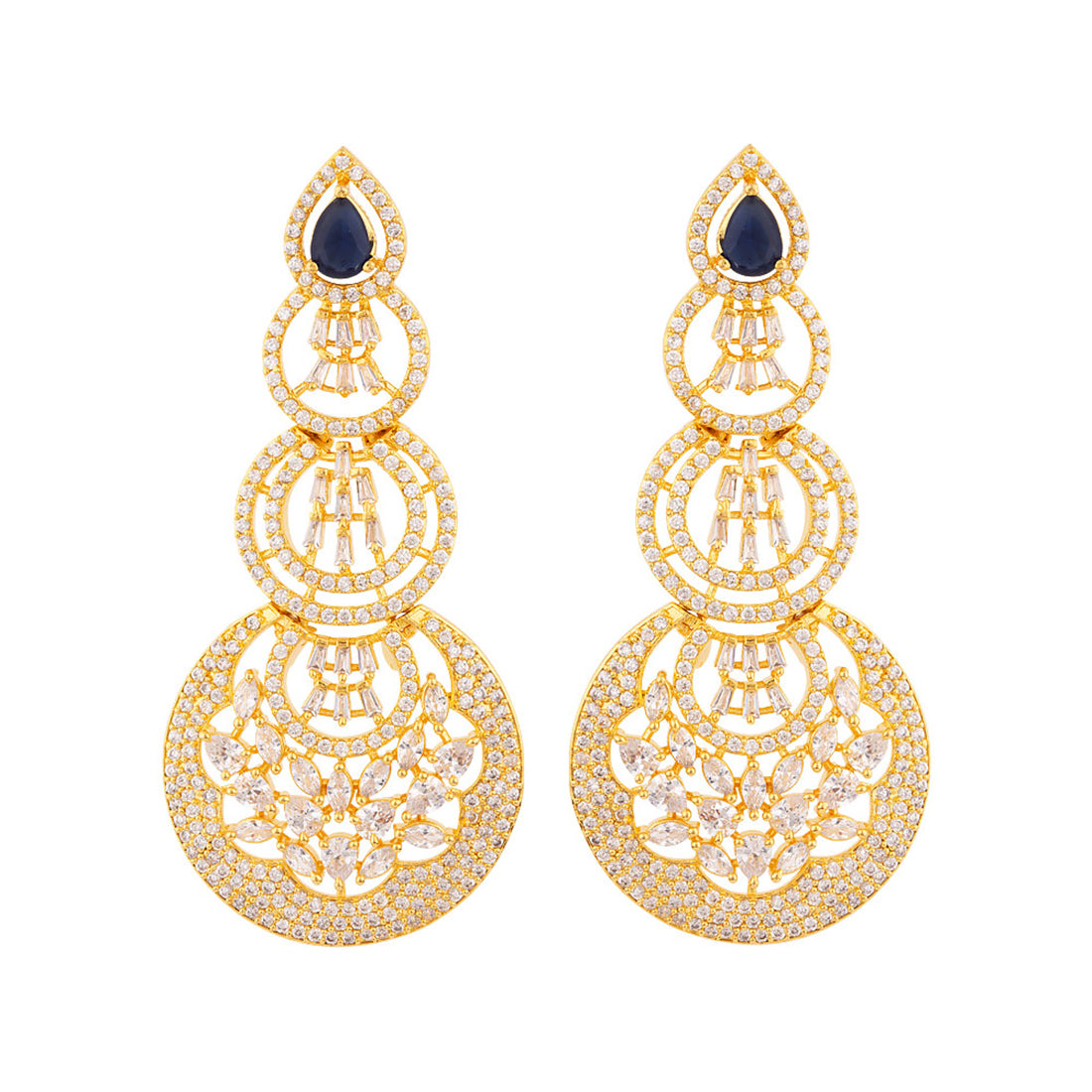 Geometric design layered circles drop earrings made from brass. Yellow gold plated and zircons embellished. Pair with a formal gown.