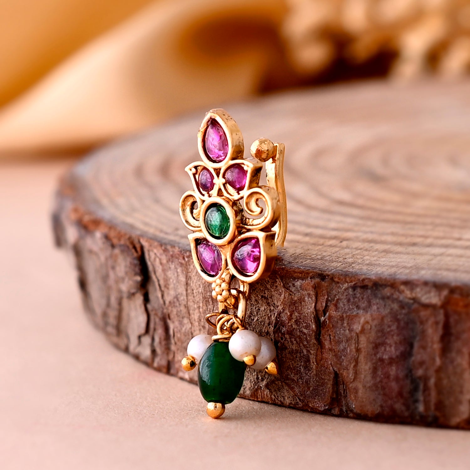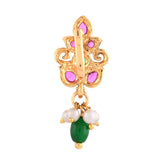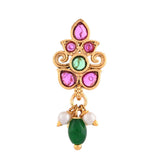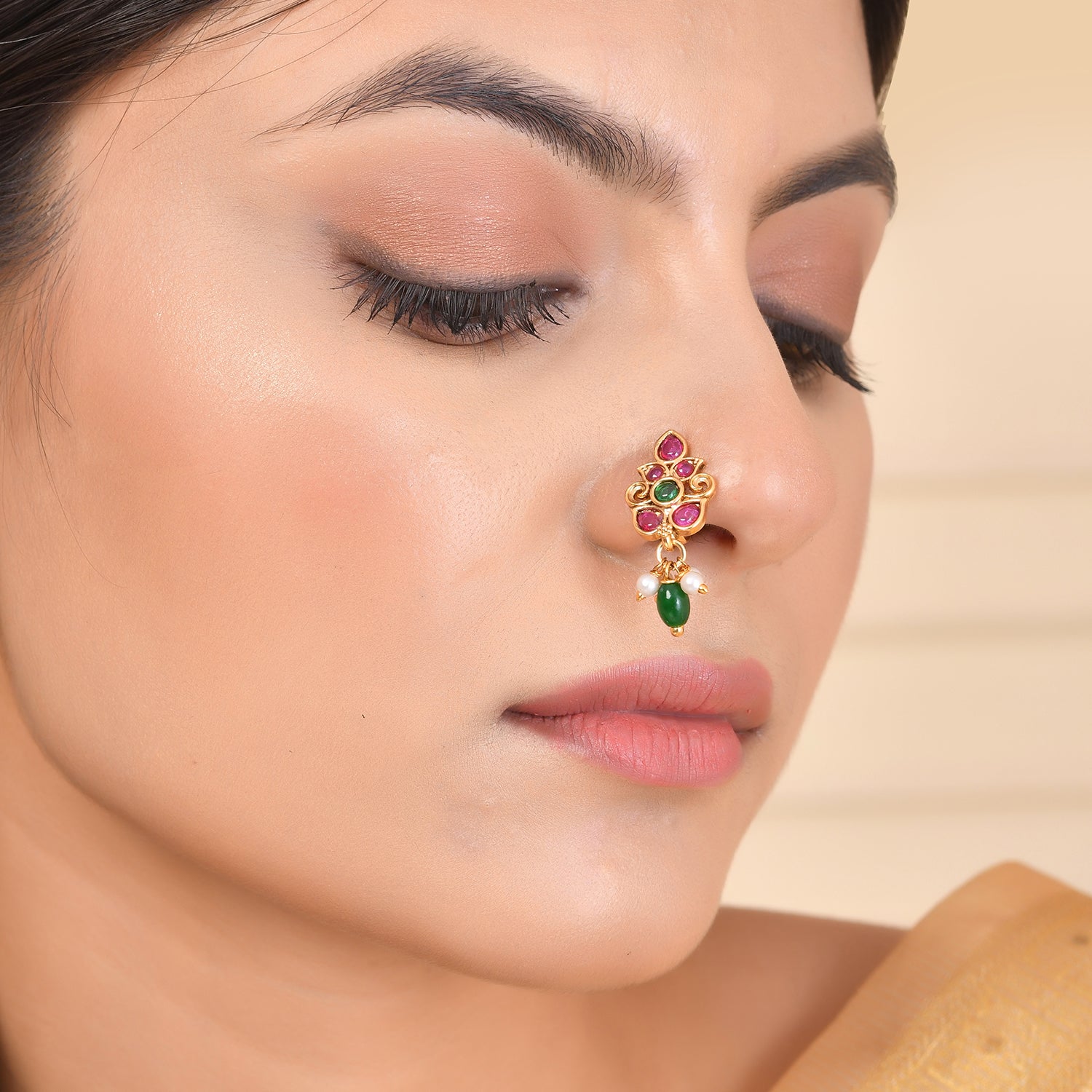 This exquisite nose pin from Voylla is a testament to the timeless elegance of traditional Indian jewelry. Crafted with precision from high-quality brass and adorned with a lustrous gold plating, it seamlessly blends sophistication with cultural heritage. The intricate design draws inspiration from India’s rich past, featuring vibrant kundan stones in pink and green arranged in a symmetrical floral pattern. A delicate pearl dangle adds movement and contrast, while the bold green drop at the base anchors the piece with its deep hue. Whether worn during Diwali, Rakshabandhan, or other festive occasions, this nose pin celebrates craftsmanship and beauty in detail. It’s an ideal gift for women who appreciate both fashion and tradition—be it for your sister, mother, or as a thoughtful present for someone special.