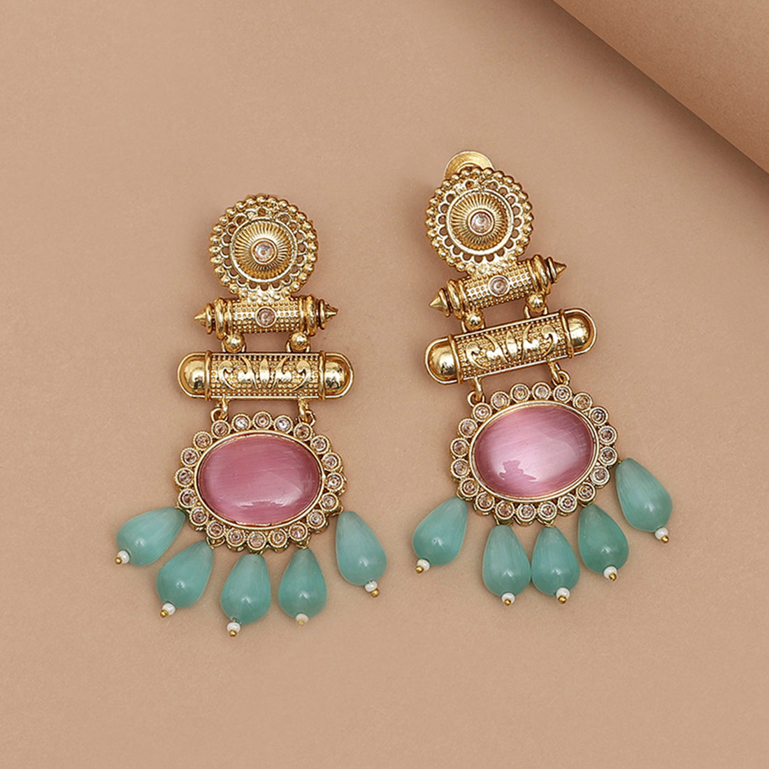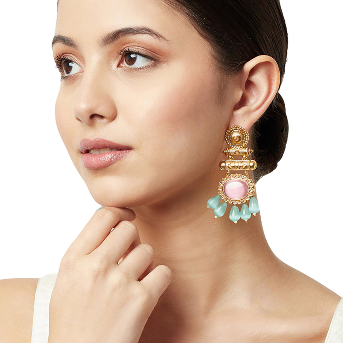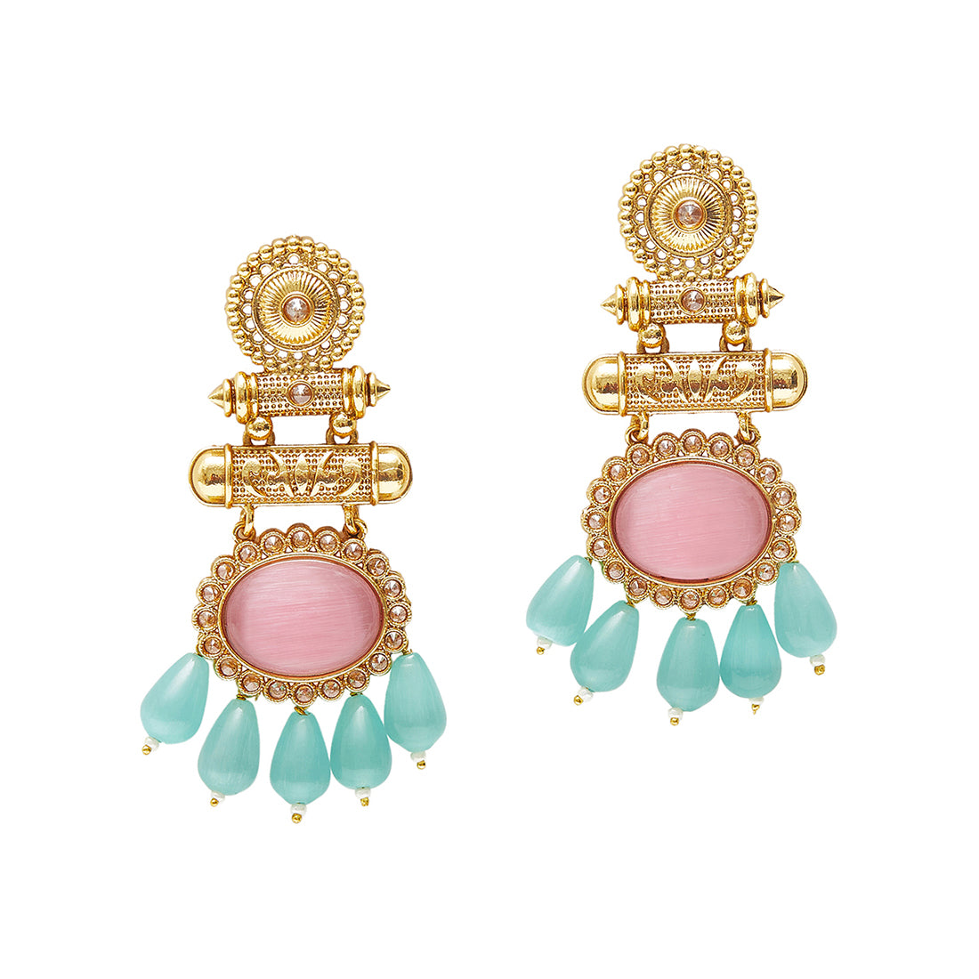 Jewels are one way to flaunt your creative expression! This pair of unique earrings do the same for you too. These gold plate earrings have a beautiful design throughout! The top is adorned by a unique trail-like design, while the bottom closes with dangling tiffany stones. The Centre of these earrings draws major attention because of the pink-colored stone. The gold finish of this pair gives a tantalizing finish that makes you ready for all the events.