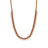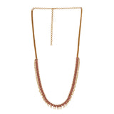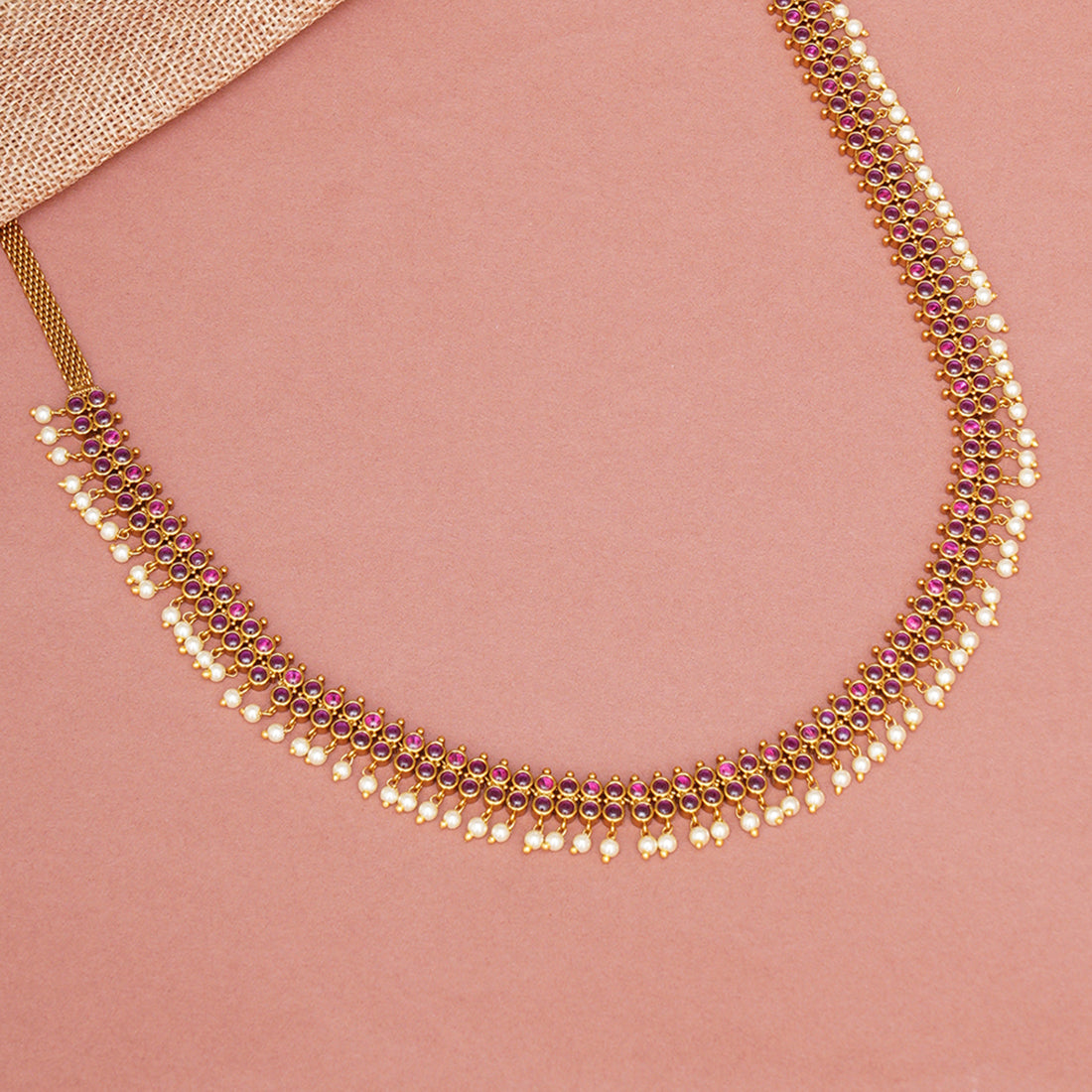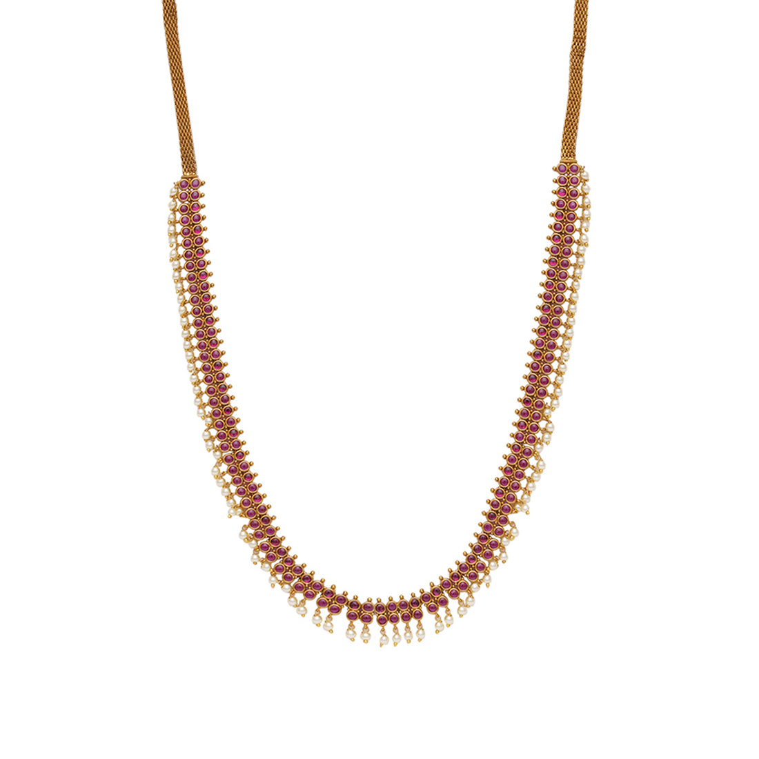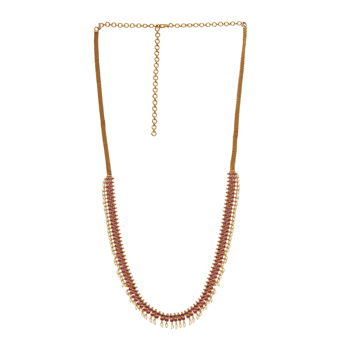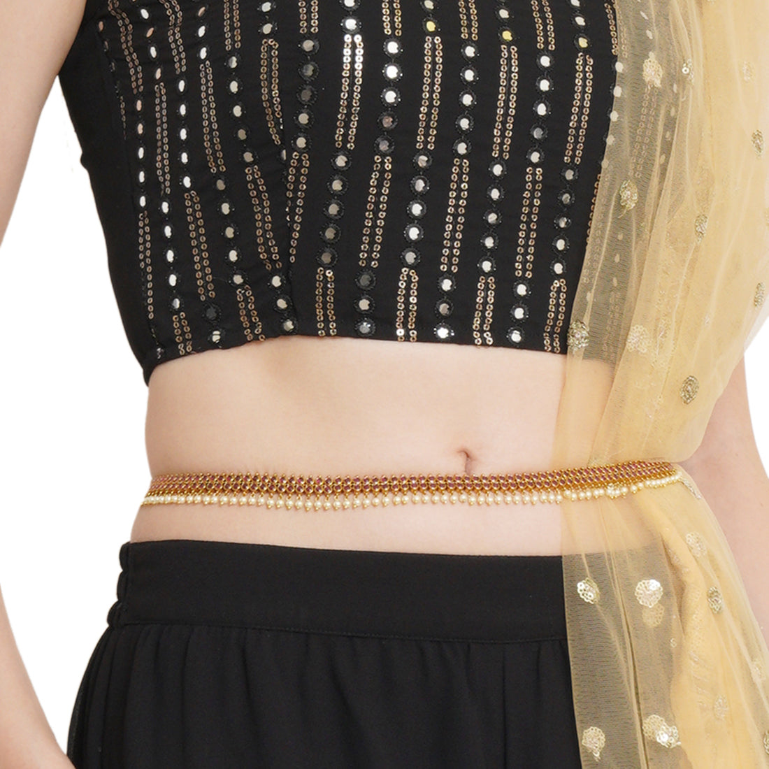 Ethnic design brass kamarband with classic yellow gold plating. Adorned with tiny, round cut CZ gemstones and faux pearls. Pair the kamarband with a traditional silk saree or even a Boho lehenga.