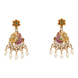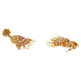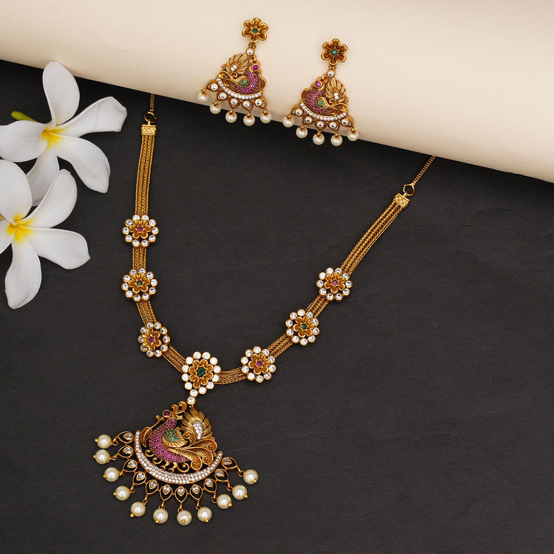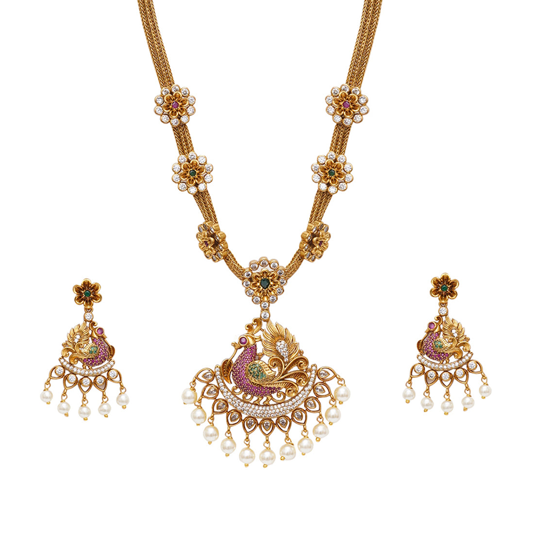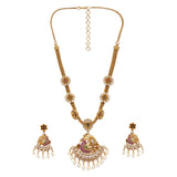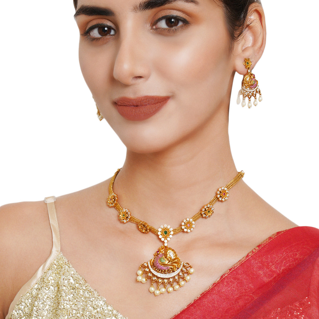 An opulent jewellery set, made from brass and yellow gold plated. Faux pearls and zirconia gemstones have been used in the embellishments of the floral motifs bearing necklace and jhumka earrings. A good match for formal Indian looks.