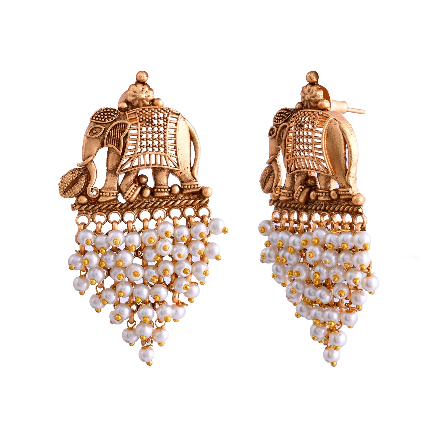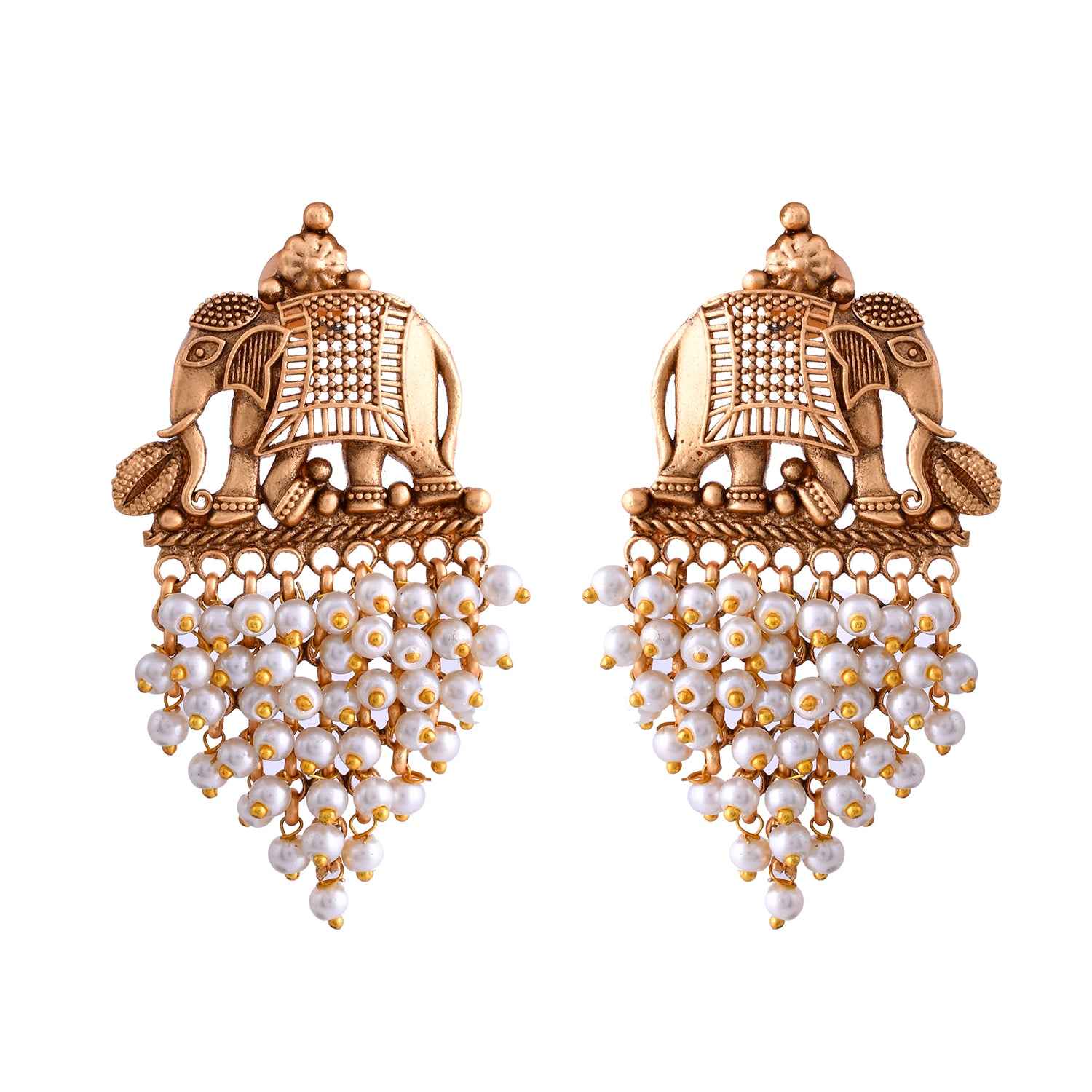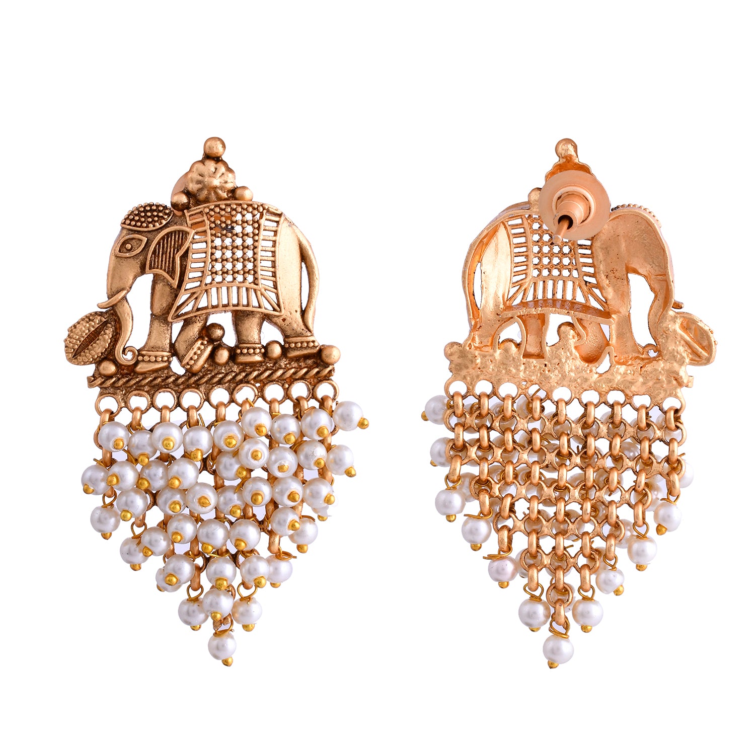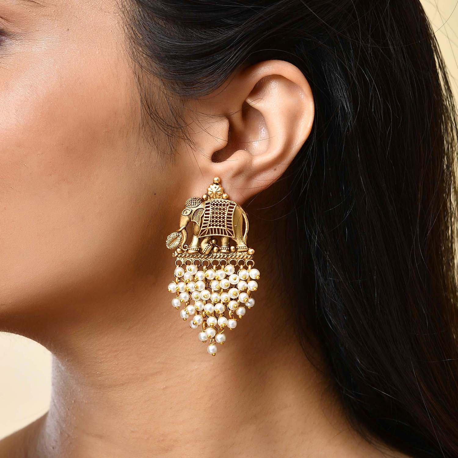 The Voylla Gajapathi Temple Earrings are a stunning piece of jewelry that exudes elegance and tradition. Crafted from high-quality alloy and plated with gold, these earrings feature intricate designs of elephants, symbolizing strength and wisdom, adorned with delicate kundan work. The cascading pearls add a touch of sophistication, making them perfect for festive occasions, weddings, and pooja ceremonies. These statement earrings are part of the Gold Opulence collection, designed to bring a royal and ethnic charm to any outfit. Ideal for gifting on occasions like Diwali, Rakshabandhan, Valentine's Day, Christmas, and New Year, these earrings are a thoughtful present for mothers, wives, girlfriends, sisters, and lovers. Style them with traditional South Indian attire or contemporary festive wear to make a lasting impression.
