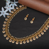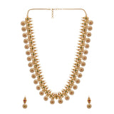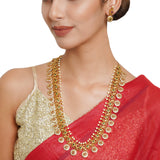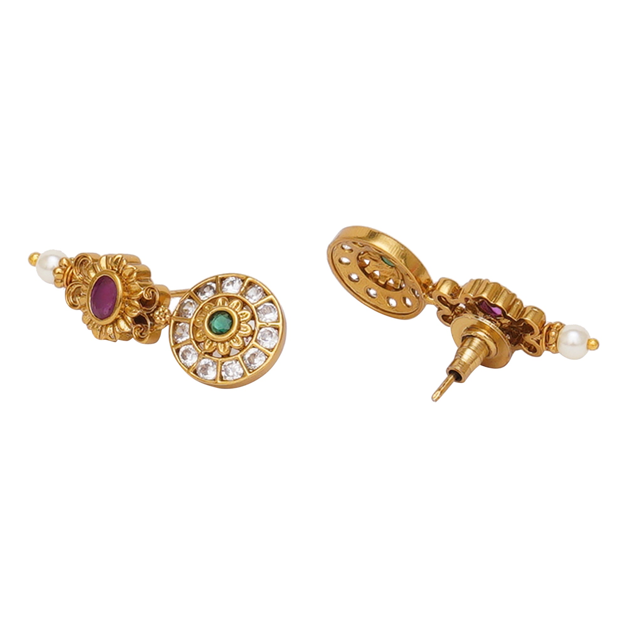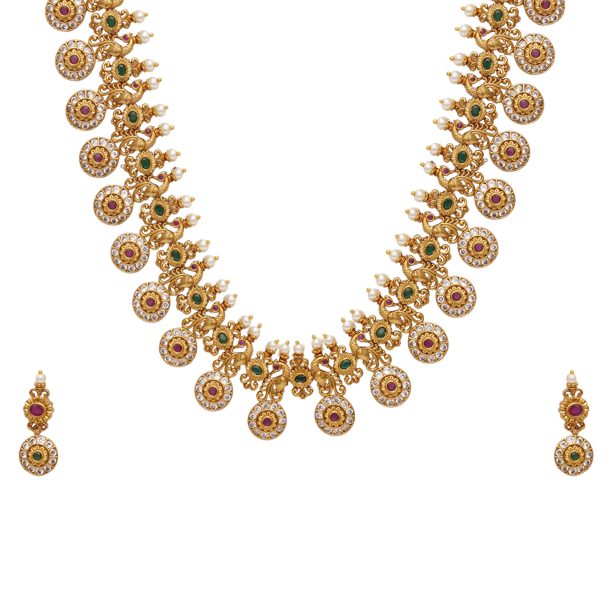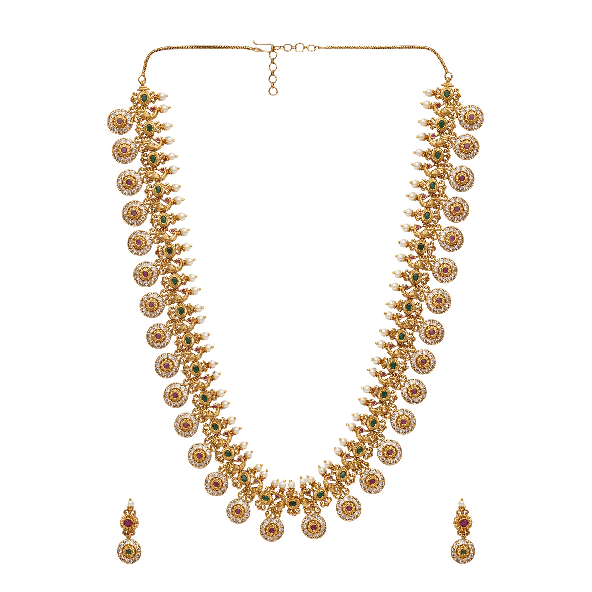 An opulent and eye-catching jewellery set, made from brass and yellow gold plated. The long necklace and drop earrings have been heavily embellished with zirconia gemstones and white faux pearls. Pair the set with a traditional silk saree or even bridal outfits.